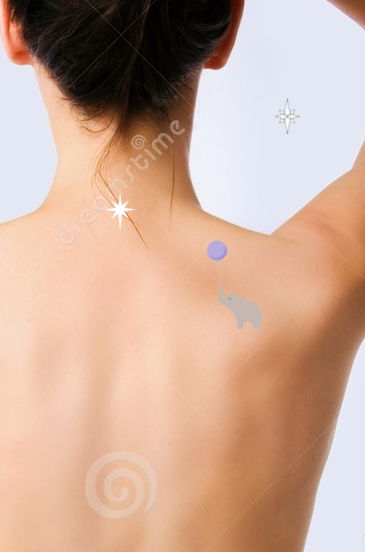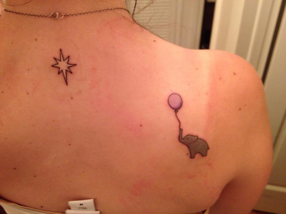 I've got my appointment set for August 24.  A friend of mine advised me that when getting a tattoo, her rule of thumb is to plan out everything about it (image, location, colors, etc) and then wait for a year.  If you change anything, the year starts over.  Once you're happy with the idea for a year, you'll be happy with the tattoo.  So I made my rendering and picked my location, and then I was pregnant with my rainbow, so it got pushed back a bit more.  But now that we've welcomed him, I'm all set to get my Ellie tattoo.  I'm getting an elephant with a balloon on my shoulder blade and a star at the base of my neck.  The third pic is an image of a back I pulled off of google to show the artist placement.