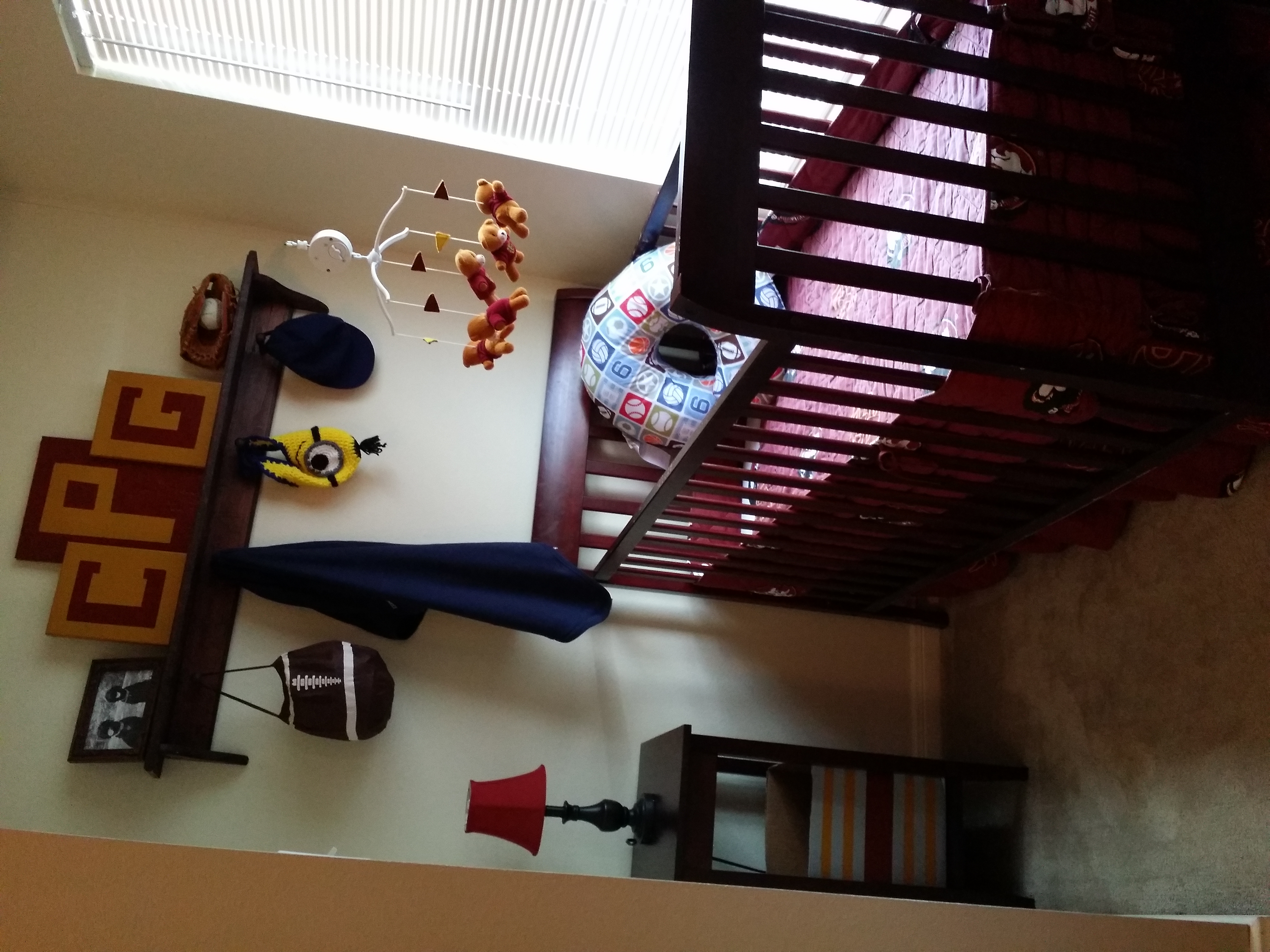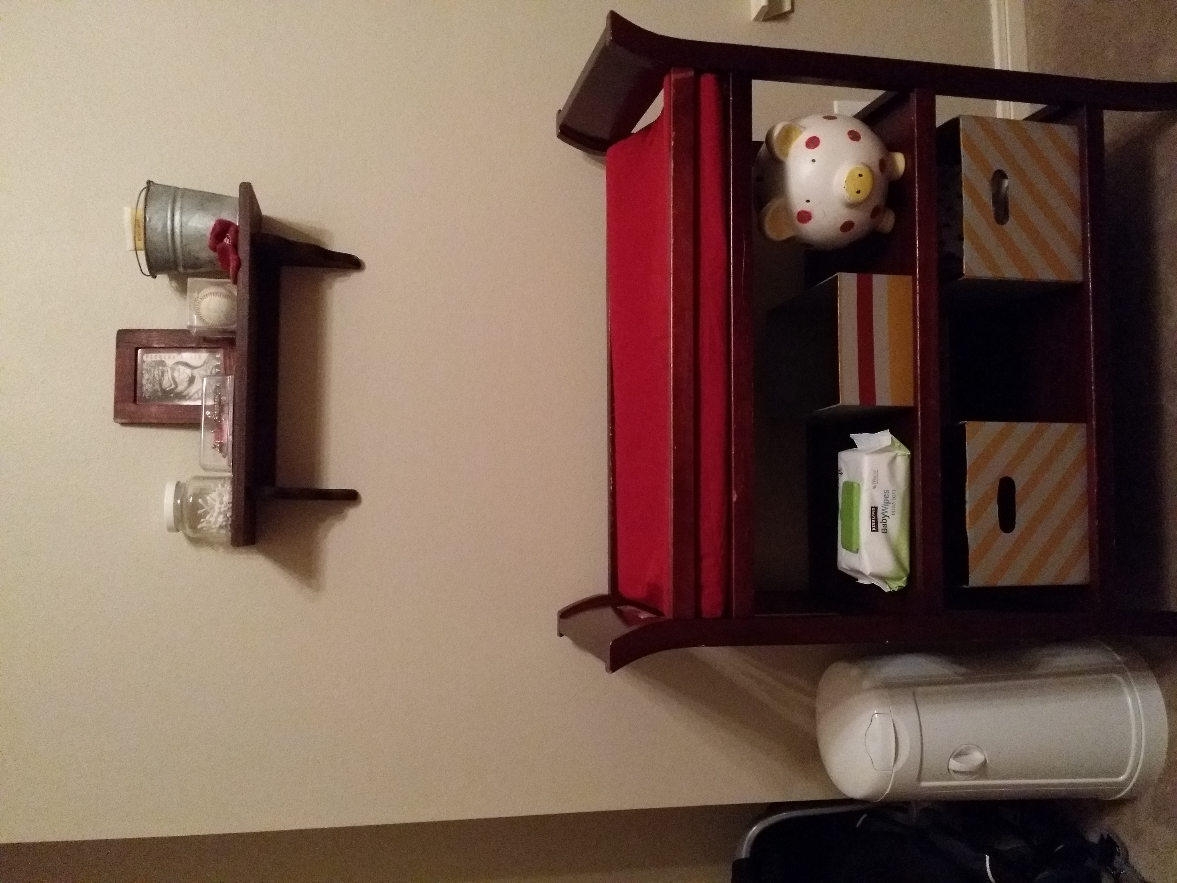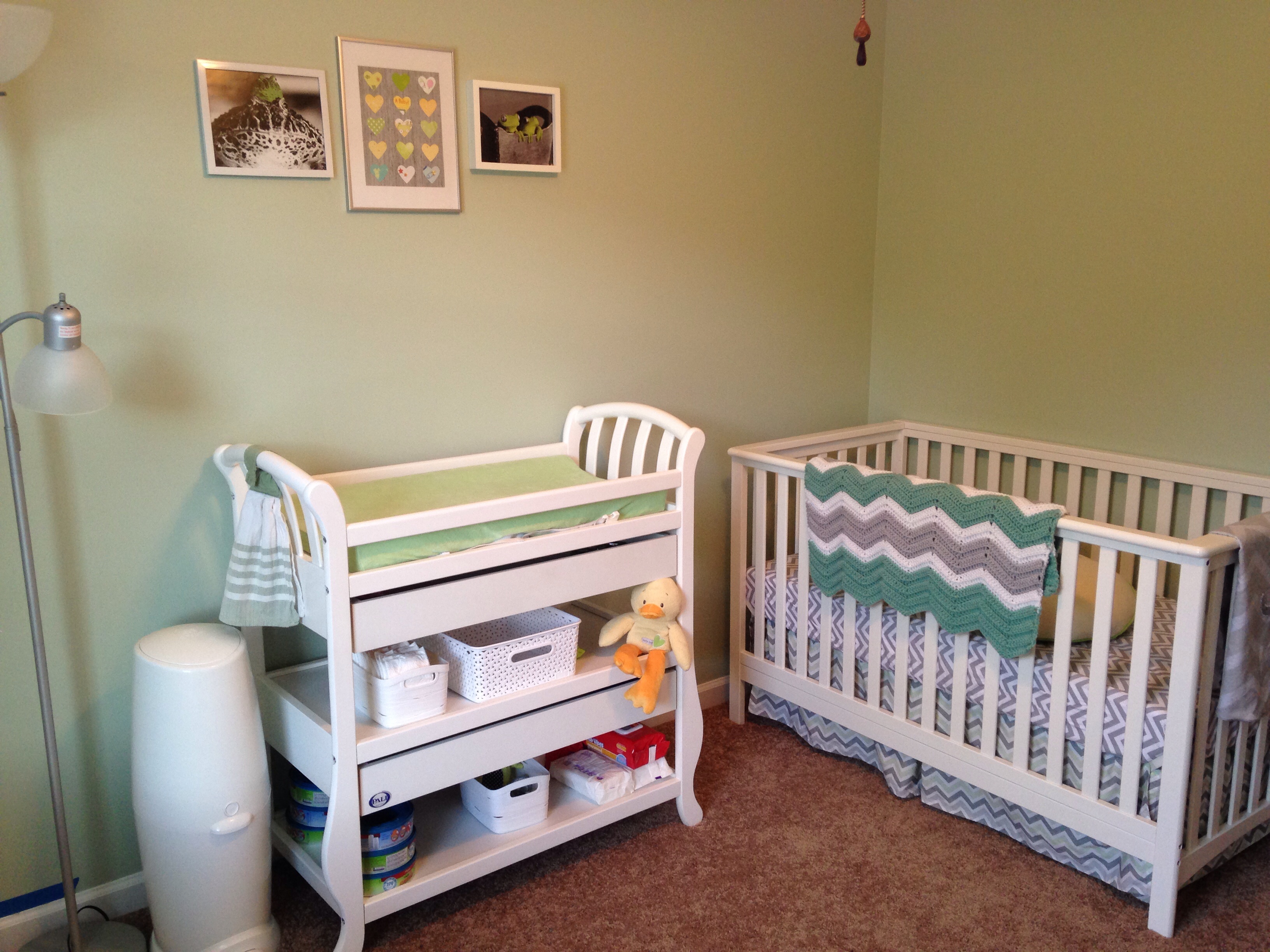 I am pretty much done with his nook in our room. I need to get curtains, picture frame for the small table next to the crib, finish painting another storage box for the changing table, and then stock the changing table and I think we will be done.