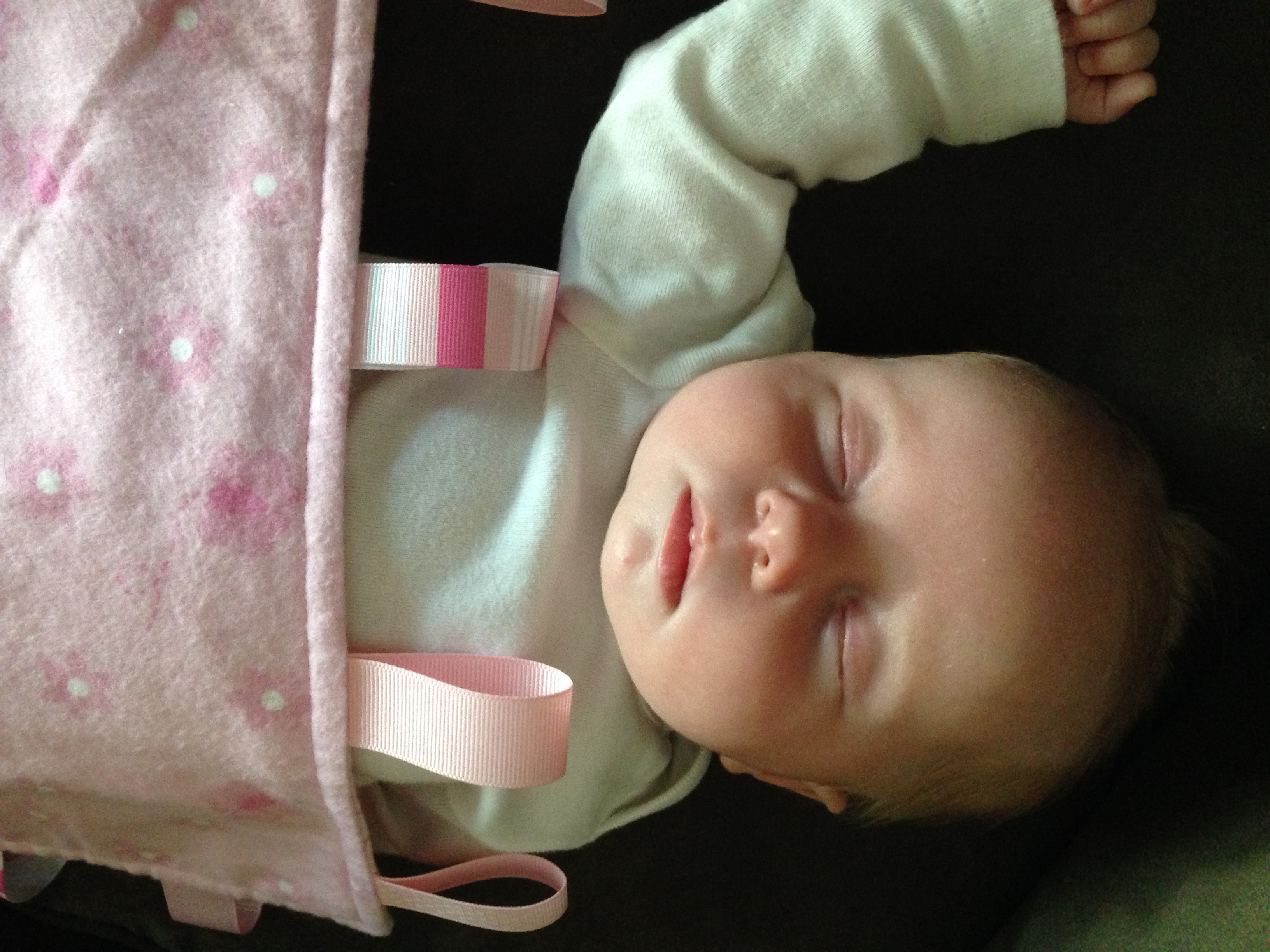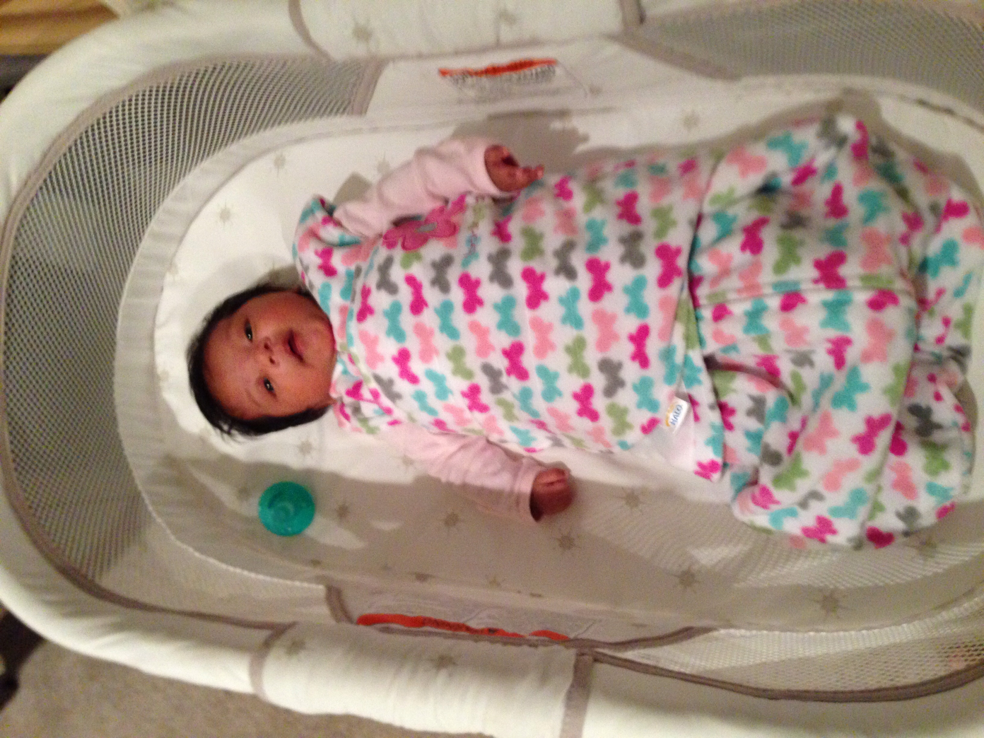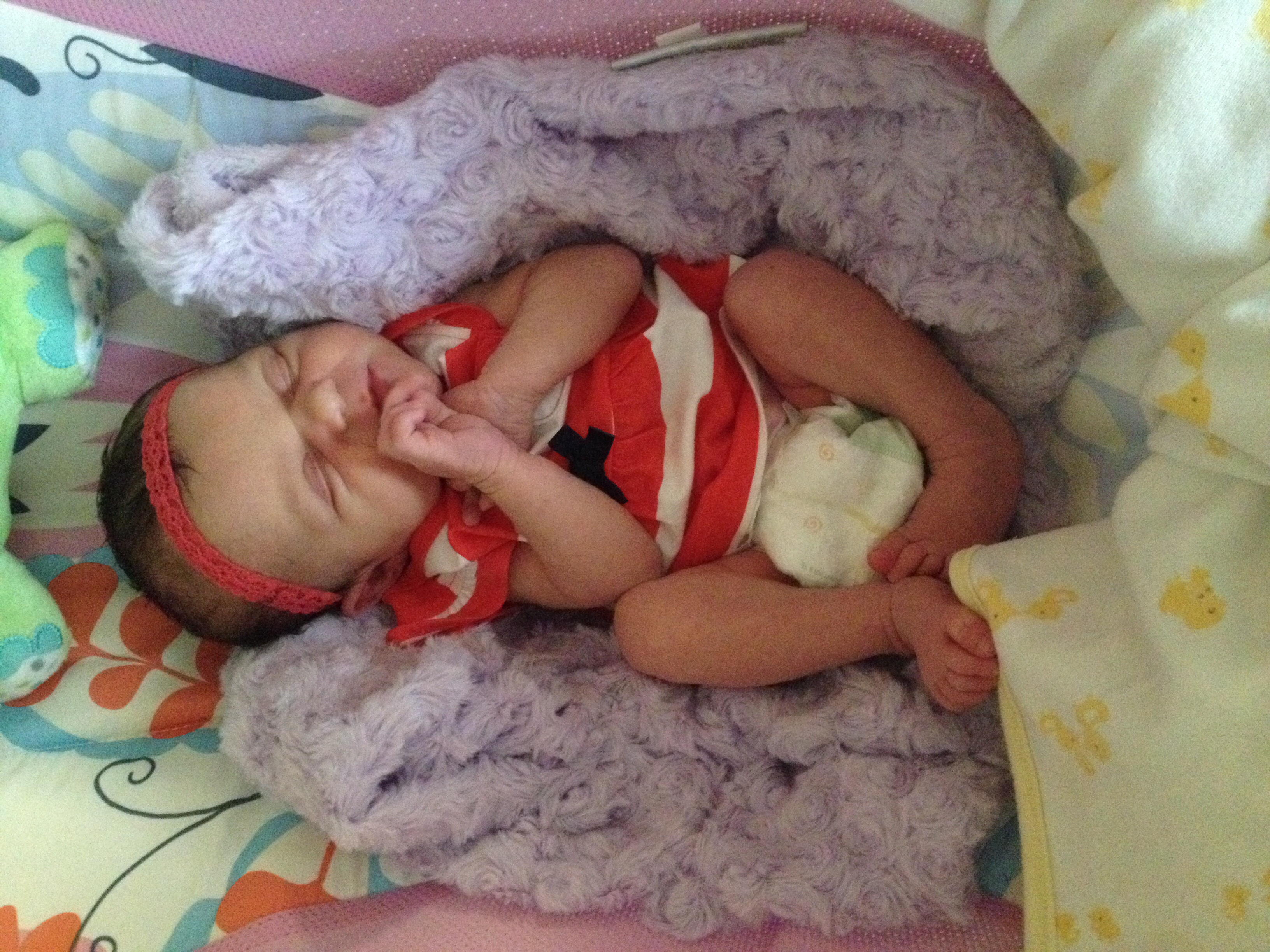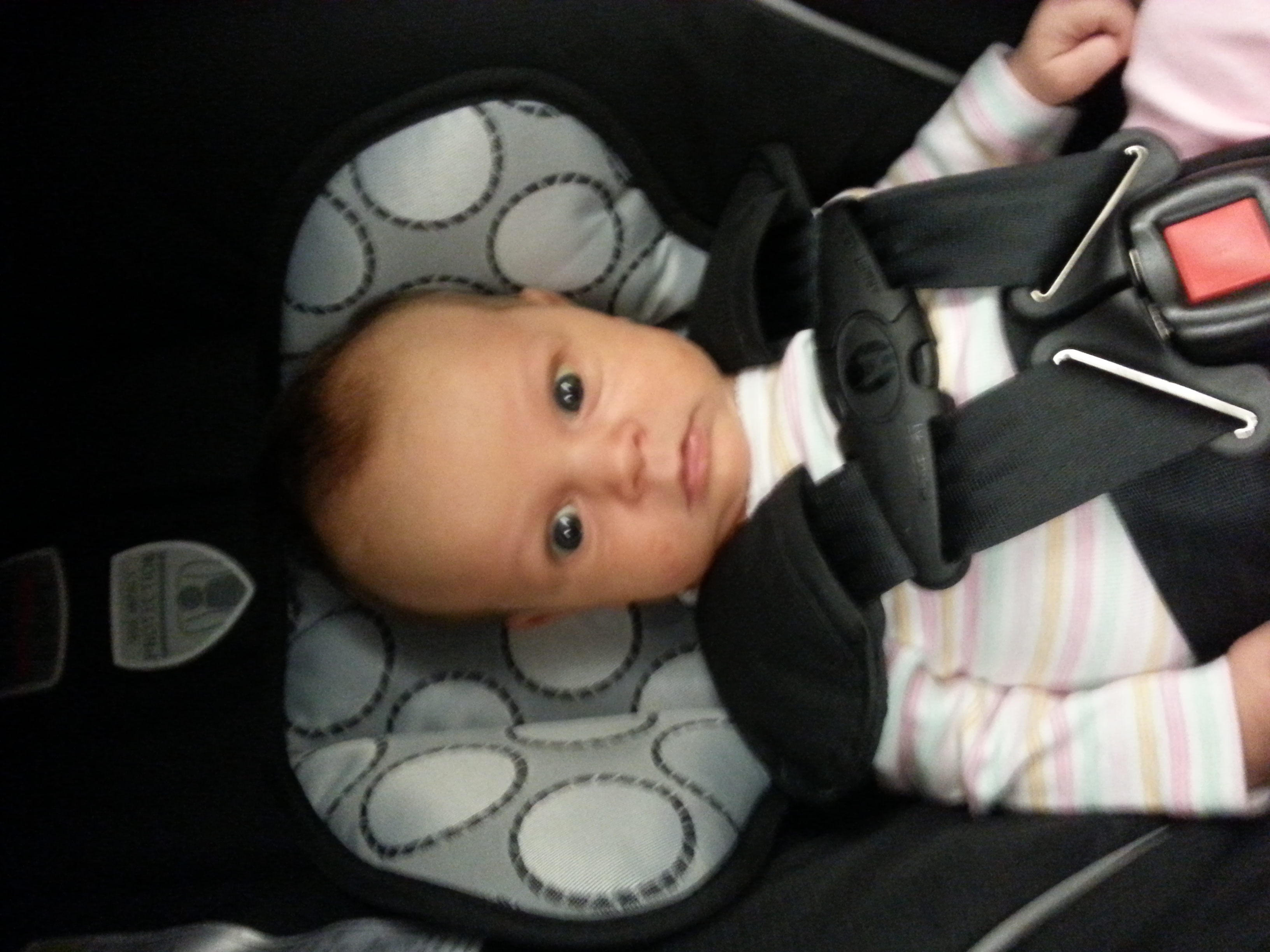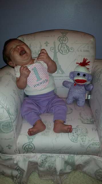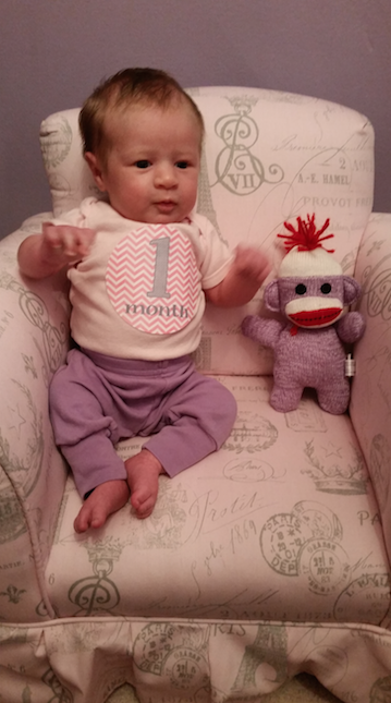 Carina turned one month old yesterday! She did pretty well with her little photo shoot... except that she hates the flash. She also had her one month checkup yesterday. She's a tiny peanut - her weight is up more than a pound from birth, but she still only weighs 7lbs 8oz. Her height is only in the first percentile (0-3 month clothes are still huge on her!). She cried for her entire appointment but found her thumb at the end, so I snapped a cute picture.