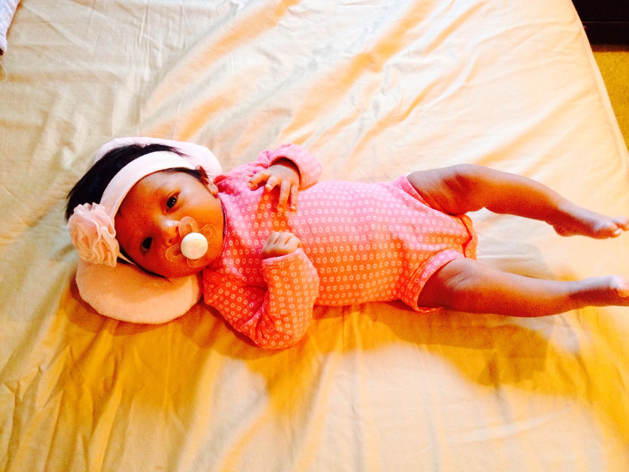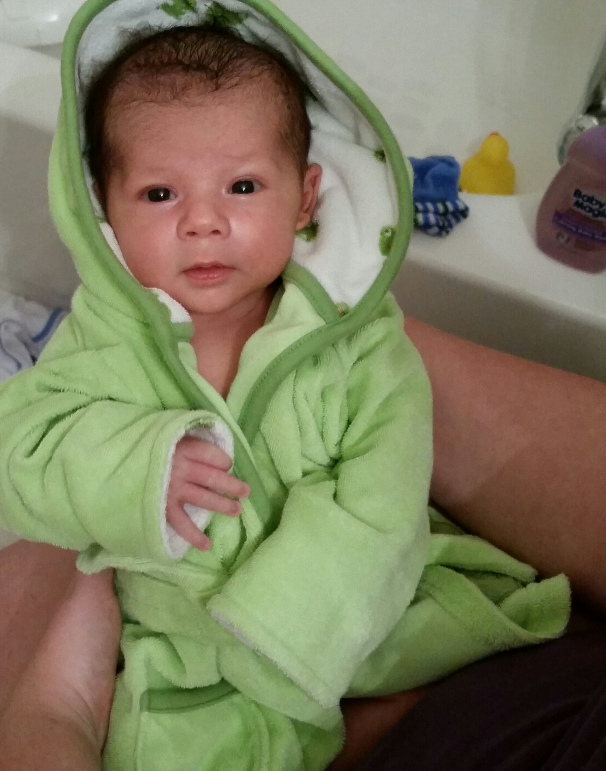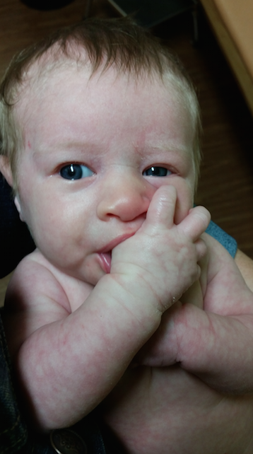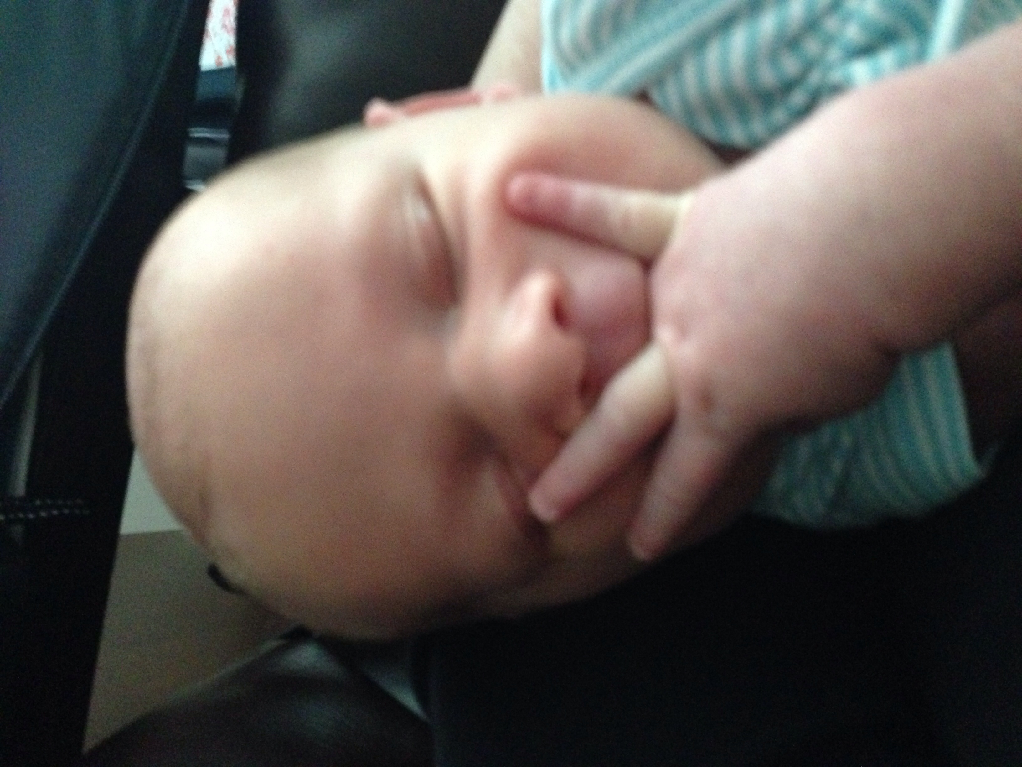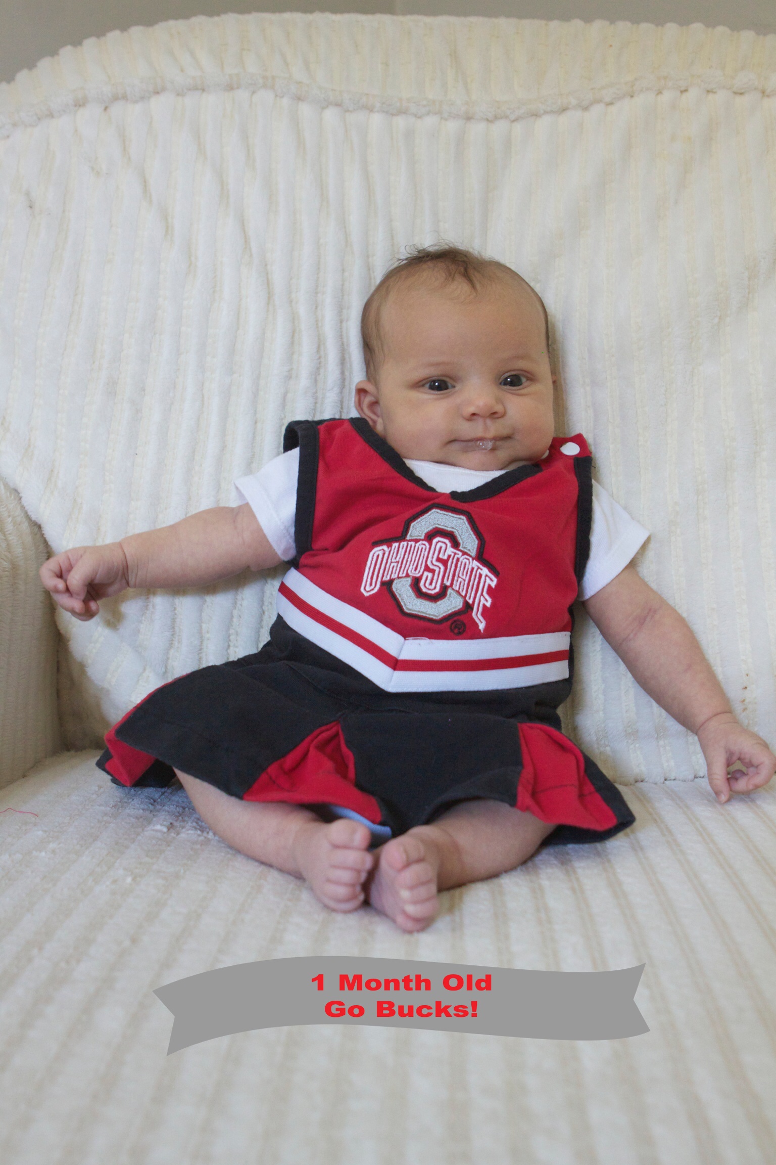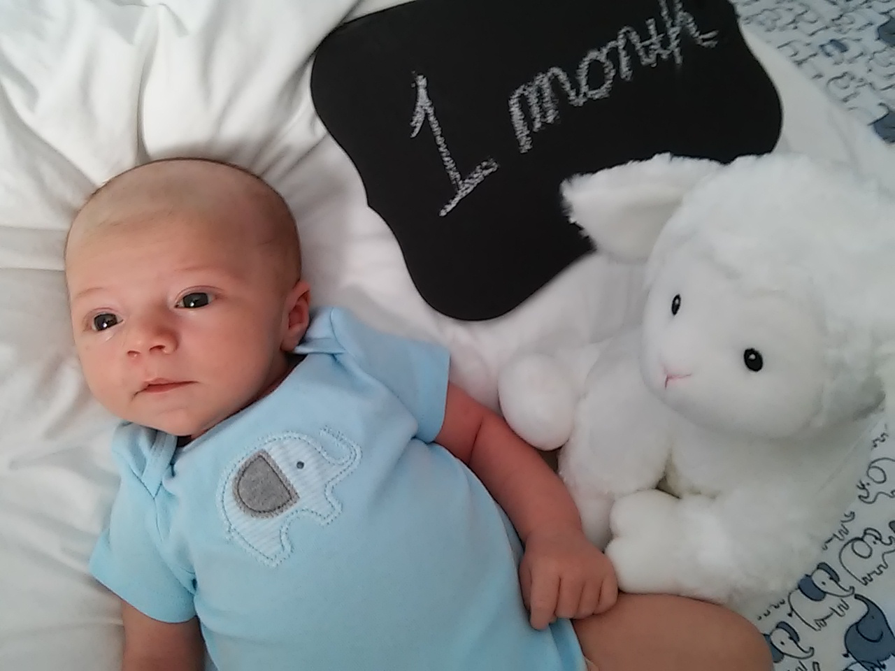 Carina turned one month old yesterday! She did pretty well with her little photo shoot... except that she hates the flash. She also had her one month checkup yesterday. She's a tiny peanut - her weight is up more than a pound from birth, but she still only weighs 7lbs 8oz. Her height is only in the first percentile (0-3 month clothes are still huge on her!). She cried for her entire appointment but found her thumb at the end, so I snapped a cute picture.