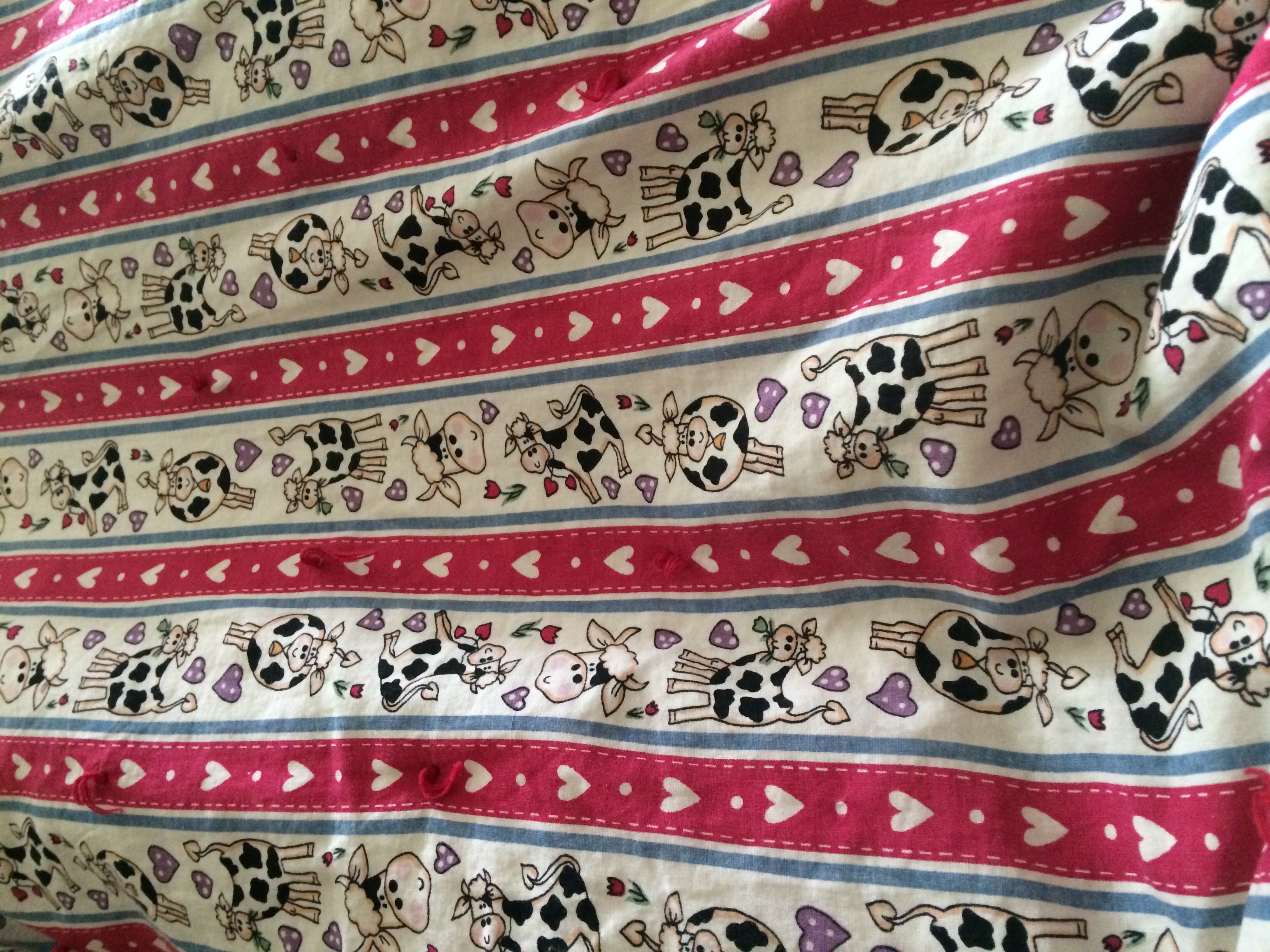 My grandma's best friend made me a blanket before I was ever born, and I still use it, I'm actually using it right now. Lol. And I know this is probably totally unrealistic and a really dumb thought, but anyone know if there's any way I can describe a fabric on a site or something and find it somewhere? I am 19 years old, so obviously it's an old fabric. But I want to have hope that maybe a miracle will happen and I will find it somewhere? I want to make Hadley and Grayson one out of the same fabric. Well not me, but the woman who made mine said that she would make them if I found it. She said that she doesn't remember where she got it from. If not, she said that she has an idea in mind. I just love love love this blanket. Its adorable, I guess because I love cows. But it would just make me so excited for the girls to have the same blanket, because I take mine with me everywhere still. Vacations and such. I know it's probably highly unlikely, but I figured someone might have an idea and that it's worth a shot!