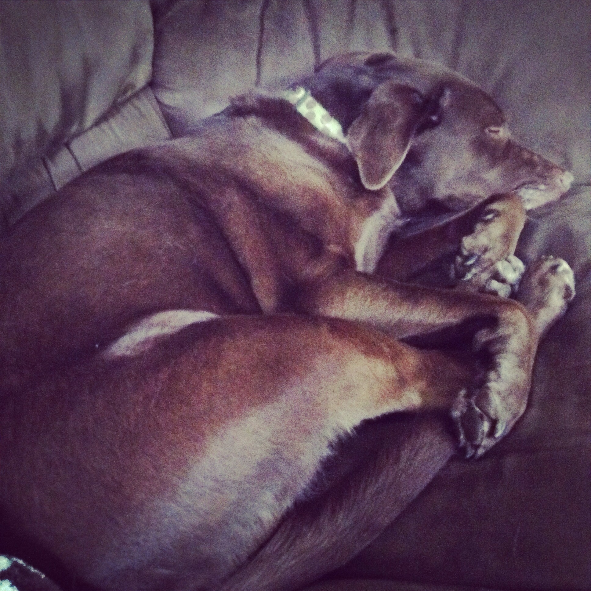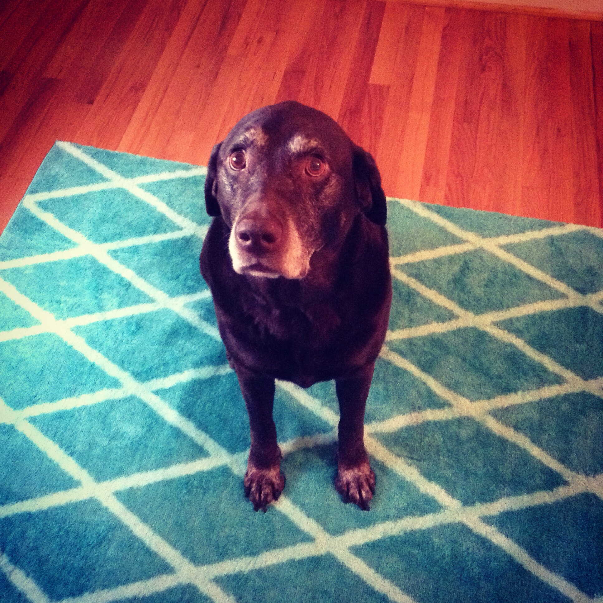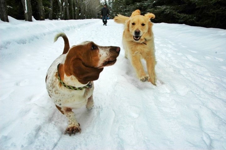 Here are our Gromit (basset hound) and Claire (golden retriever) about to run over me in the snow a few years ago.
