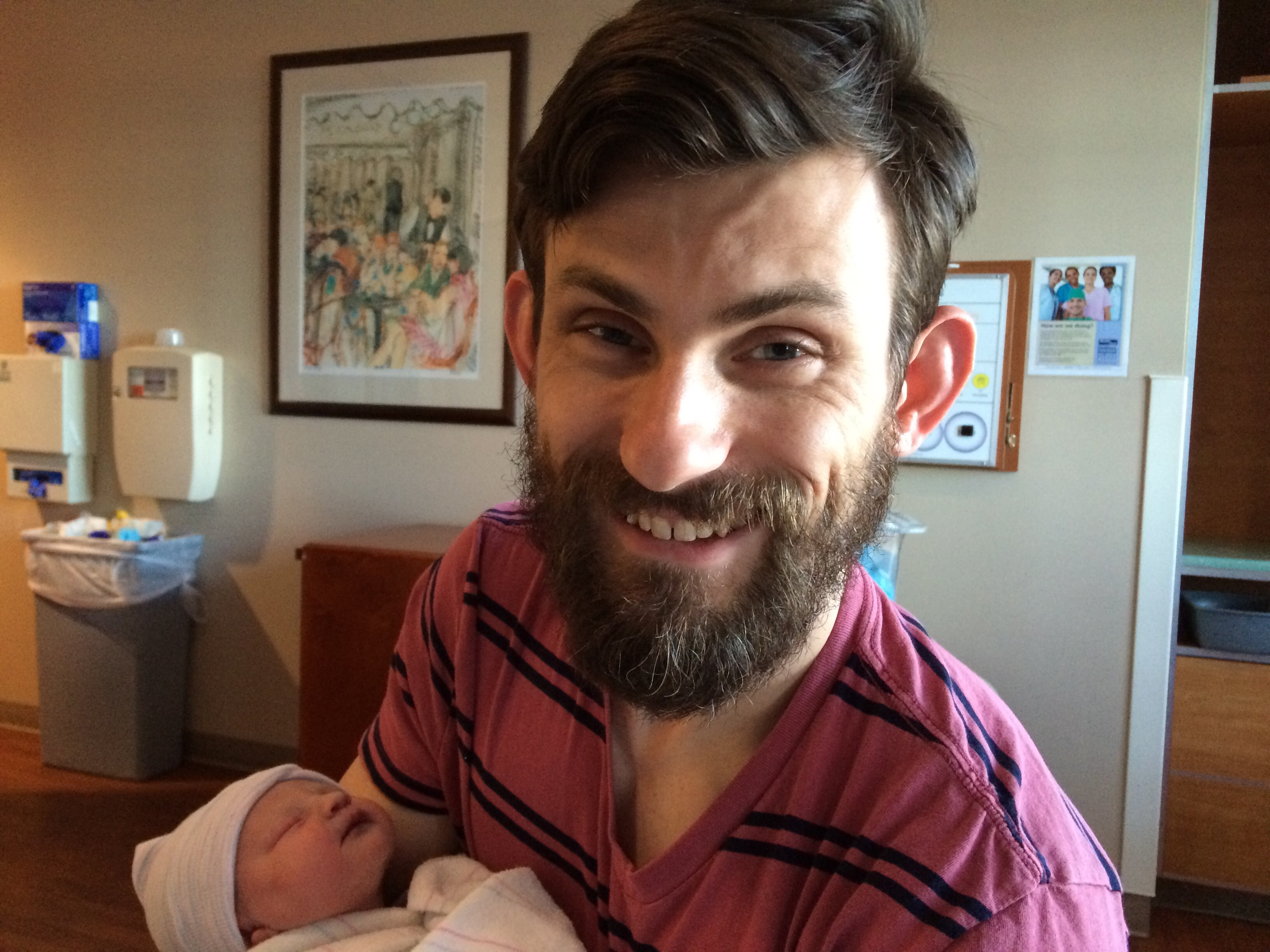 I was able to talk through the pain and didn't have any other symptoms, so we were in the triage waiting room for a half-hour or so while they got another patient settled and another checked in. I was called back and was asked to change into a gown and collect a urine sample. When I stood up in the bathroom, a puddle of blood splashed on the floor and just kept flowing. We went from a "boring" pregnancy to an emergency section due to placenta abruption in no time flat, meeting our daughter within an hour!