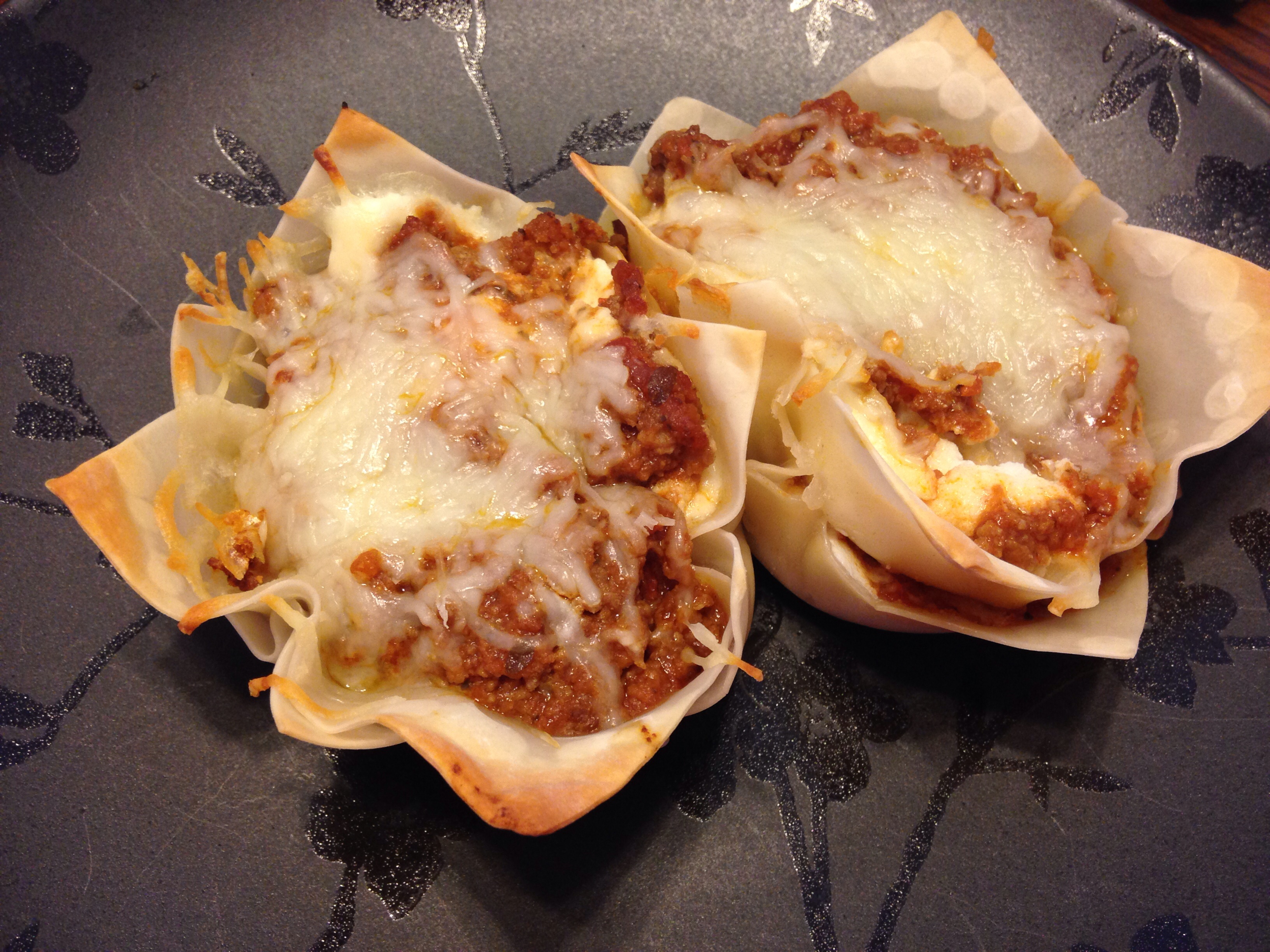 Layer order: wonton, mozzarella, meat sauce, ricotta, more mozzarella repeat once more.