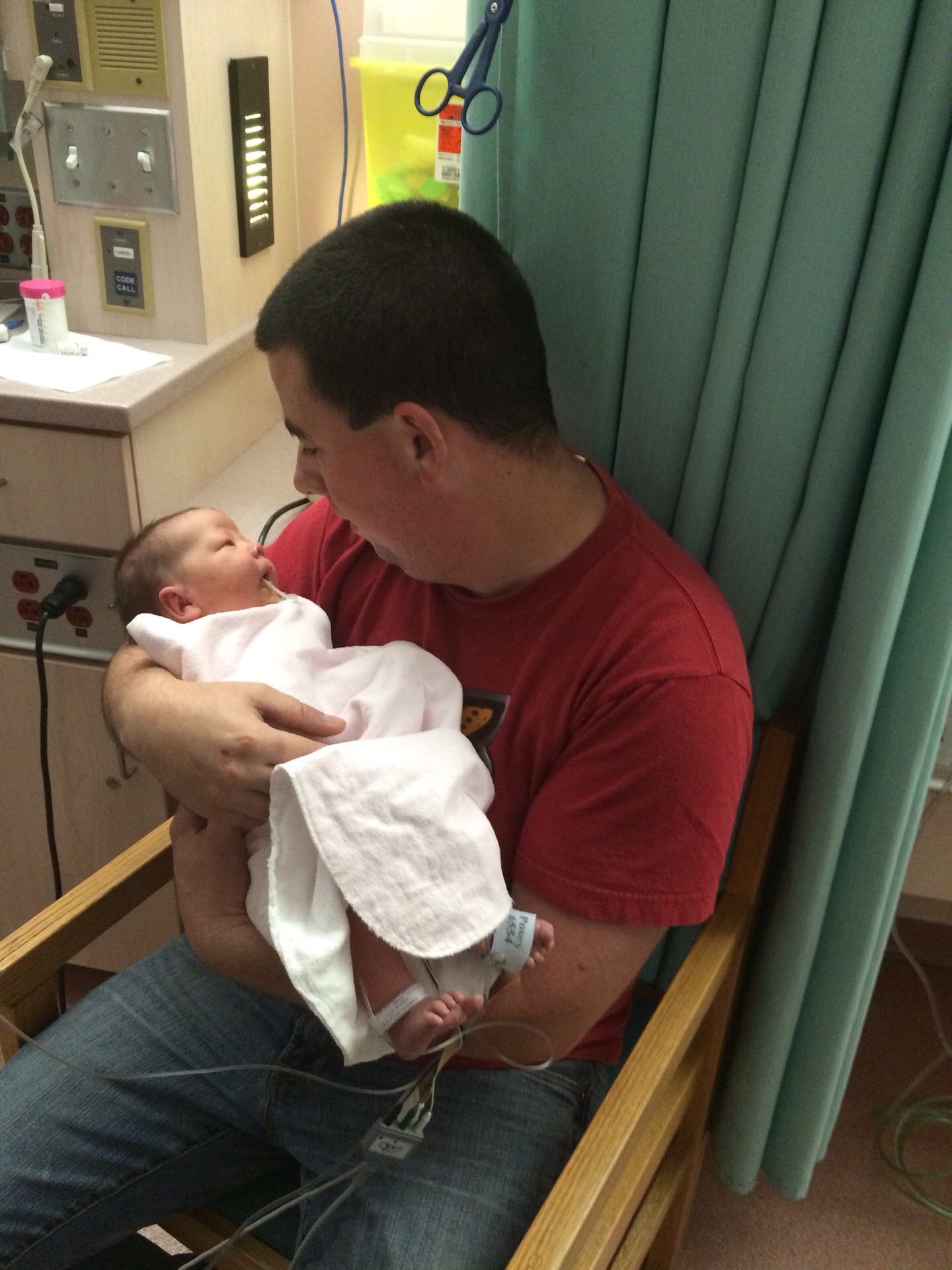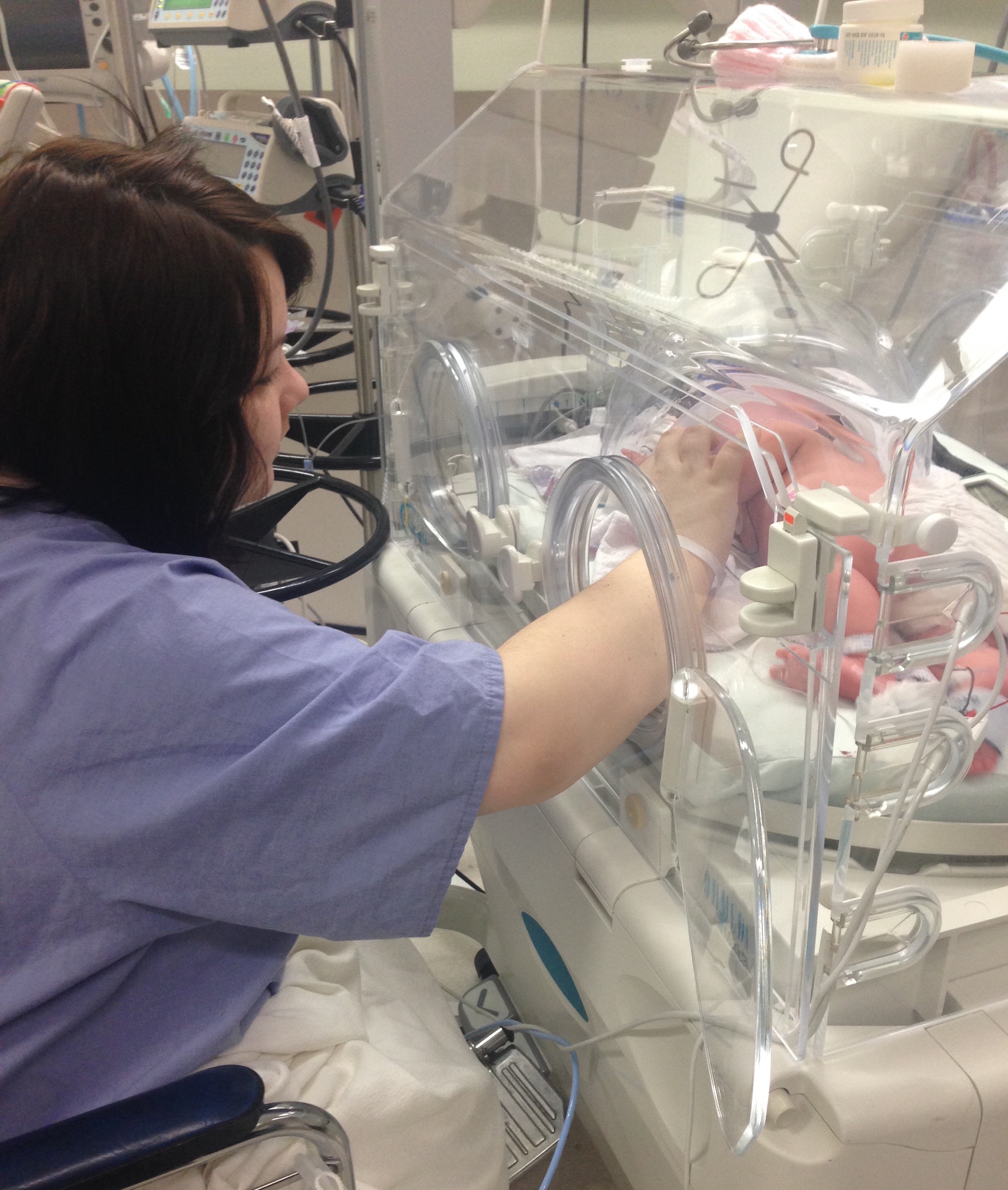 The hospital I delivered at doesn't have a NICU, and that is where she needed to be. They told me they would be sending her on a helicopter sometime that night. I still had hardly seen her, and hadn't held her. She was on oxygen, and hooked up to a lot of monitors. At 11:30 PM they finally let me go see her. I managed to get out of bed, and they wheeled me out to the nursery. I still couldn't hold her. I could only look at her and touch her. At 5 the next morning, they took her off in the helicopter. Her dad went on to the city (3 hours away) as soon as he found out they were taking her, he got in at 2 AM before they had even taken the baby. He waited for her at the hospital. She got in at 6 AM.