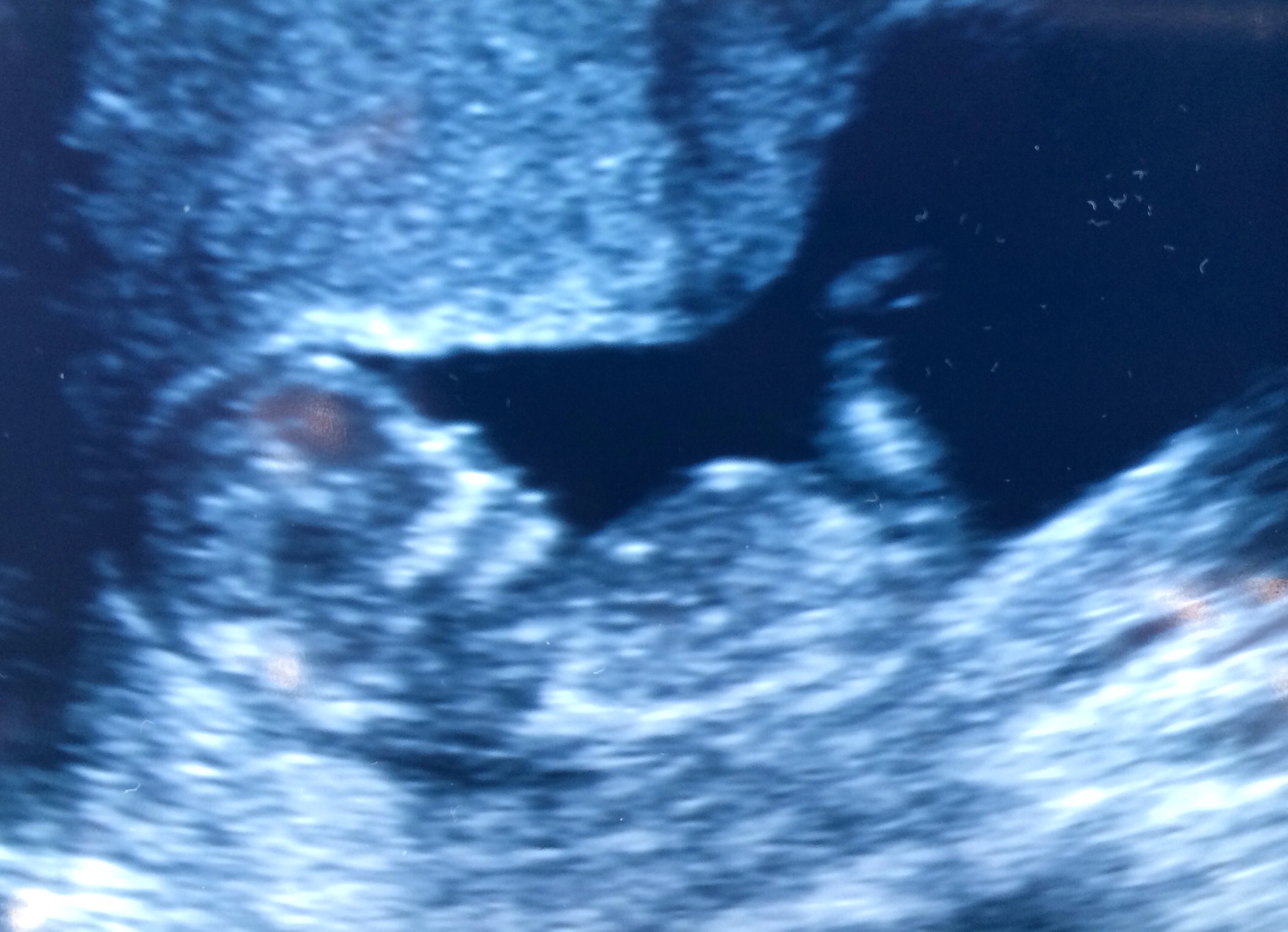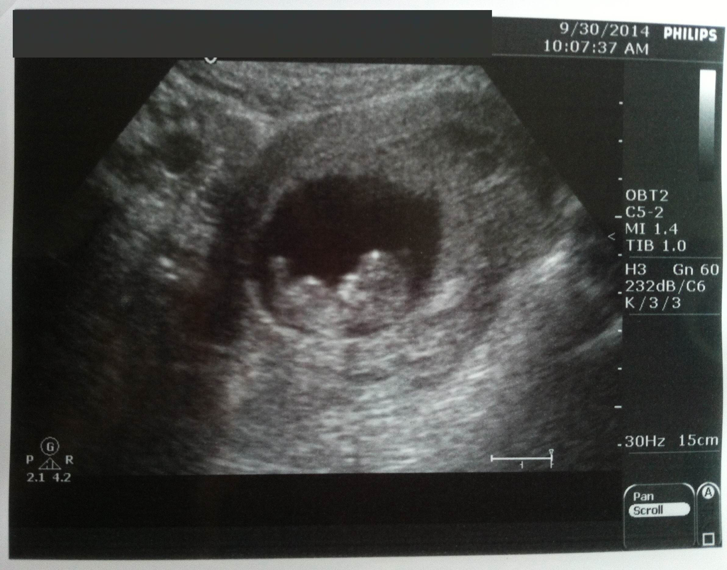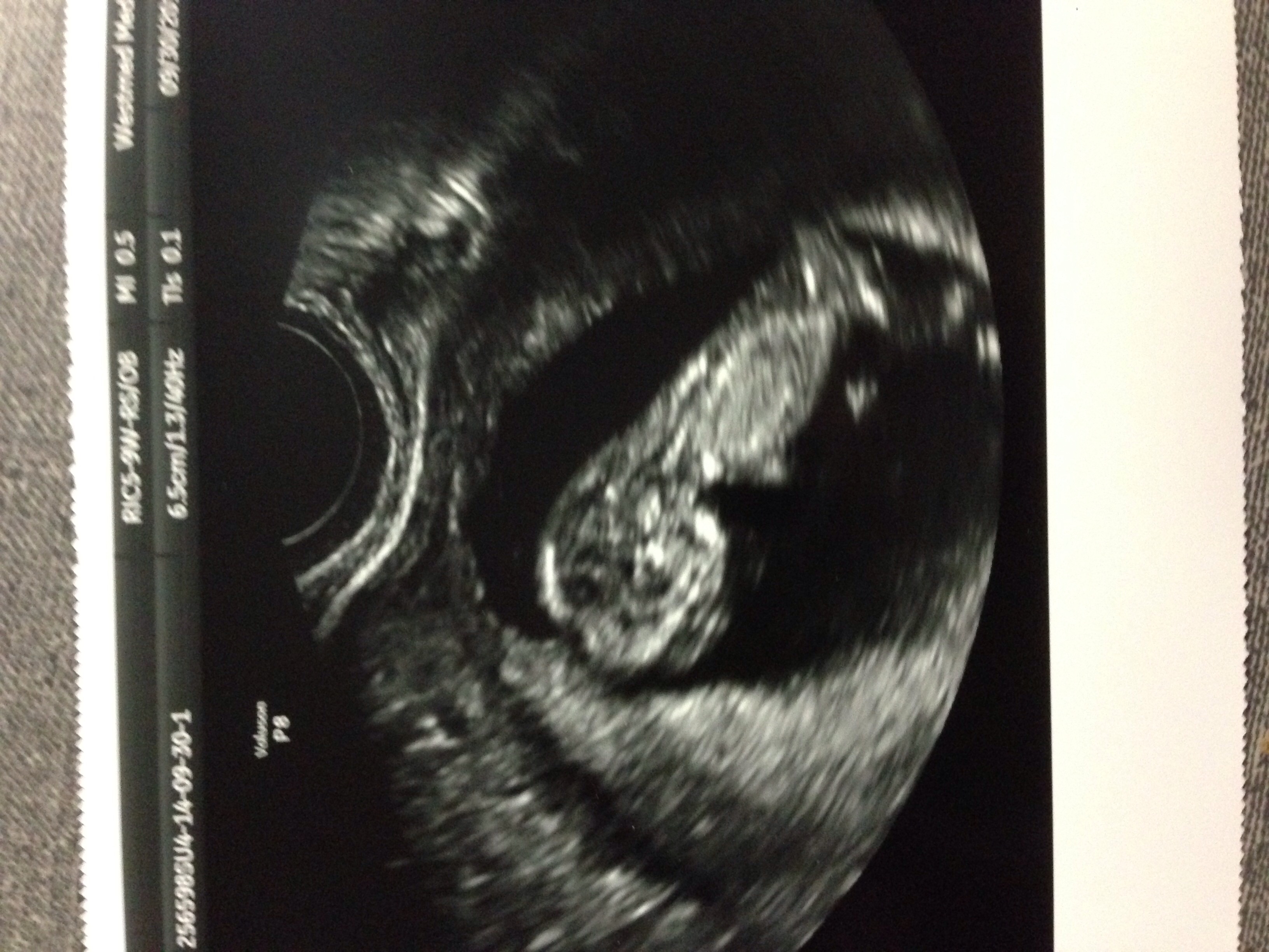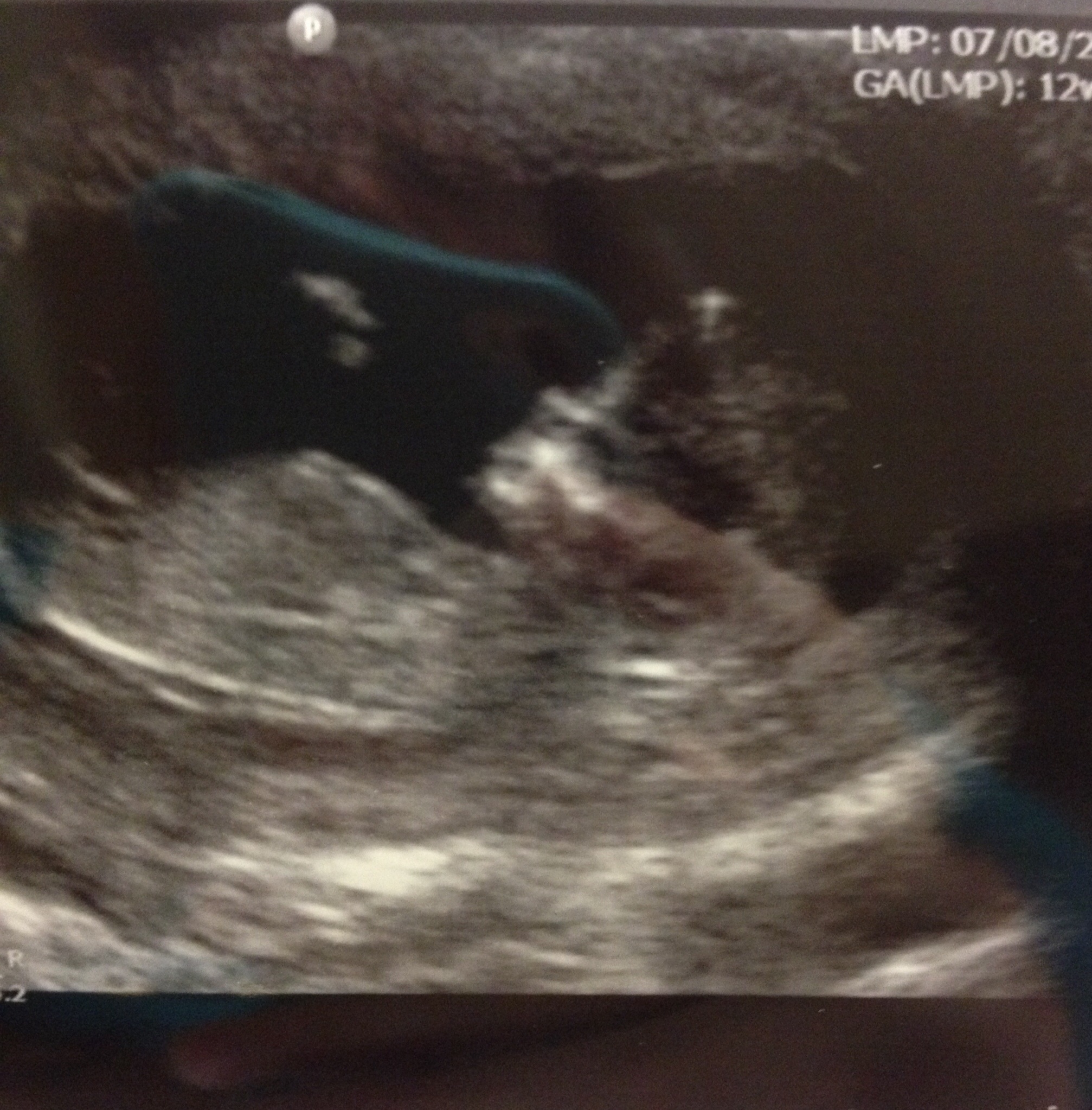 I'm waiting on bloodwork now, but here's the ultrasound picture. LMP puts me at 12w1d, baby is measuring 12w3d. Heartbeat is 160-164 bpm. The blue thing is the reflection of my phone case lol.