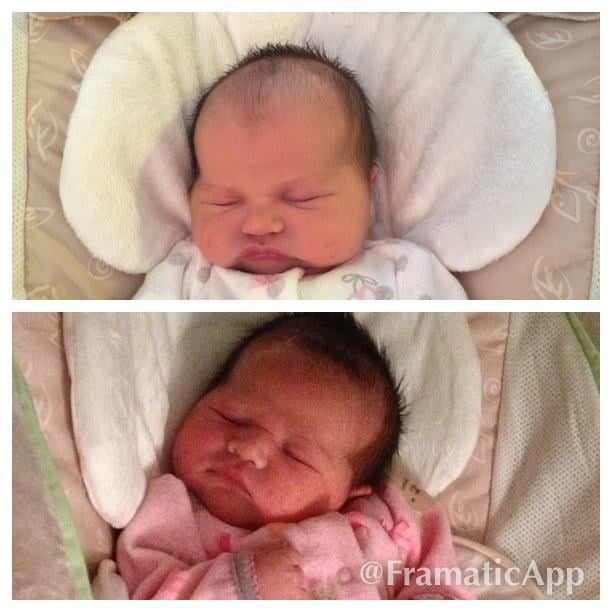 Caroline Elizabeth was born at 5:57 pm, was 8 lb 13 oz, and was 19 3/4" long. She looks so much like Isa (she's on top below) and we're obviously in love.