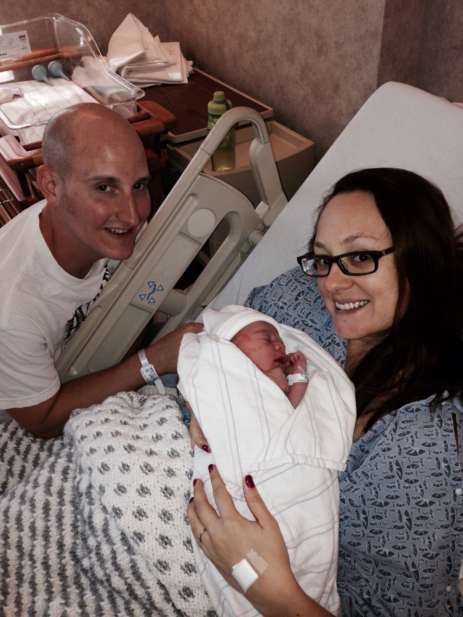 Went to bed at 10, woke up at 1am with stomach pains, different than anything I felt, so I thought it was bad food related. I couldn't sleep and realized they kept coming, so I decided to make food, and woke up DH. Ctx kept coming and were about 4min apart at 6, so we loaded up to go to the hospital. At check in, I found out I was already 9cm with a bulging bag of waters! Very exciting to get so far so fast. We get in the room, start laboring and I was so hard! They never really got on top of each other so I am thankful for the breaks where I would just zone out and lean against DH. Med free was always my goal, but wow! It's tough!!