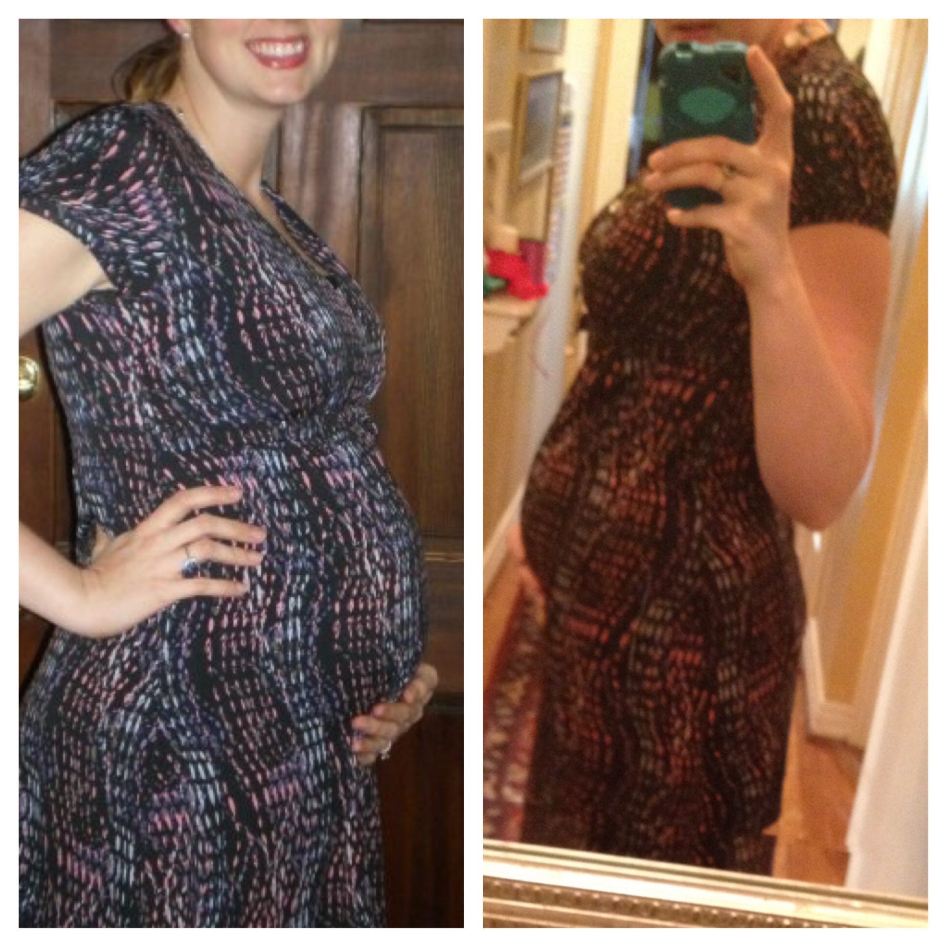 On the right is me at 12 weeks in the same dress now, which is pregnancy #5. At this rate they are going to have to roll me into the hospital come April!