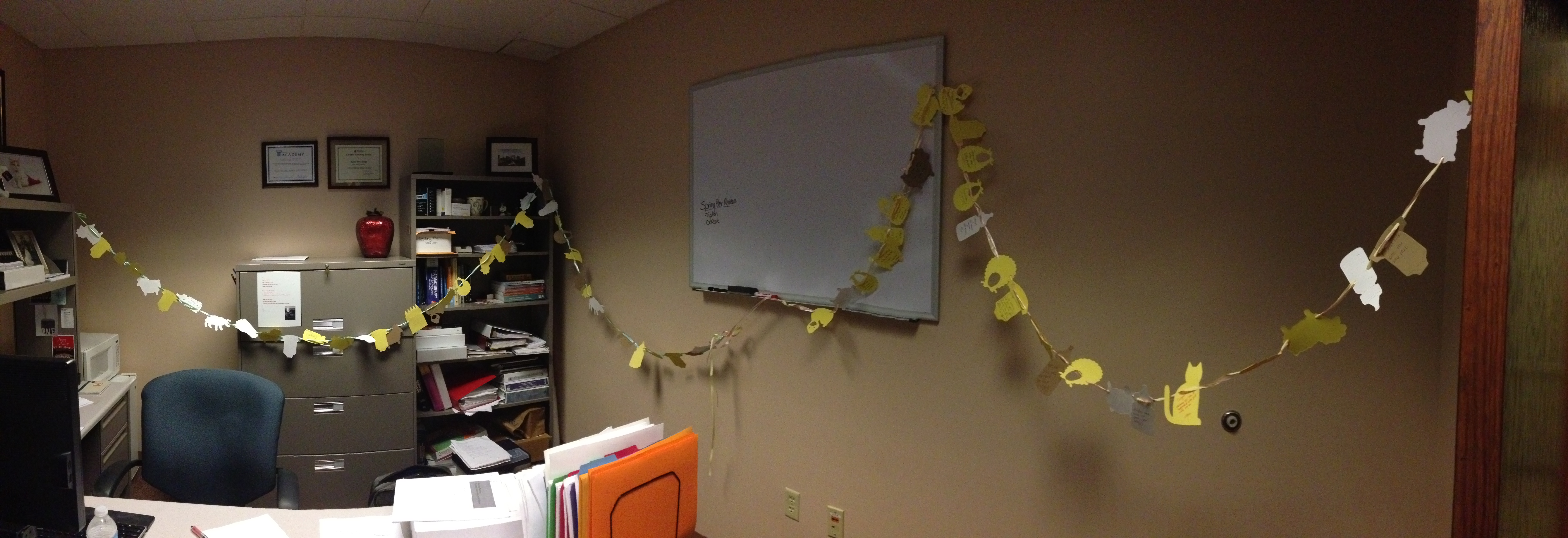 AW real quick. So I'm a professor at a university and this morning as I walk up to my office I see the cleaning woman blocking my door and the lights on with two students inside. I'm all like what the hell?! (didn't actually say it) and our cleaning woman blocked my view and said "get out of here we need 5 minutes!" I was so confused and annoyed but I left and when I came back, the girls had decorated my office! It was two of the girls in the sorority I'm the advisor for who were in there hanging up this garland-thingy the girls made.