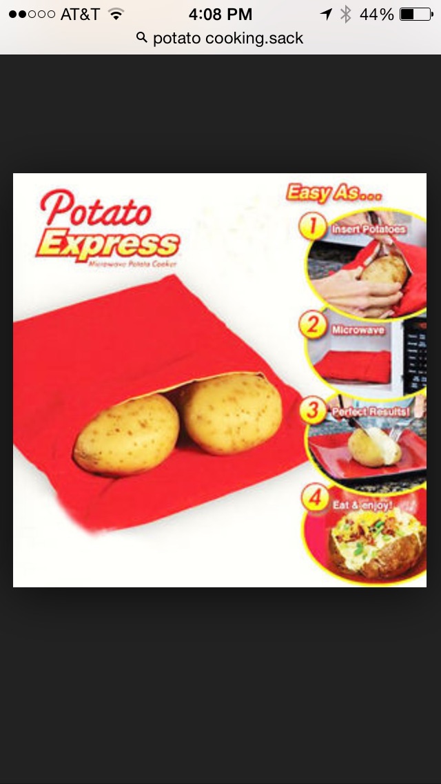 There is a store at the local mall called As Seen on TV. Last year DH went there and got me a gift for my stocking. He got me this red sack that you put potatoes in. Pop it into the microwave for 5 minutes, and instant baked potato! It cooks the potato just fine, but definitely doesn't taste like an actual potato baked in the oven.