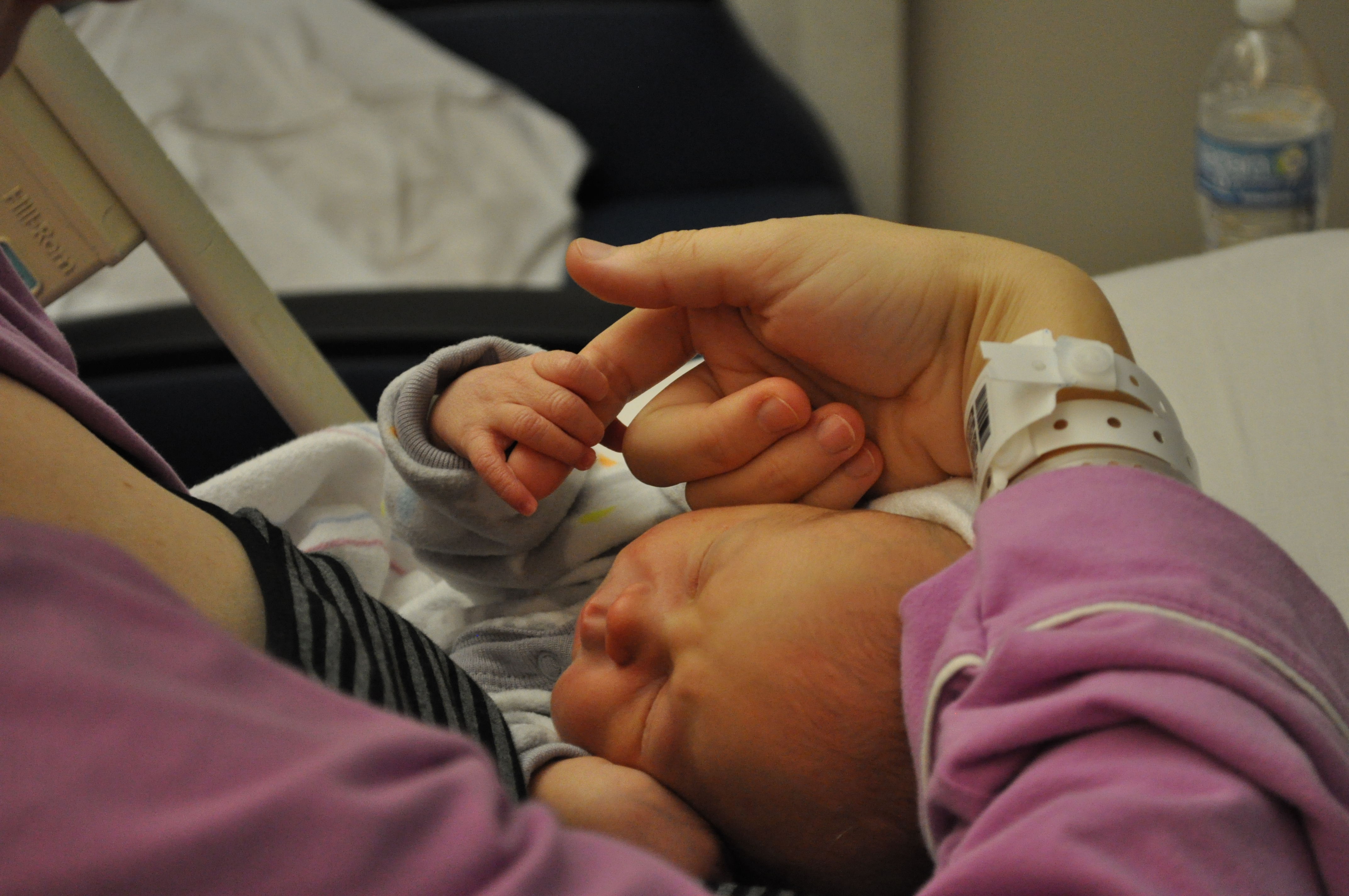 Mine was just recently, after Luke had surgery. He was all jittery from the being under and I was holding him against me wrapped in a blanket. He fell asleep with his mouth wide open and holding on to a piece of my hair. It felt so good to be able to comfort him when he was so afraid.