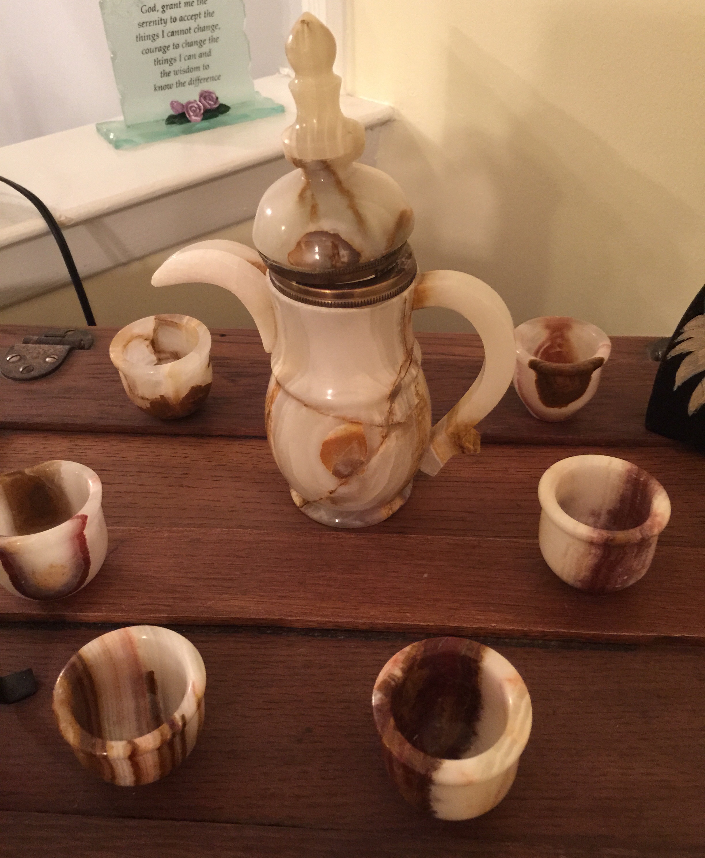 My hubby just gifted me with this handmade tea set he bought at a bazaar while serving in Afghanistan. He had bought it for his mom who died suddenly before we met and he gave it to me tonight as a gift and I could tell it was something special to him since it was hers. I feel all teary, I told him to go to poker night with his friends and he felt bad leaving me. He's really been sweet lately