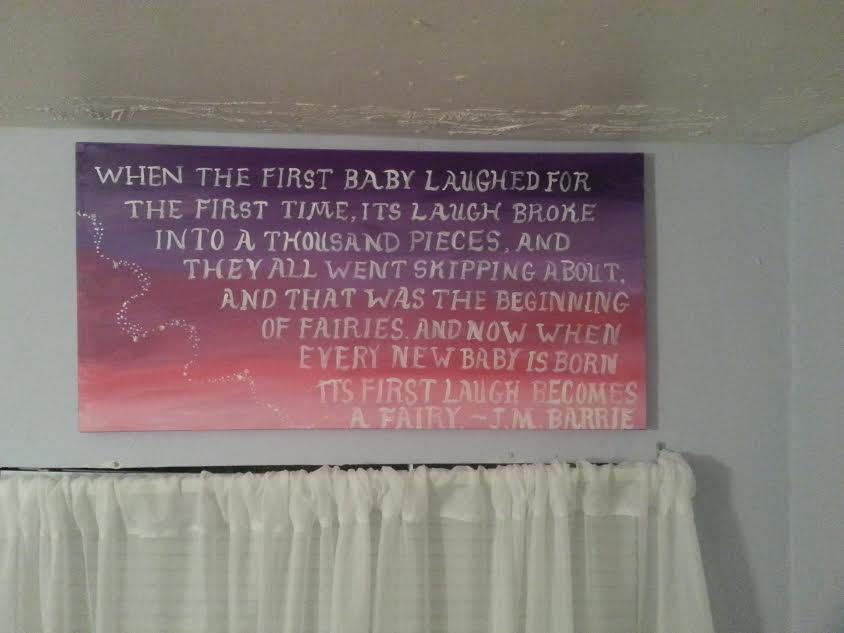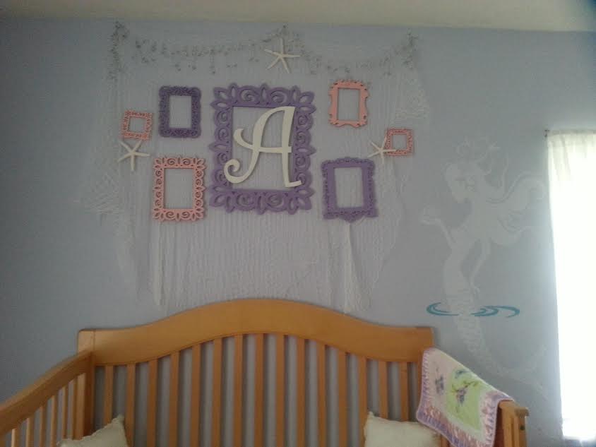 My nursery is a work in progress. I'm going with a Neverland theme. The two paintings are ones that I've done, the first one being princess Tiger Lily, and the second a quote I painted from the J.M.Barrie's Peter Pan. Above the crib is mermaid lagoon. I have the fishing net with frames hanging from it, starfish and pearls strung along the top. Painted the frames/letter myself all from Michael's arts and craft store. Also the mermaid decal (kinda hard to see in the picture) off to the side I got on Amazon. For the Indian camp/Tiger Lily wall there are those tents with tee pees feather decals on top. I still have to make/paint version of Big Ben on the wall where Peter, Wendy, and her brothers are flying. Also finish up pixie hollow around the closet area. I'll be happy once I get everything to my liking...... like I said work in progress but I'm enjoying craft time on my "Down time"