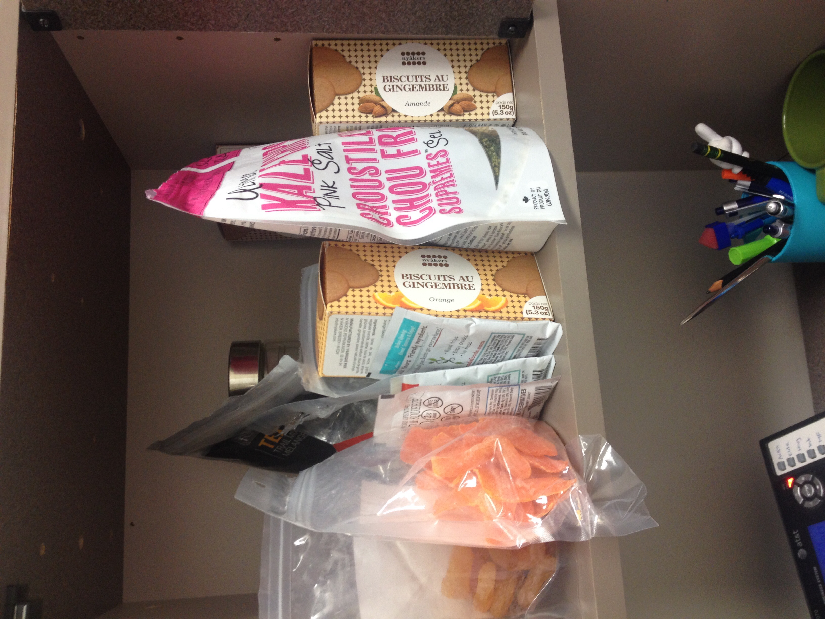 I have a cupboard at work that everyone else uses for contracts and stuff In their offices. And mine looks like this. No one knows about my food stash lol. I also have a whole cupboard in the kitchen... So excessive lol I have more food at work then I probably do at home..