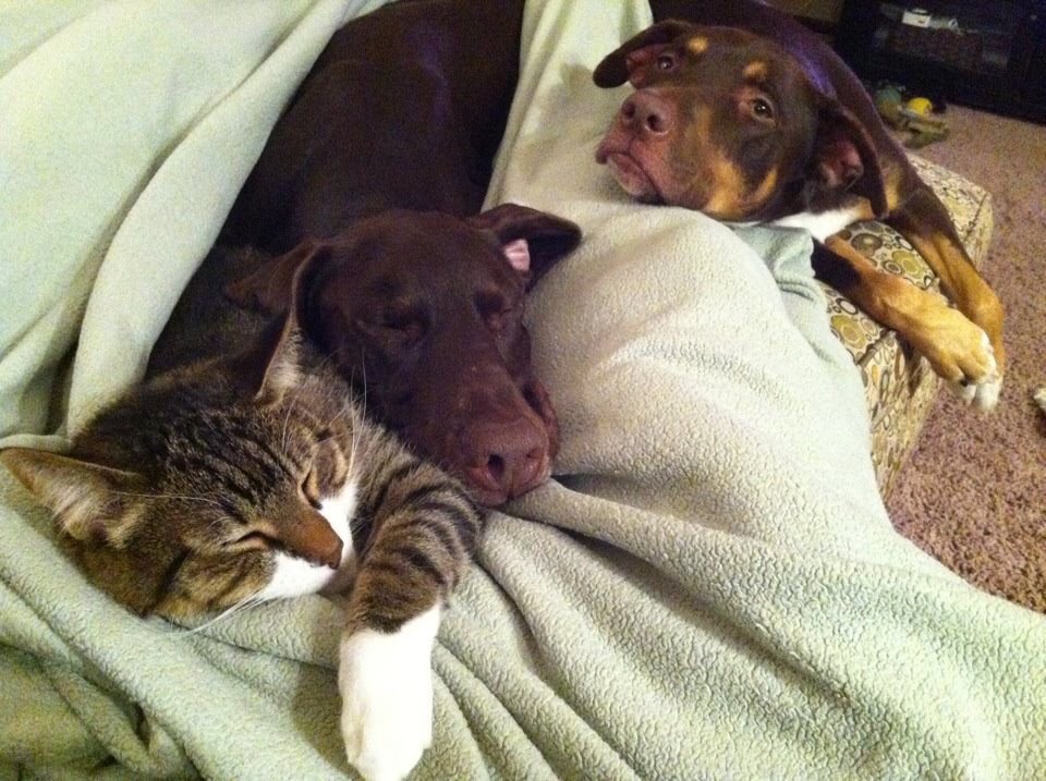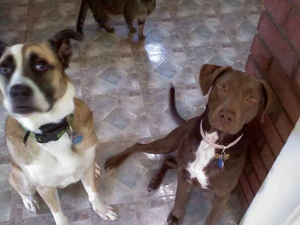 These are my pups. Reese a 5yo bully breed/shepherd mix and Hugo a 6 yo pointer/chocolate lab mix. Wylie is my 10 yo cat