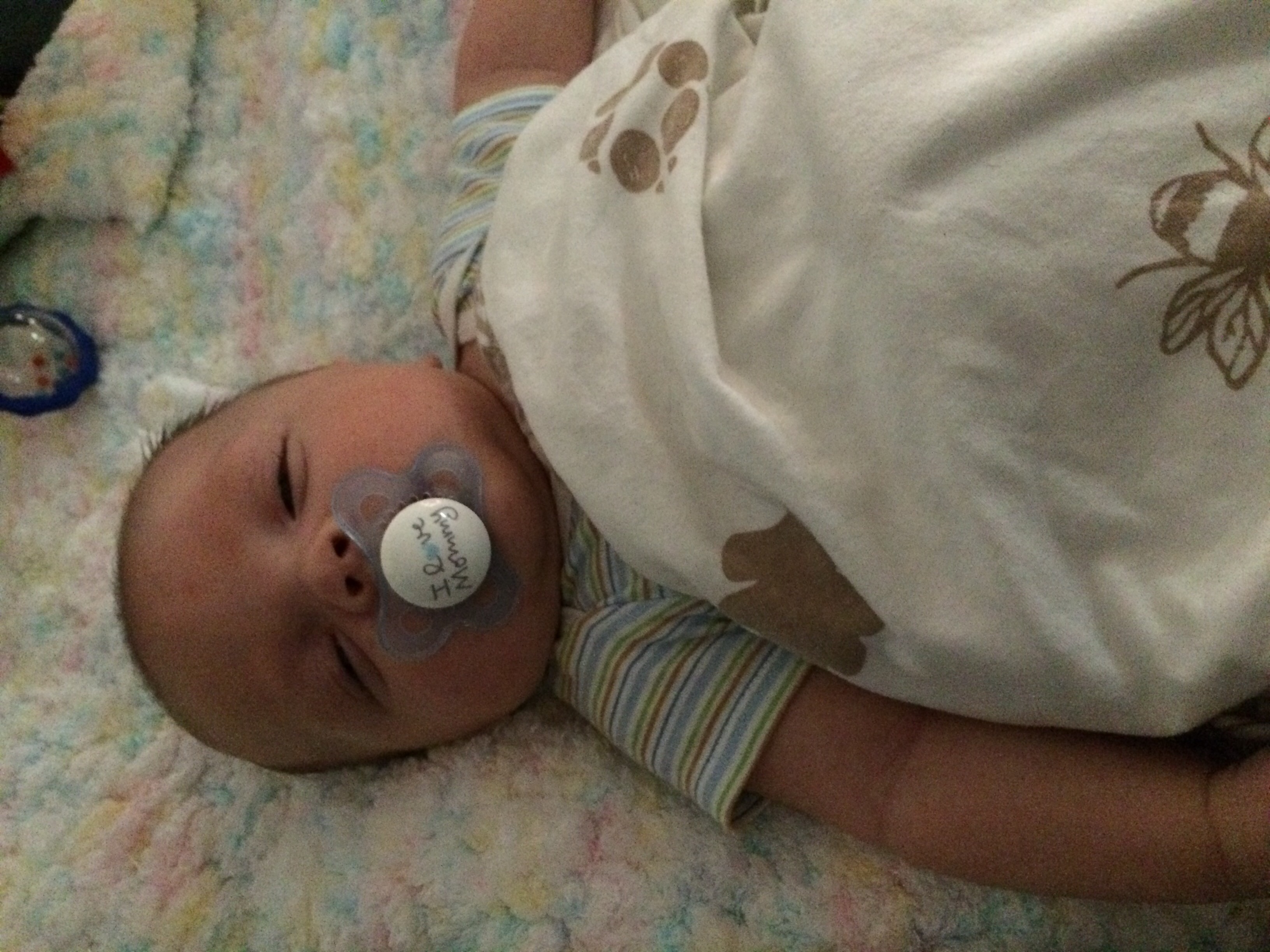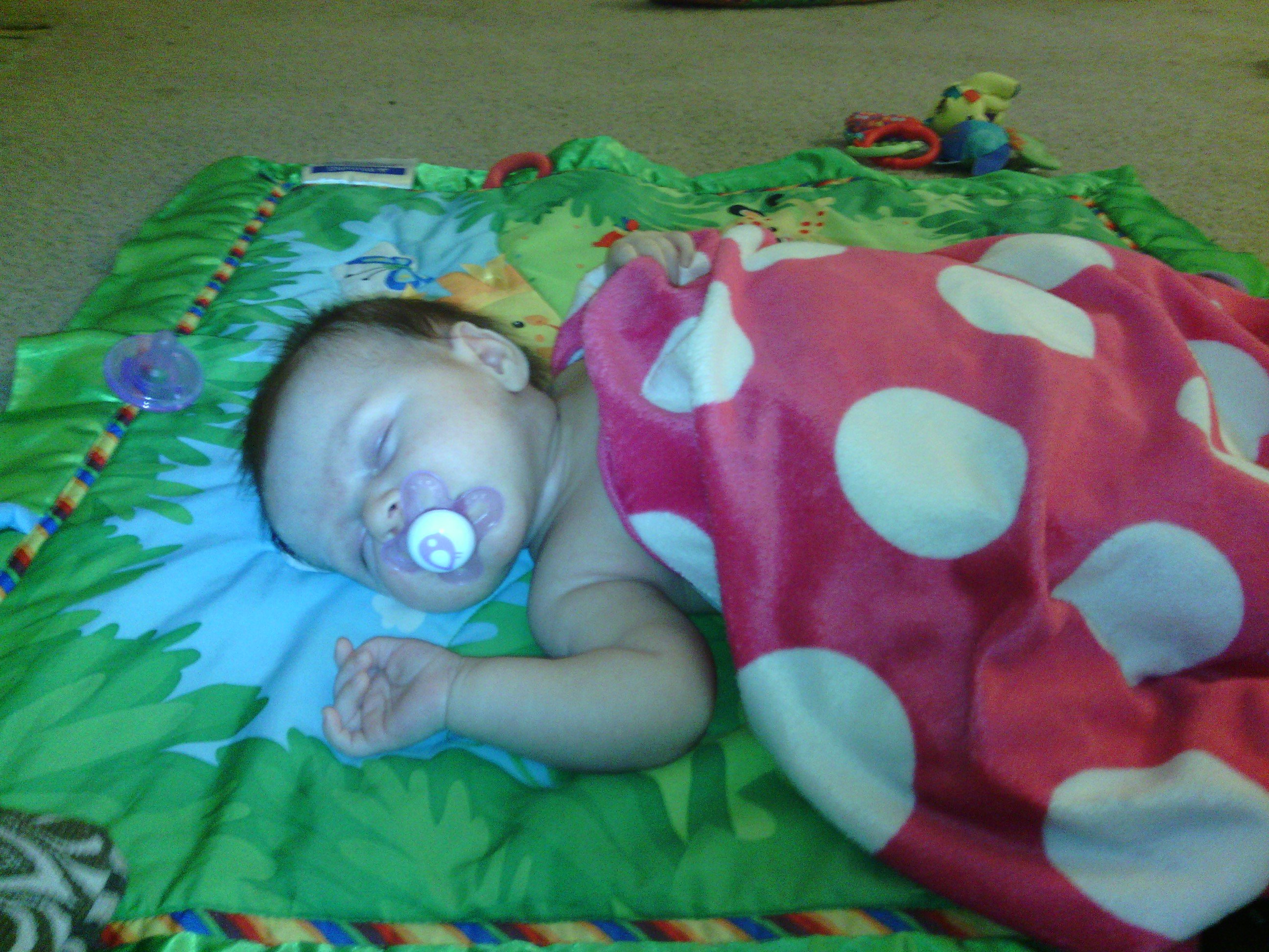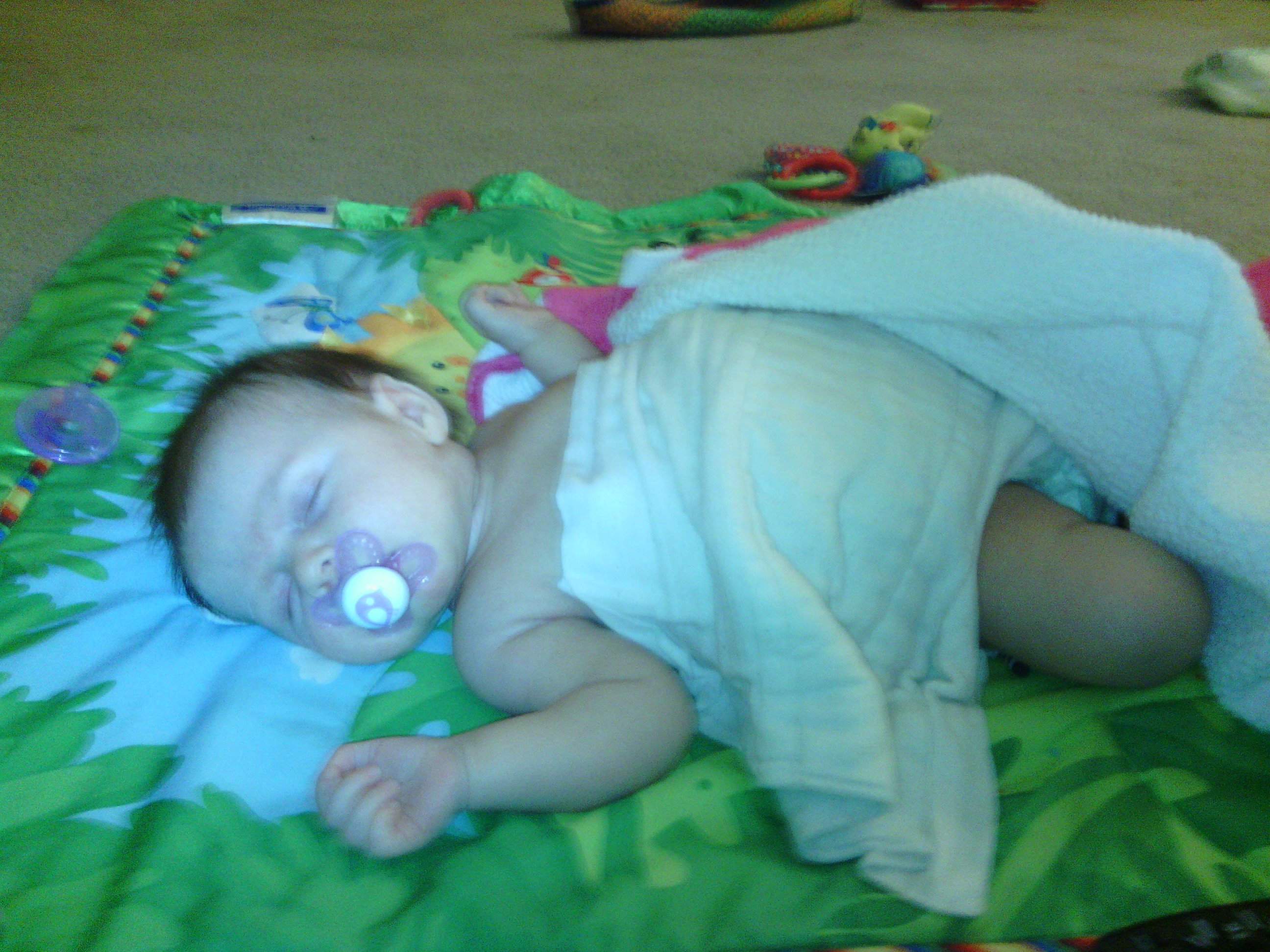 Mommies, I want to share what I just discovered. DD gets HORRIBLE gas every afternoon/evening. Nursing does nothing but make it worse of course. Warm baths have been helping, but I had another idea tonight. Baby heating pad!!! Just wet a burp cloth or rag until its really warm. Then I put another on top of that to seal in the heat, and then her warmest blanket, and her pacifier in her mouth. I'll let the picture speak for itself. :-)