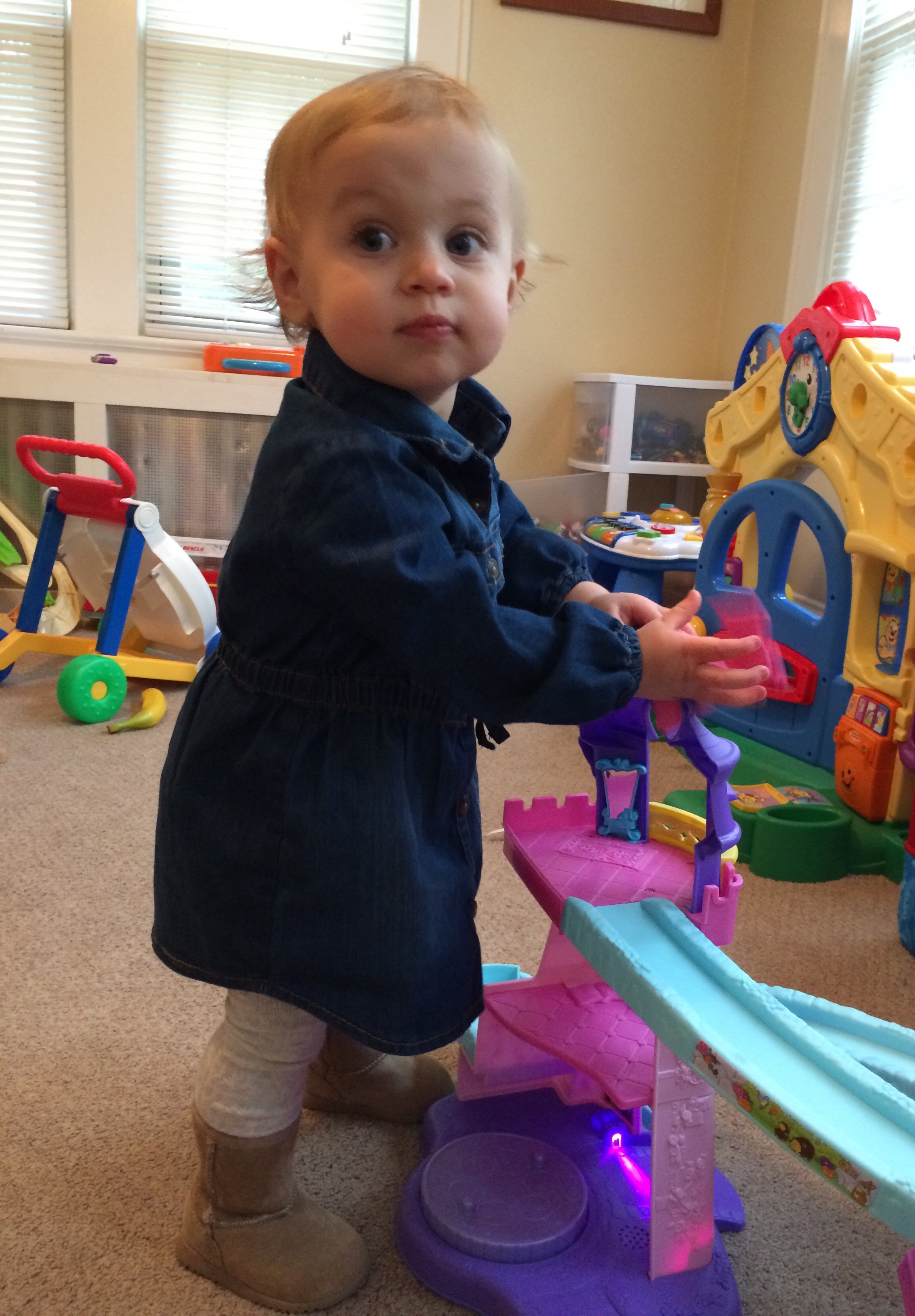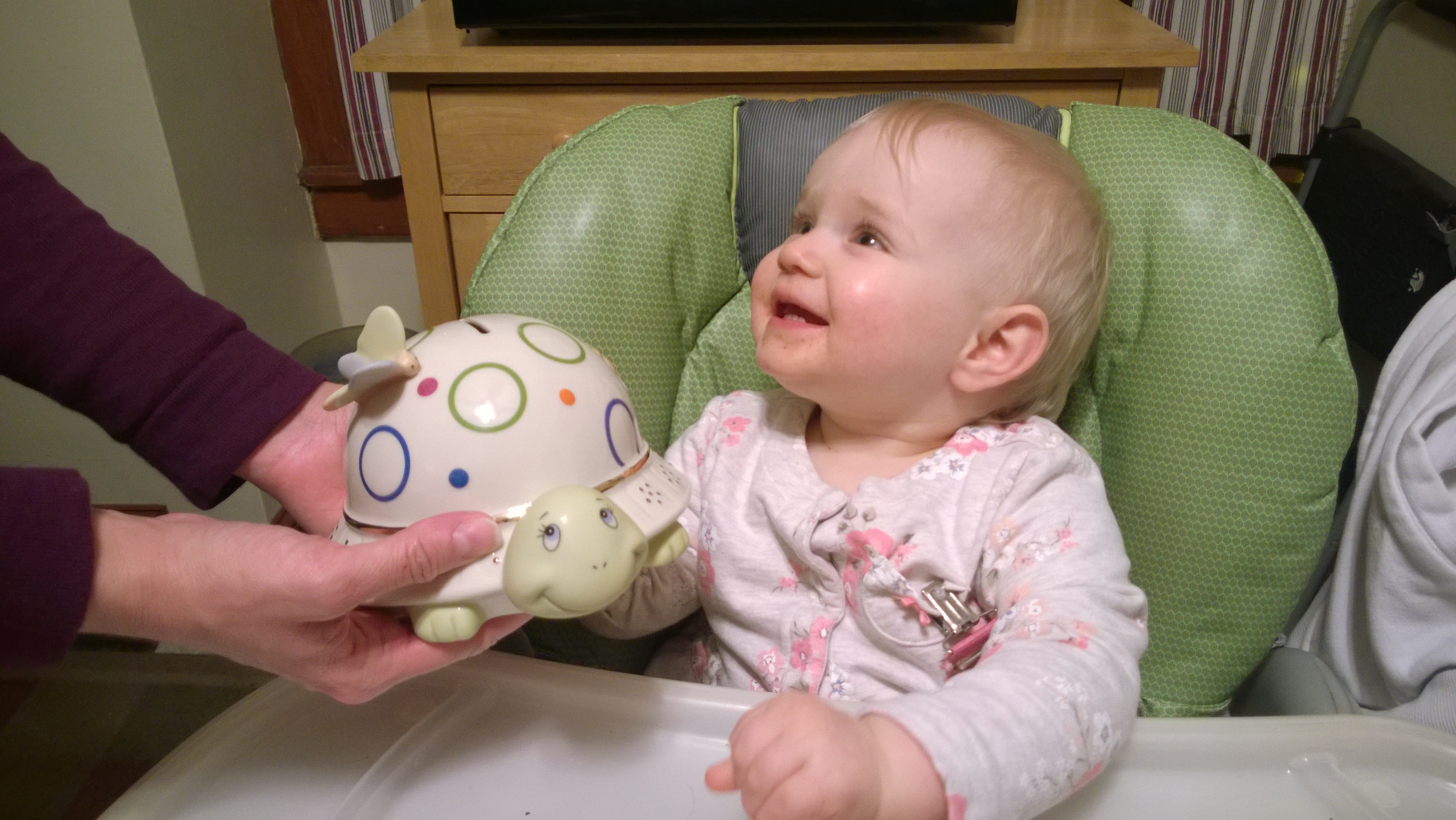 I was showing her the bank my friends got her for her birthday. I think she likes it
