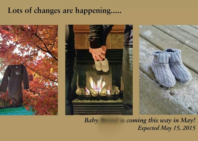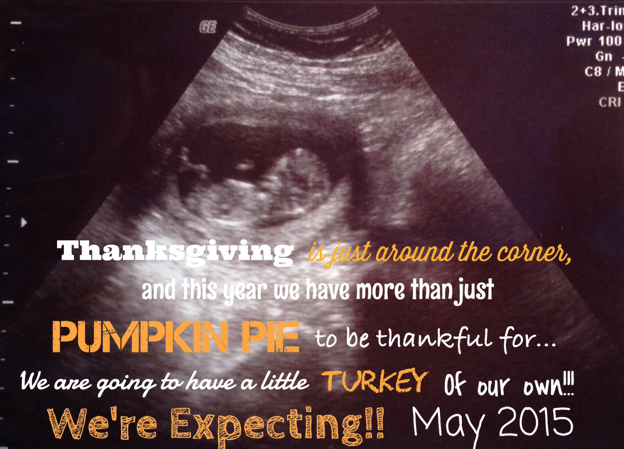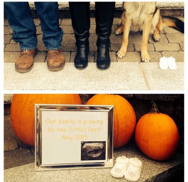 Here is ours. I was 14 weeks on Friday and finally tracked down the rest of our out of town family to tell via Skype and on the phone before we posted this. Then we put it on Facebook Friday night and it keeps bringing a smile to our face with all the texts and Facebook posts.