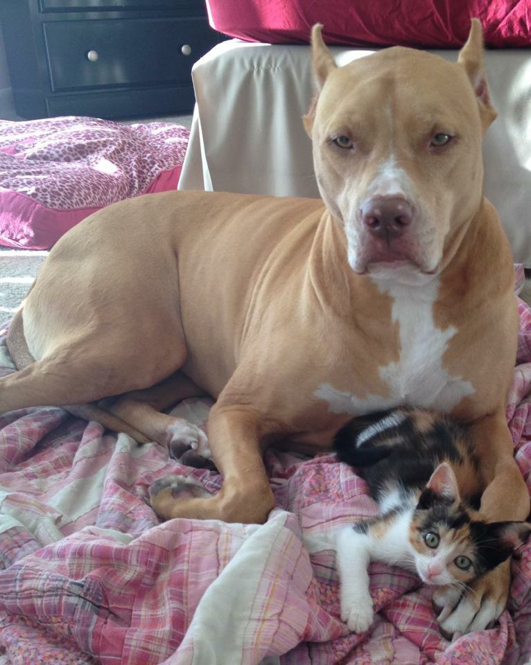 My girls Meela (pitbull - but she thinks shes a toy lap dog!) and Kayla (thinks shes a dog! lol don't leeve your food out she will eat it!..lol..the 2nd pic of her is after she ate my pasta!)