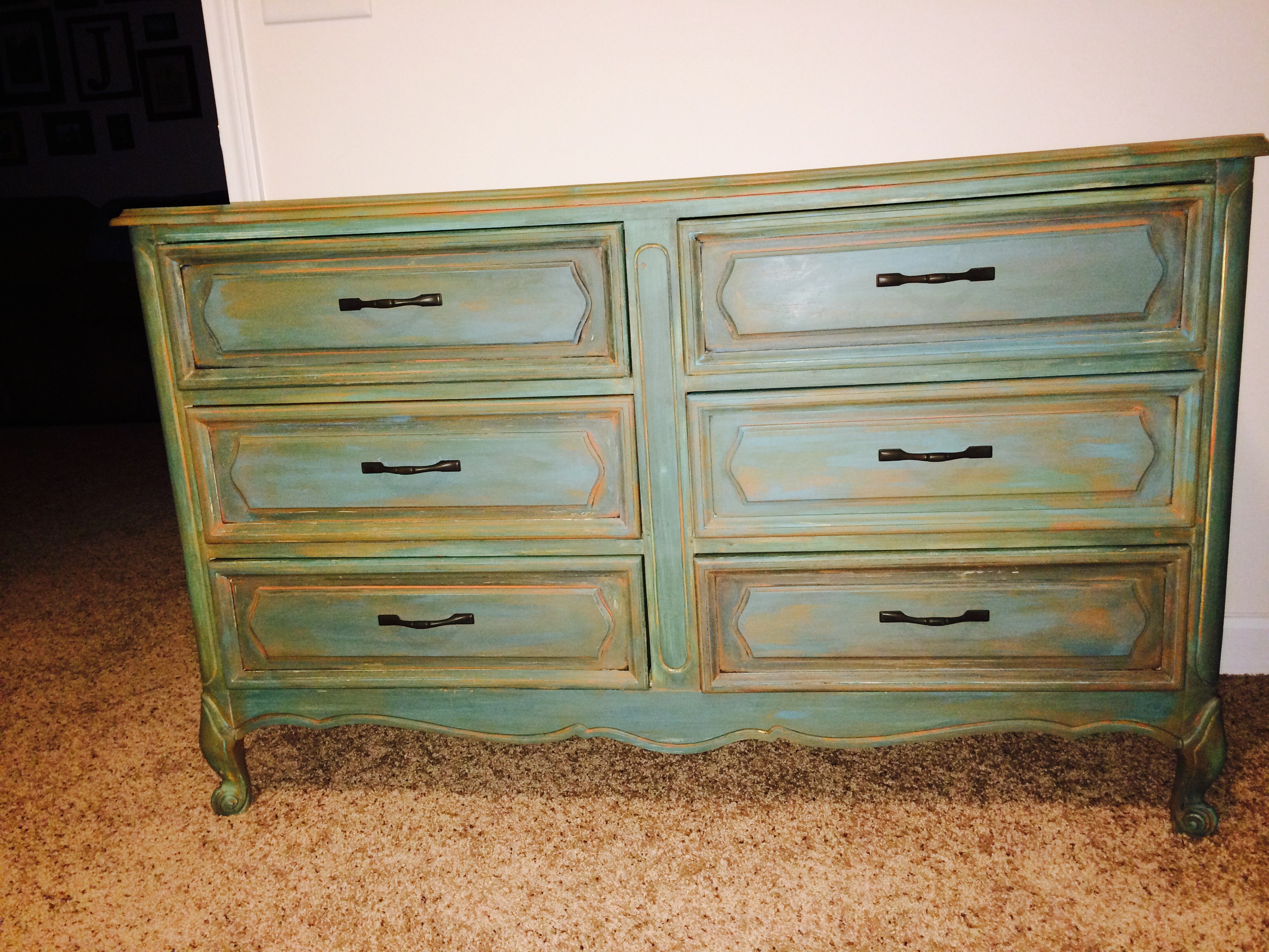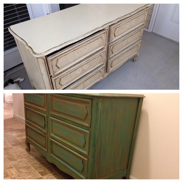 I purchased this old dresser from a friend who found it at a thrift shop for $30 so we antiqued it and made it all cute for my little mans room First photo is before/after,second is with new hardware and in his room.