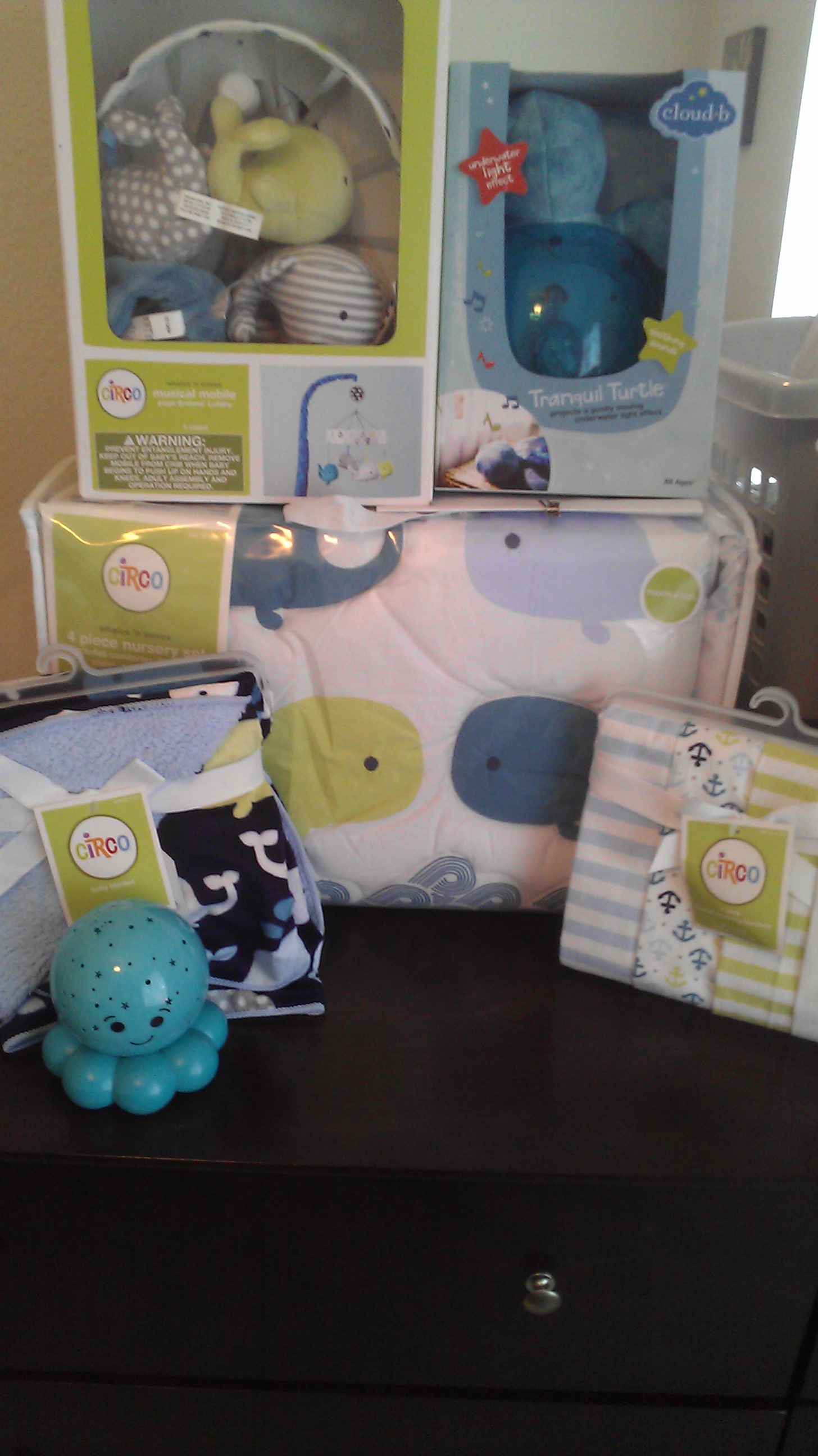 Stocked up on cute things for our under the sea nursery. If our lil girl decides she loves pink I'll suck it up & redo the room but, until she can say something about it cute whales, fish, teal, green, grey & white it is.