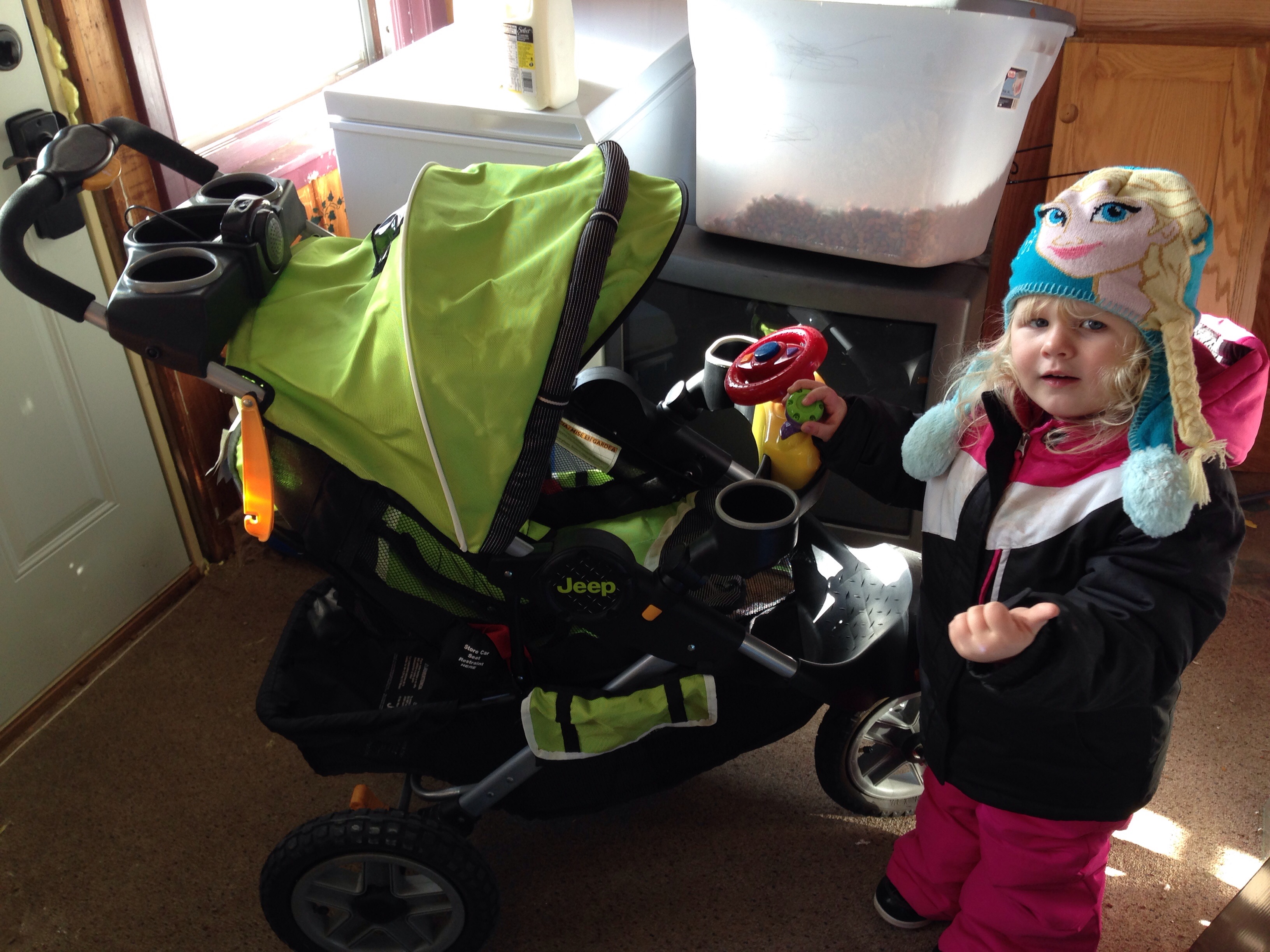 I bought a used jeep stroller cause I only have a double and neither of my other kids ride in the double anymore. I like it though, it's supposed to be all terrain and I need one that's good for pavement and gravel and it has a mp3 hookup and like 4 cup holders and a little car wheel toy for when baby is older.