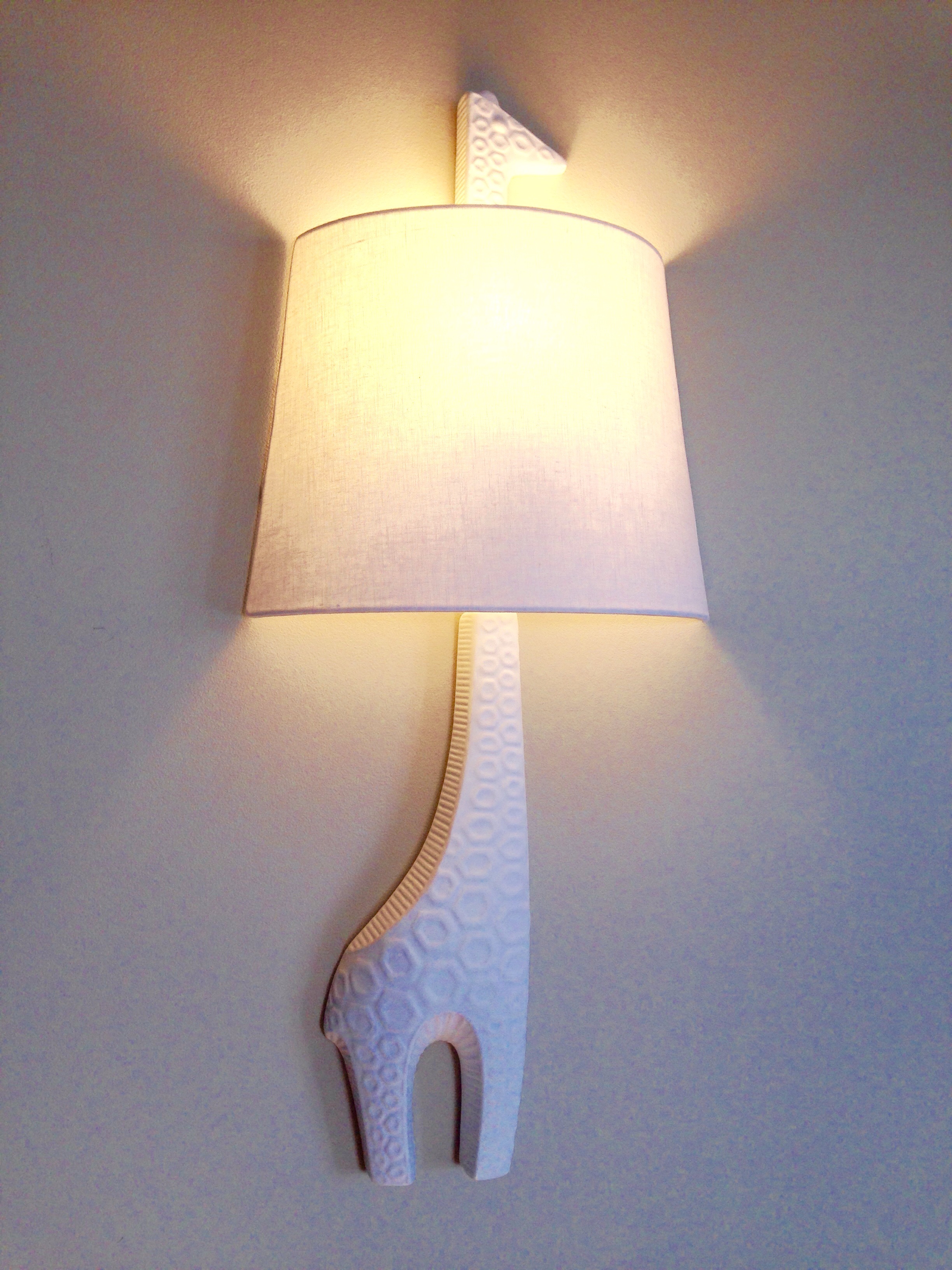 Finn's room was similar in some ways - again starting with the giraffes (my mother's first then the wall sconces), but his was more neutral: creamy white walls, white curtains, no clock... I also had some tree decals up on the walls - an Australian theme, with koalas on the branches.