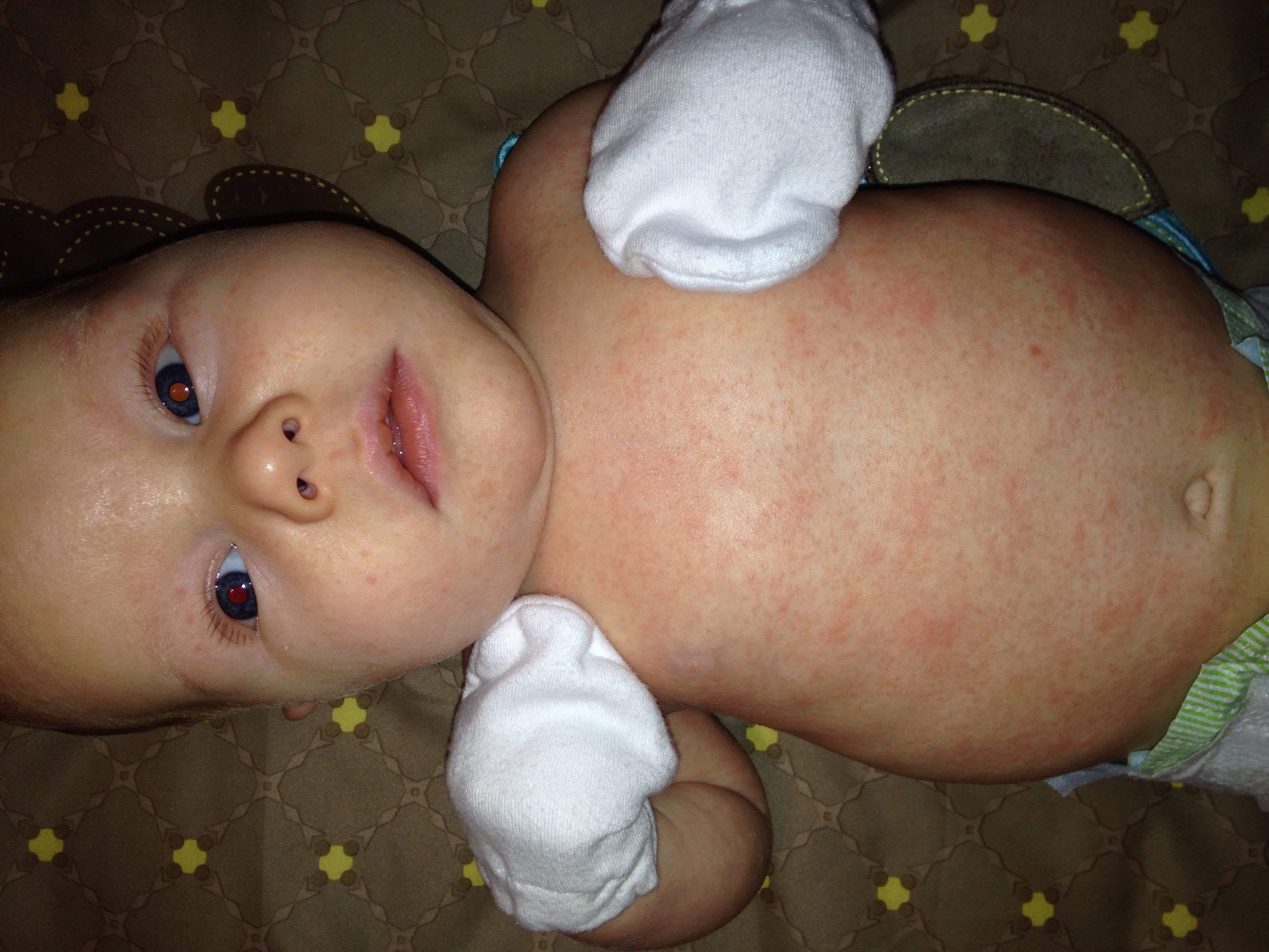 My 8 week old baby has broken out in a horrible rash! It started on his face and has now spread to his belly and shoulders. There are tons of small little bumps on his legs, belly and shoulders as well. I have just recently gone dairy free (about a week now) due to bright red blood in his poop and green stools. We have an appointment with the pediatrician this Thursday (12/11/14) but just thought I'd throw this out to see if anyone has experienced this and what it ended up being.