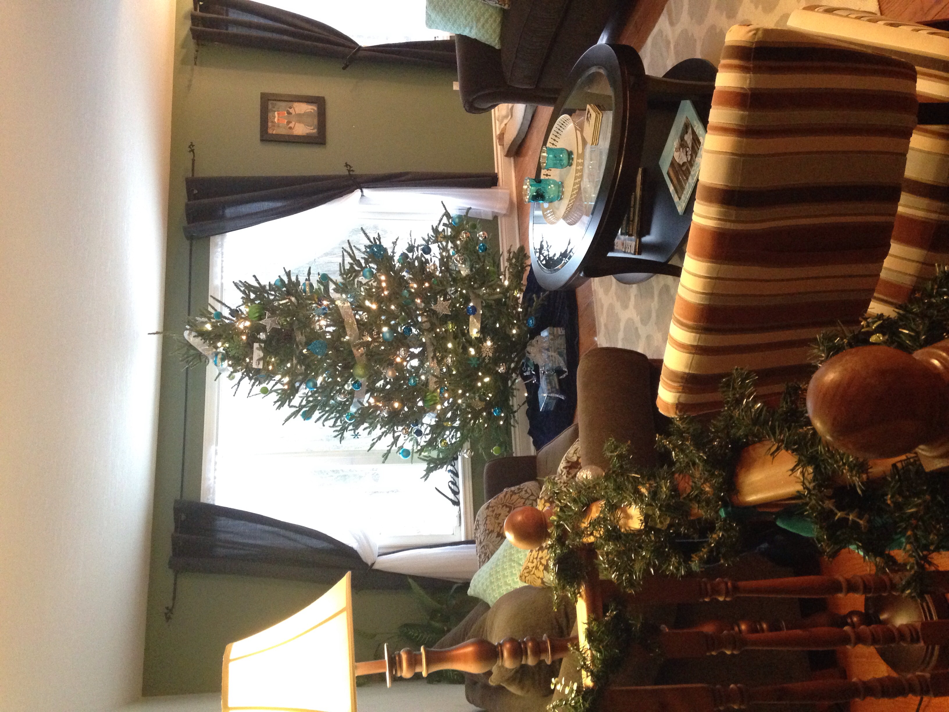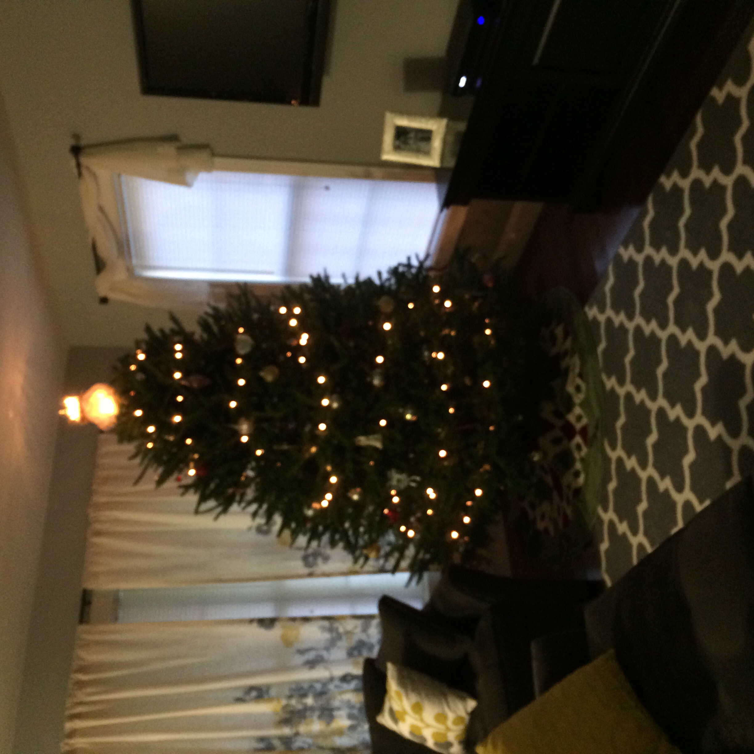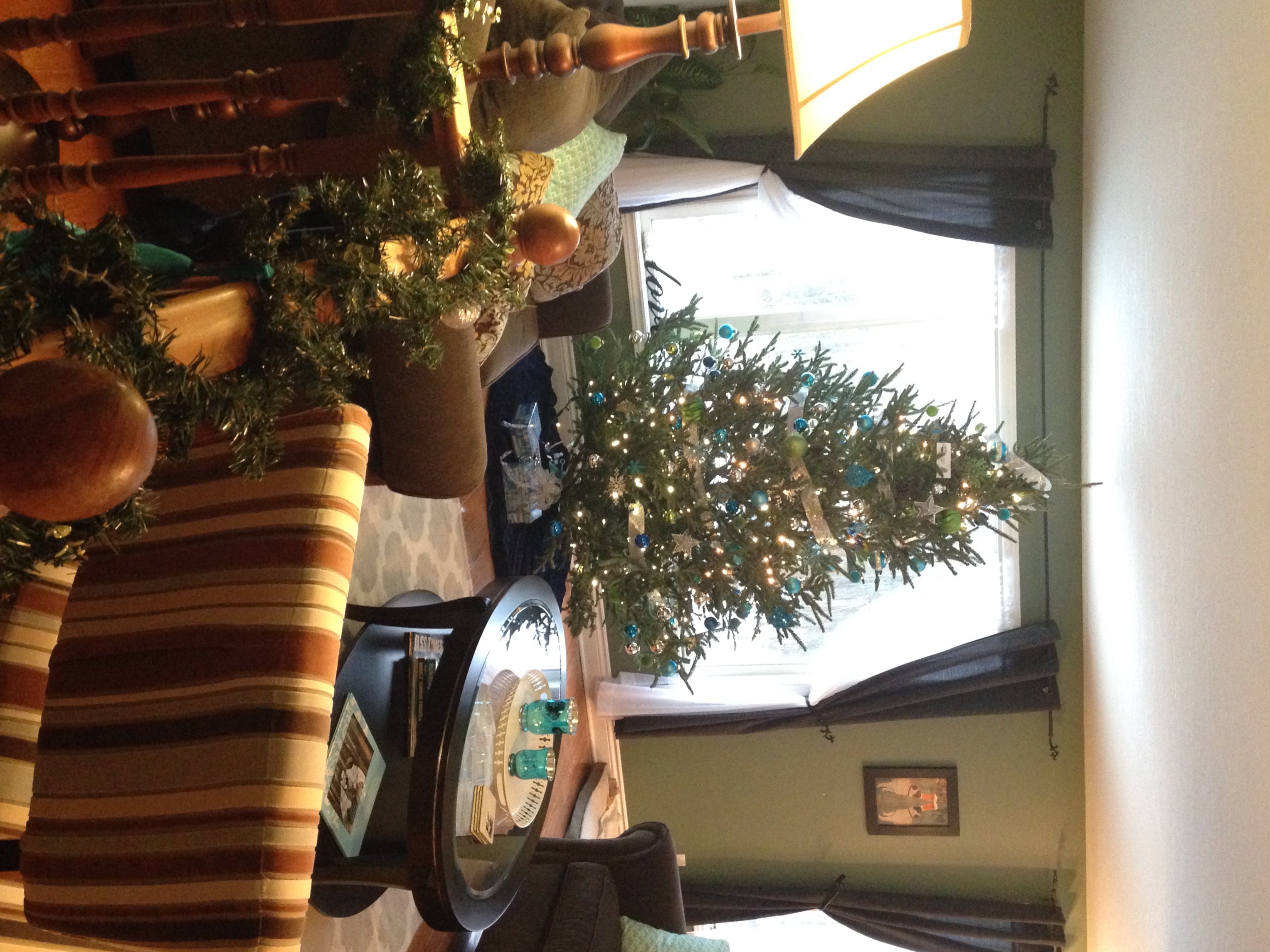 I grew up getting very big trees because we had a 9 foot ceiling. Well, apparently I still have that mind set. Our tree is way too big for our room but oh well! And my pic is sideways...