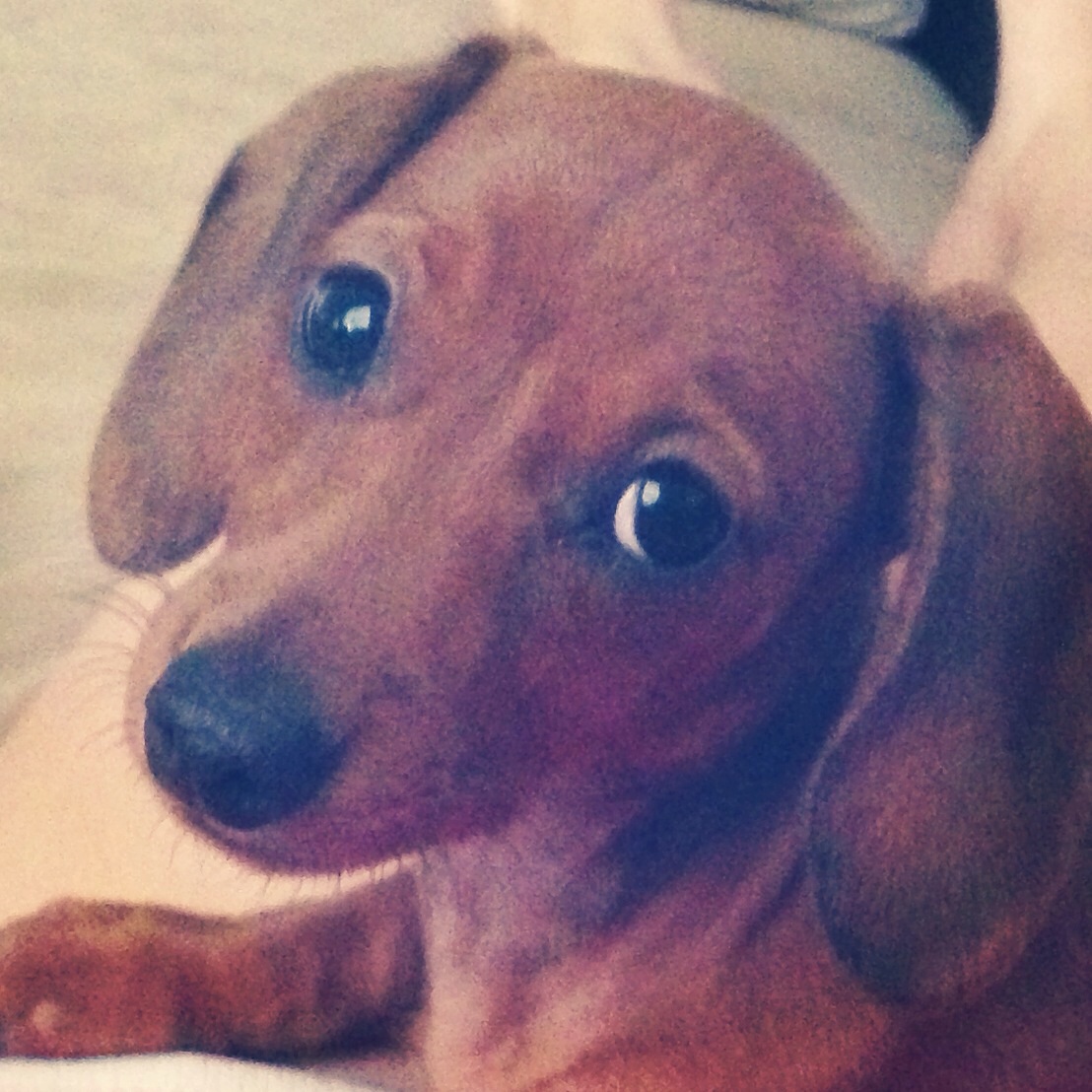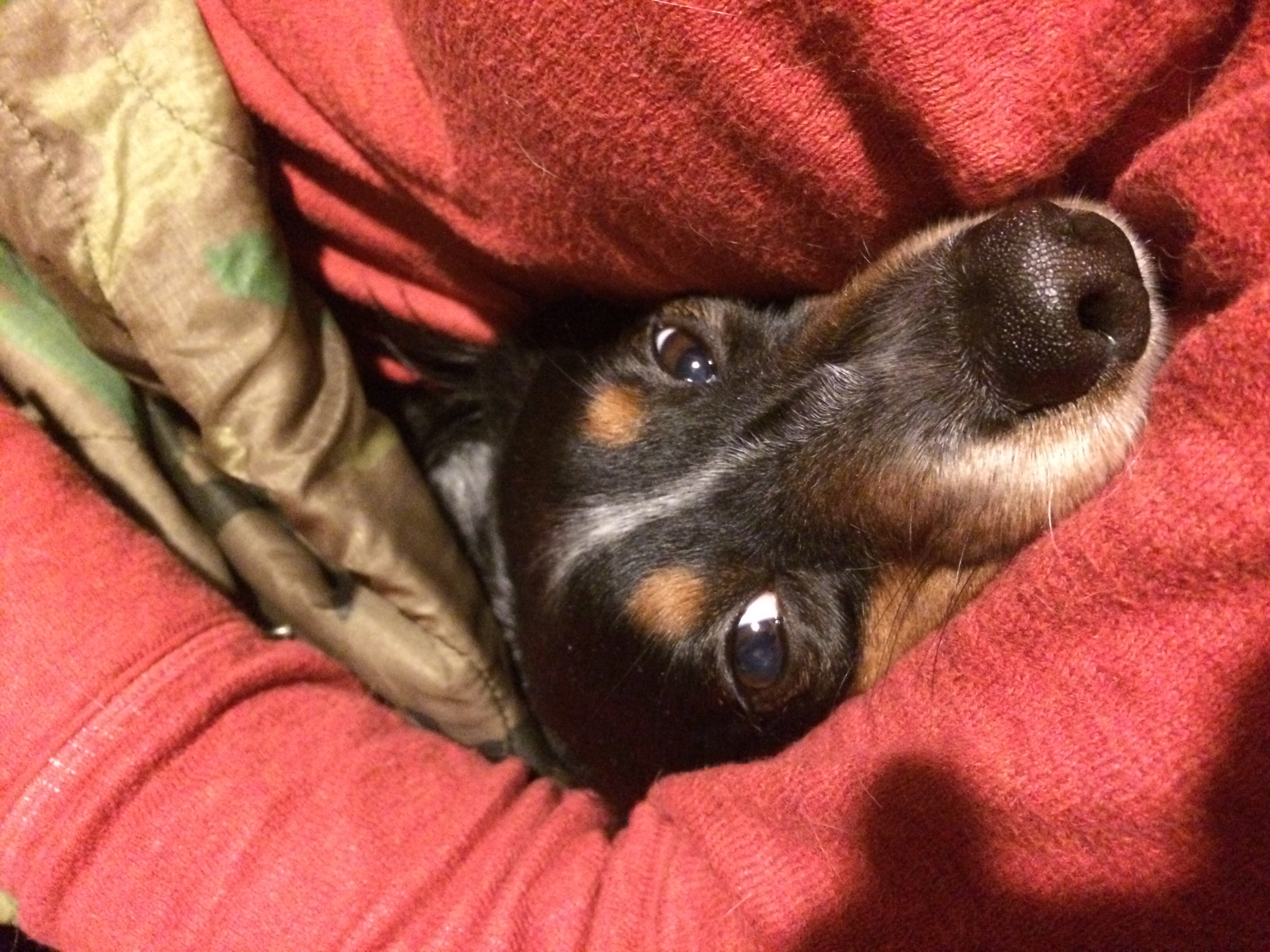 My female doxie is all about my husband, but she actually told me I am pregnant because all of a sudden one day she HAD to be touching me at all times. She had pups once and I wonder if she is just more tuned in?? My male doxie is super clingy too, though. Constant weenie smotherings when I am home.(pictured) My big mutt is pretty much the same.
