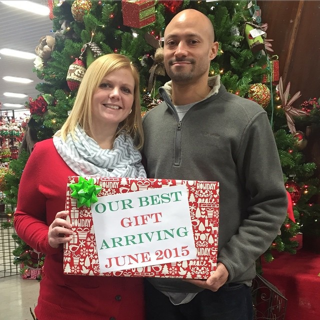 AW'ing in the symptoms thread! Feeling great today. Took our niece and nephew to a Christmas Family Fun Day event and decided to take our pregnancy announcement pic there! Here we are cheesing for the camera. Nothing fancy, just for fun!
