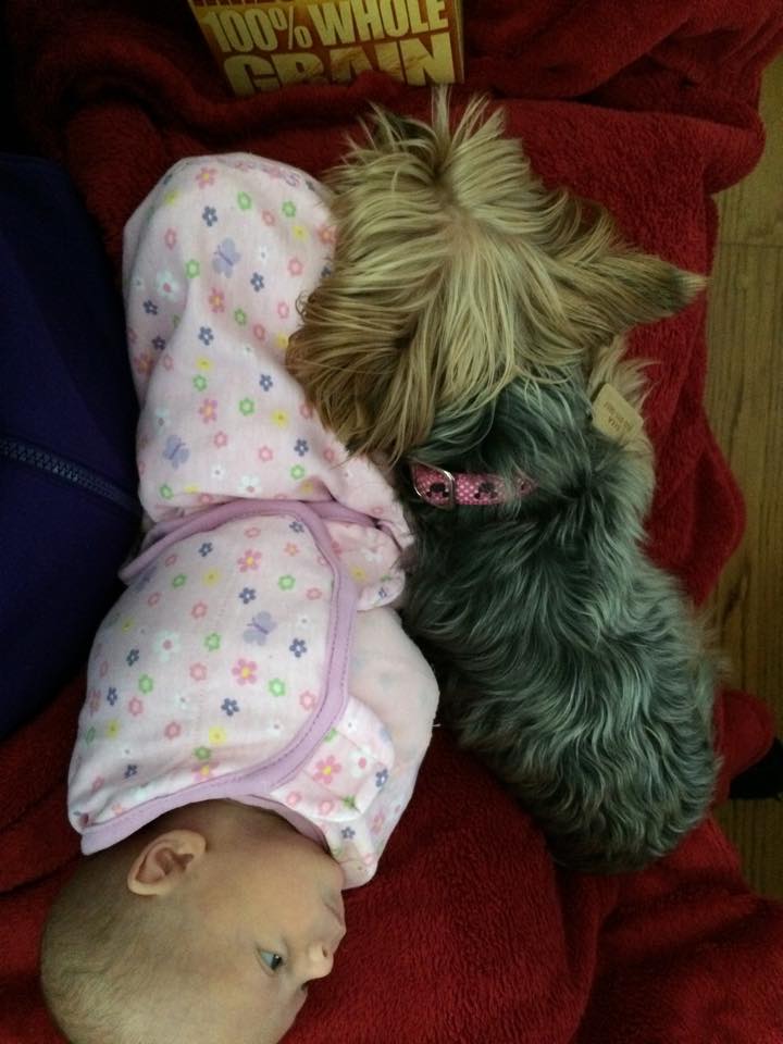 • Ella (a 3 year old Yorkie) is very protective of her younger sister, just as I predicted. If the baby starts to cry she runs into her nursery to check on her. Where ever Audrey is, Ella is (as shown below)