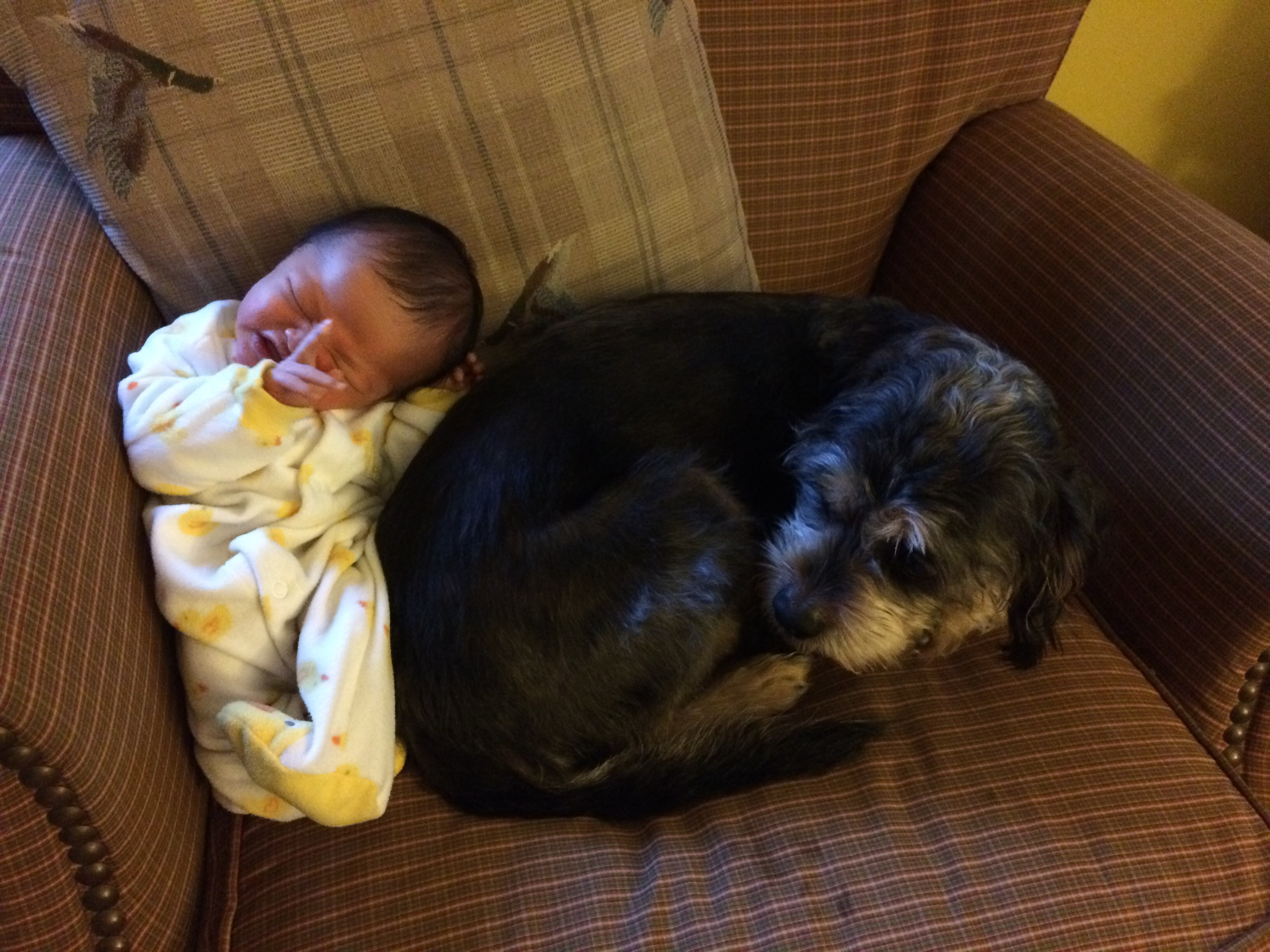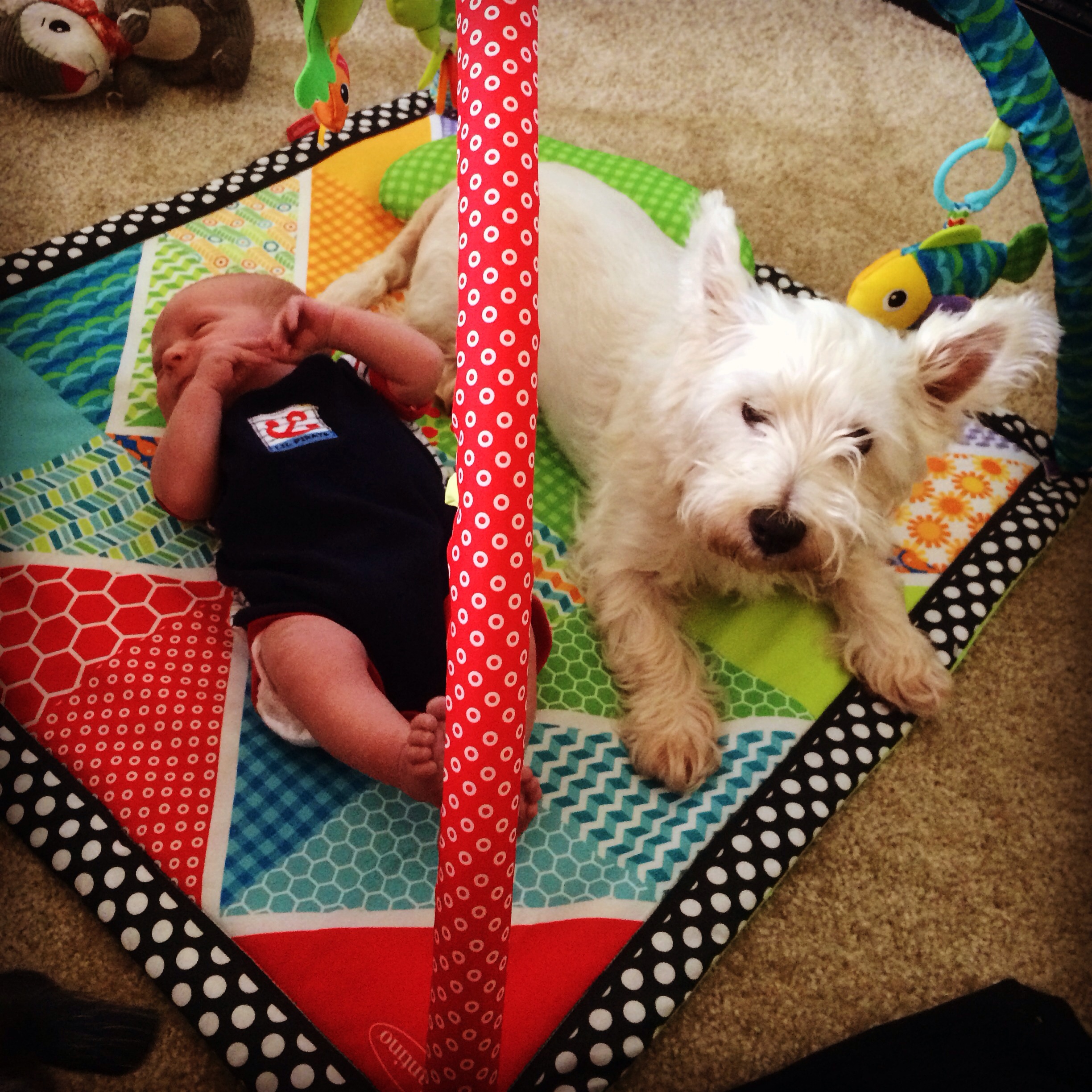 • My poor pup is having a hard time adjusting. She was so spoiled before and we all joked that she was my "first born". She's very interested in the baby but she is so hyper and loves to lick so we have to be very careful letting her near LO. When he's in his PnP or MamaRoo she stays on guard watching him and when we get home from anywhere she looks for him frantically if I walk in before DH with the carrier. So she definitely loves her "brother" she's just always sad knowing she's not the only "baby" anymore. No cute duo pics yet though.