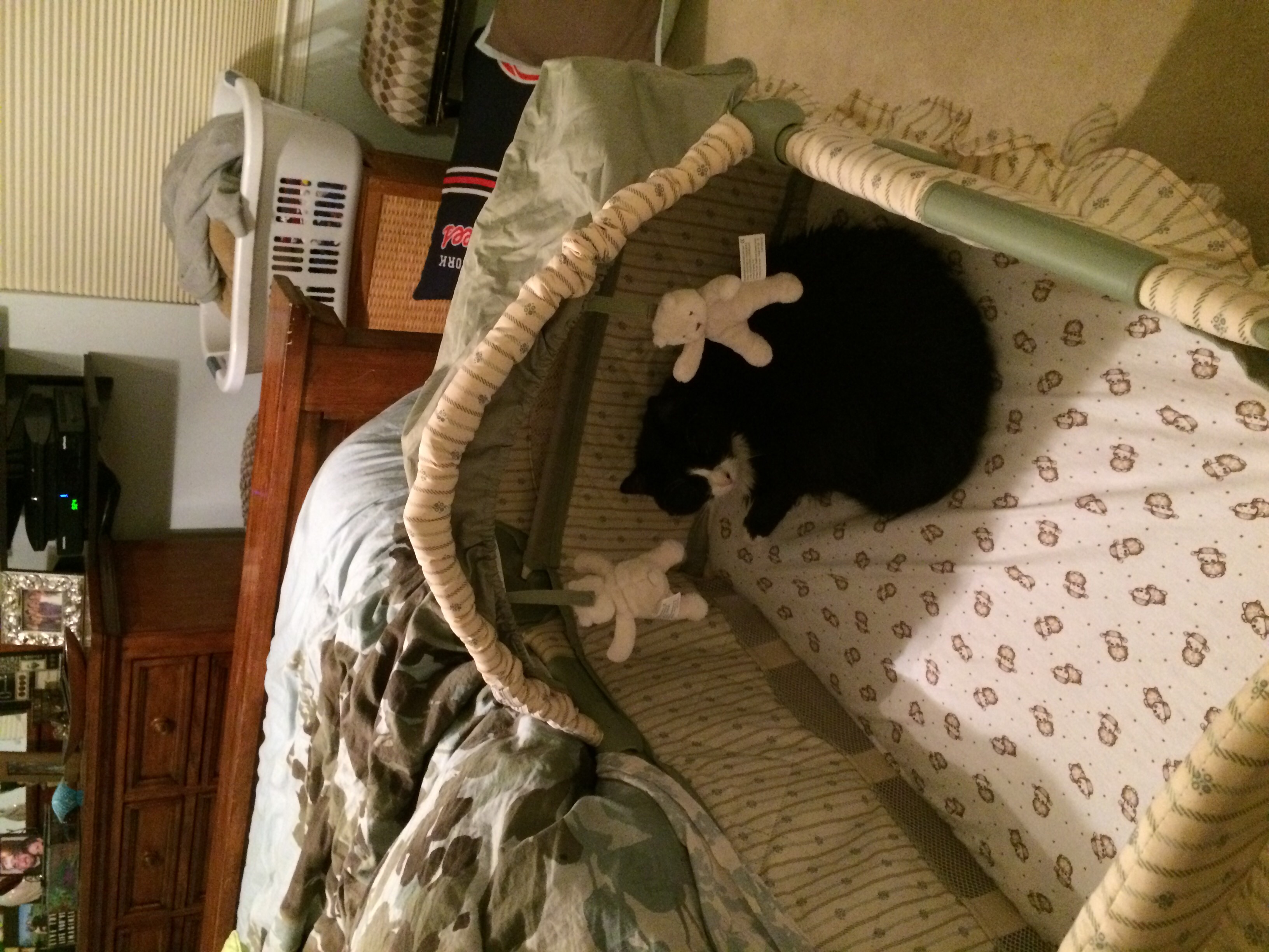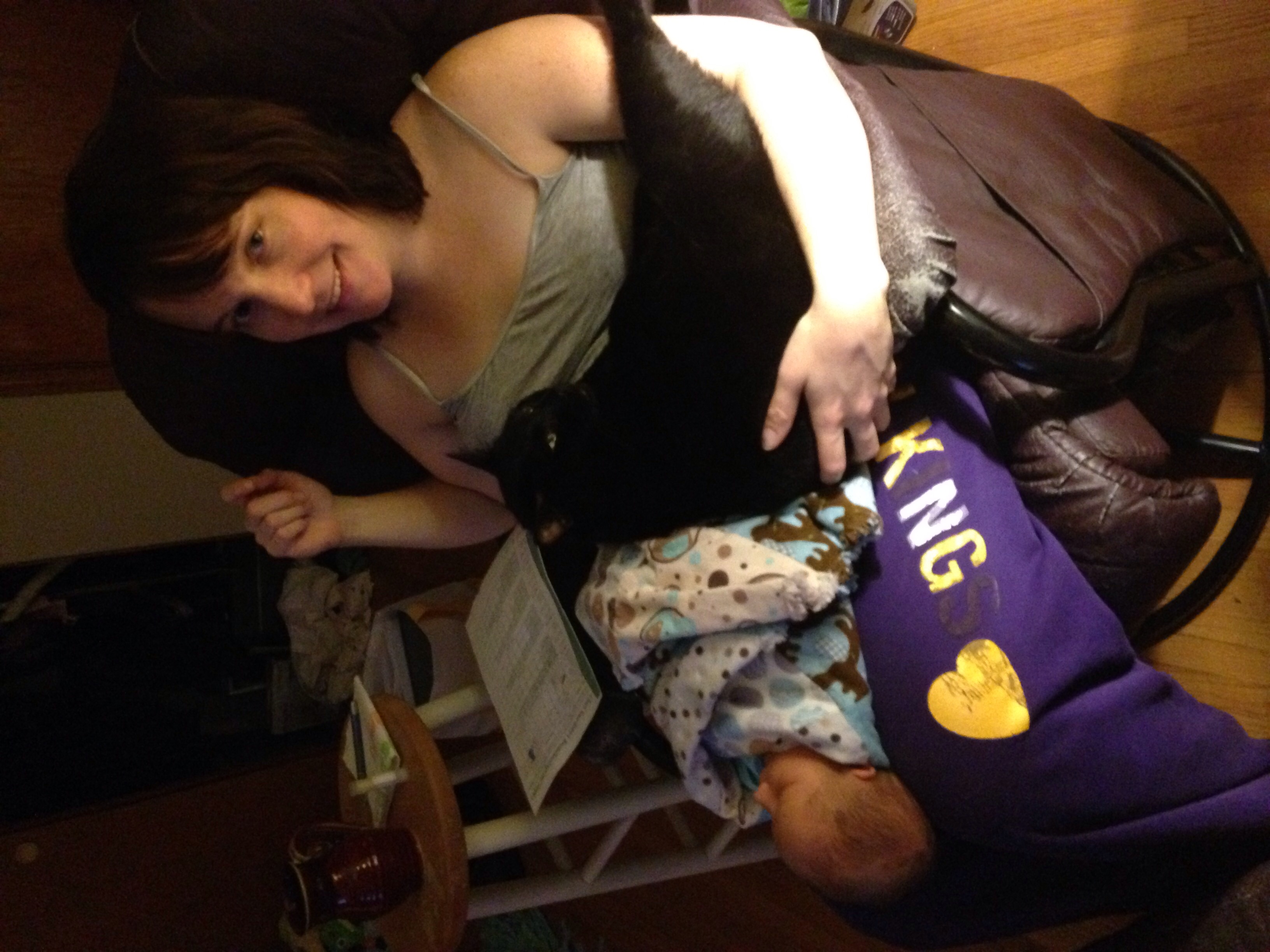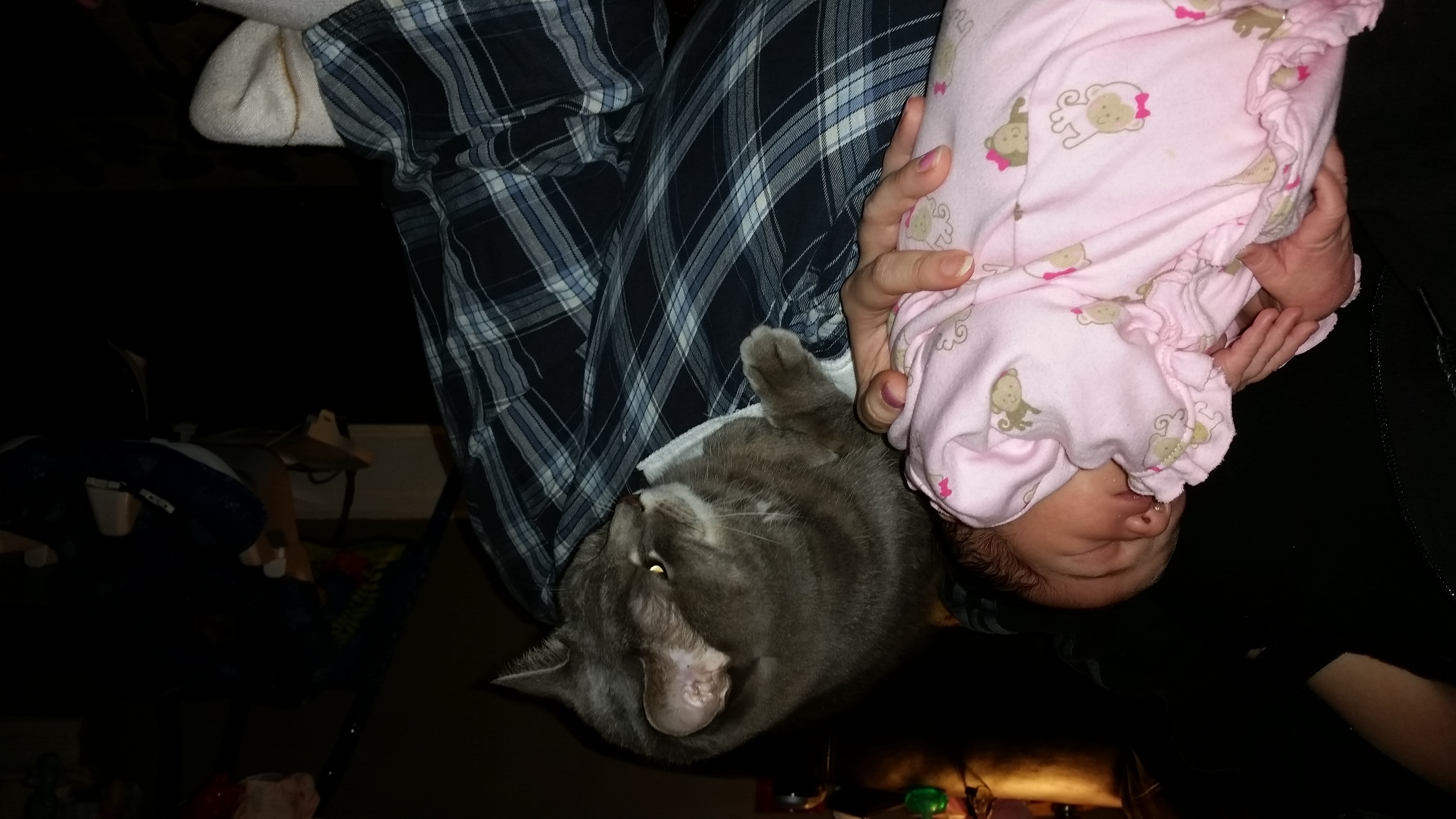 • I was finally able to get a pic of one of my cats and LO. It'll take time to get all of the cats on board with baby, but they're adjusting just fine so far. (and no matter what I do, the damn picture is upside down)