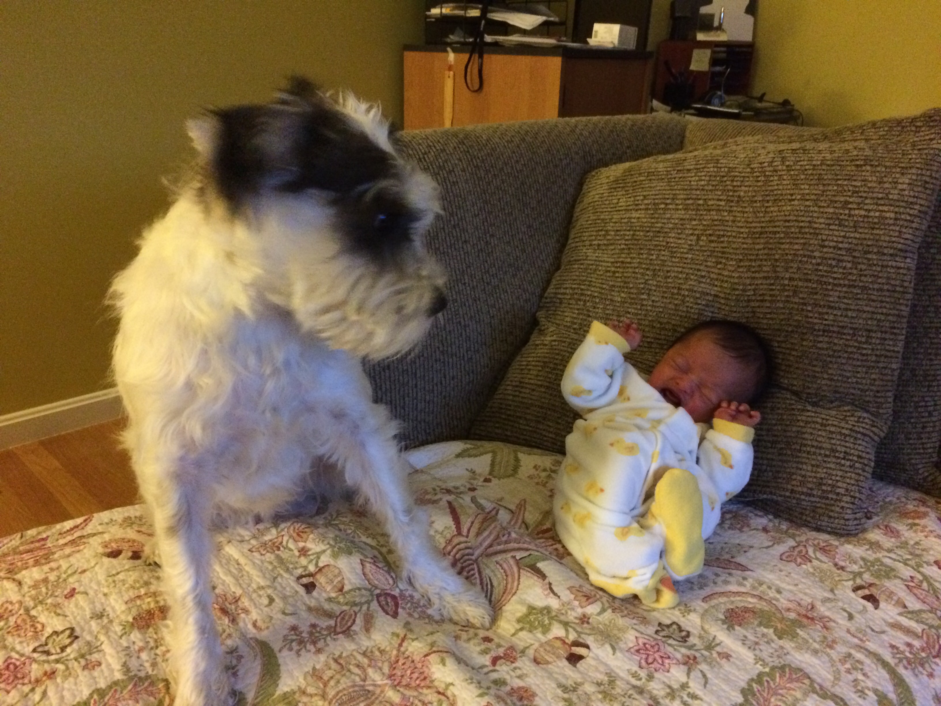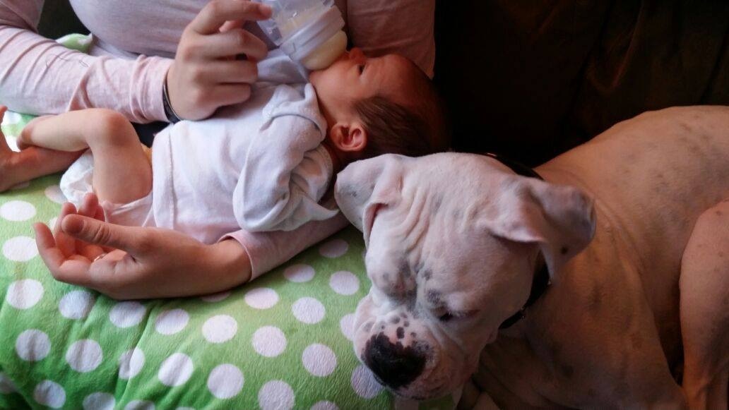 • My two yearold boxer is adjusting very well. She has been very motherly to the baby since the day we came home. She runs to him with the slightest noise he makes. And heaven forbid we leave the house with baby. When we get home from an outing, Zoey runs up to us to make sure we brought him home with us.