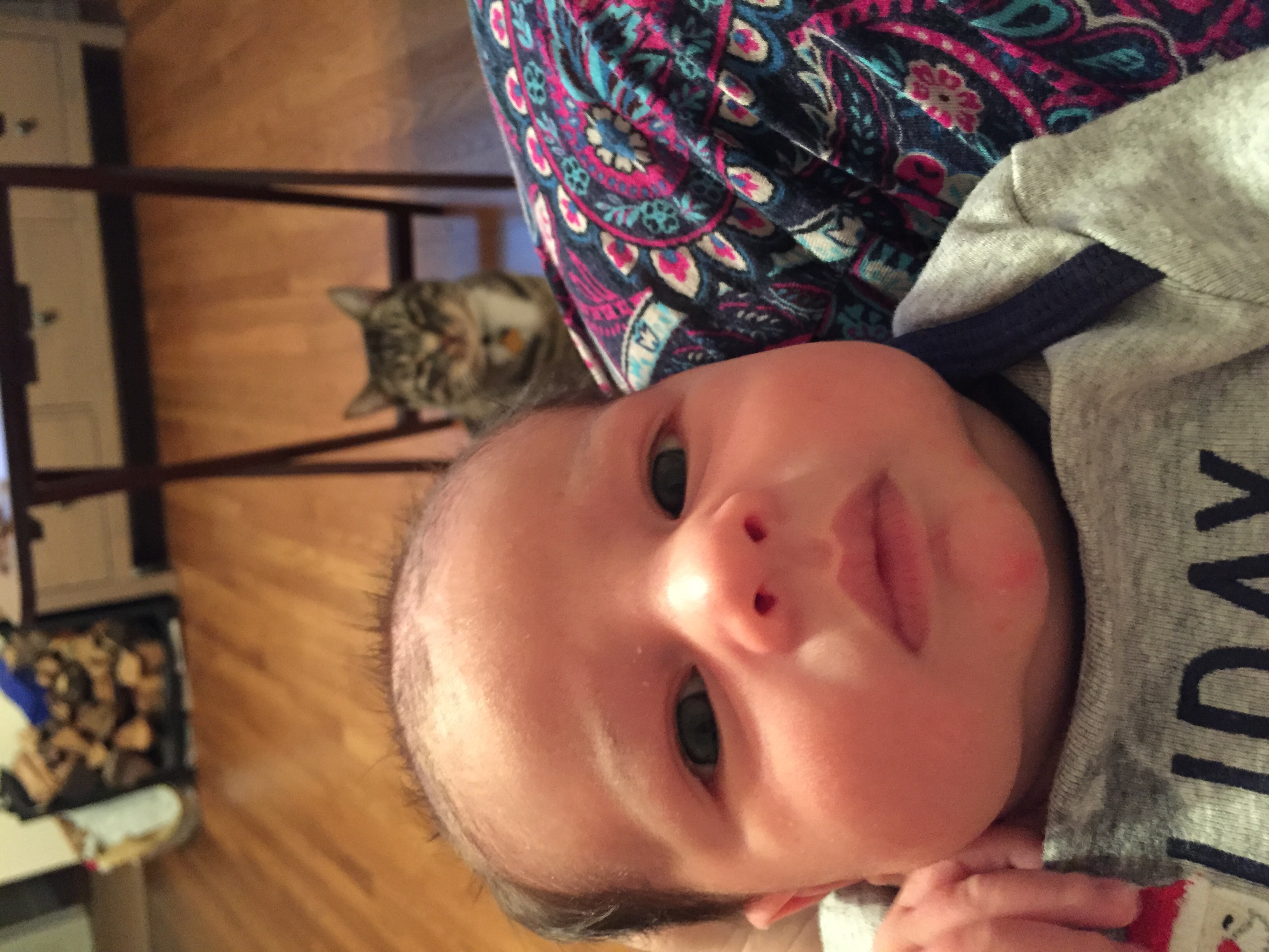 • My cat is super annoying, in a loving way. She always wants to sniff her or just look at her. If I'm holding her she tries to go on my shoulders and watch from there. Baby has a bit of a rash on her face so I'm worried she may have a cat allergy, I have an appointment to talk to the Dr today about it!