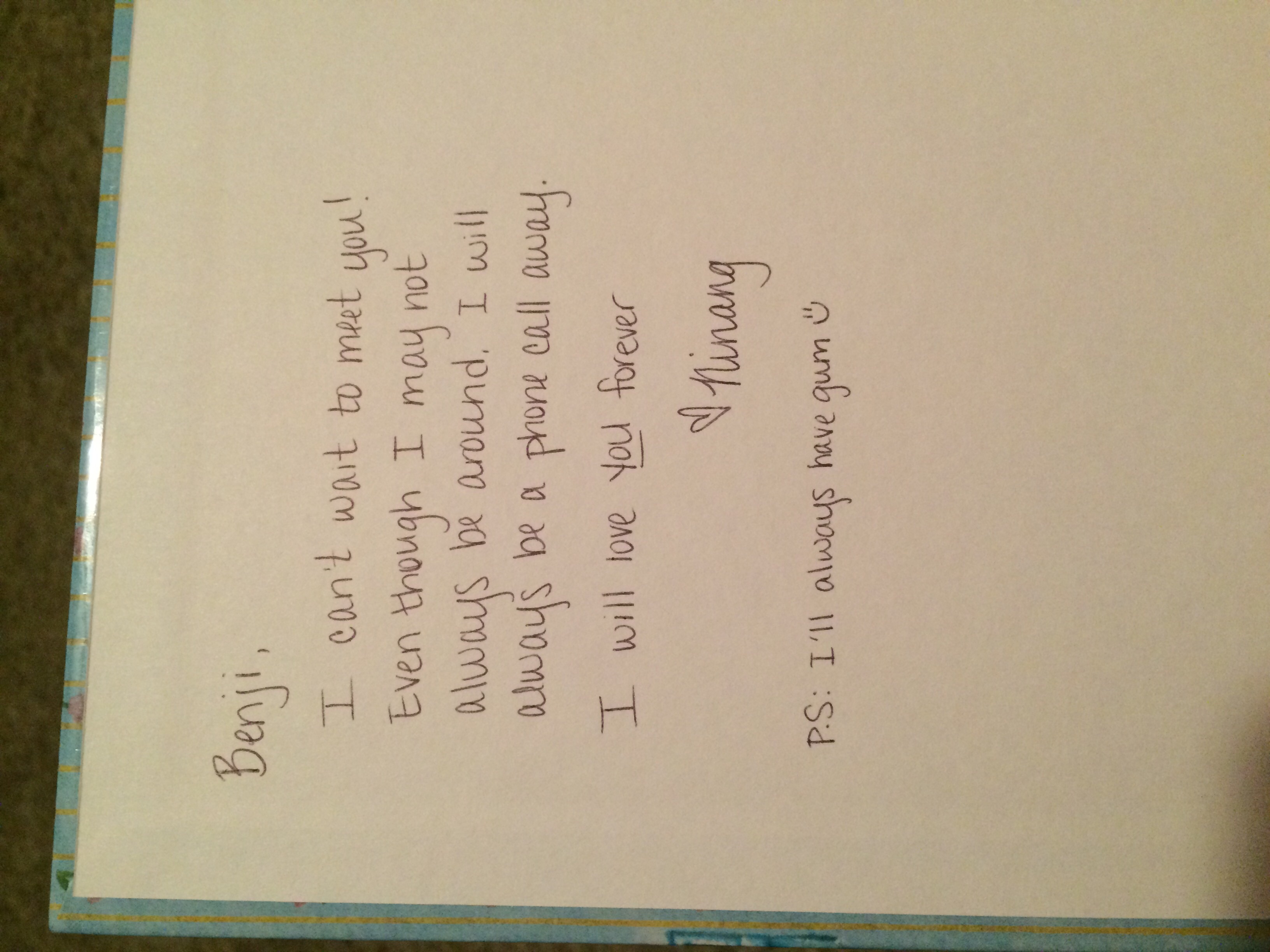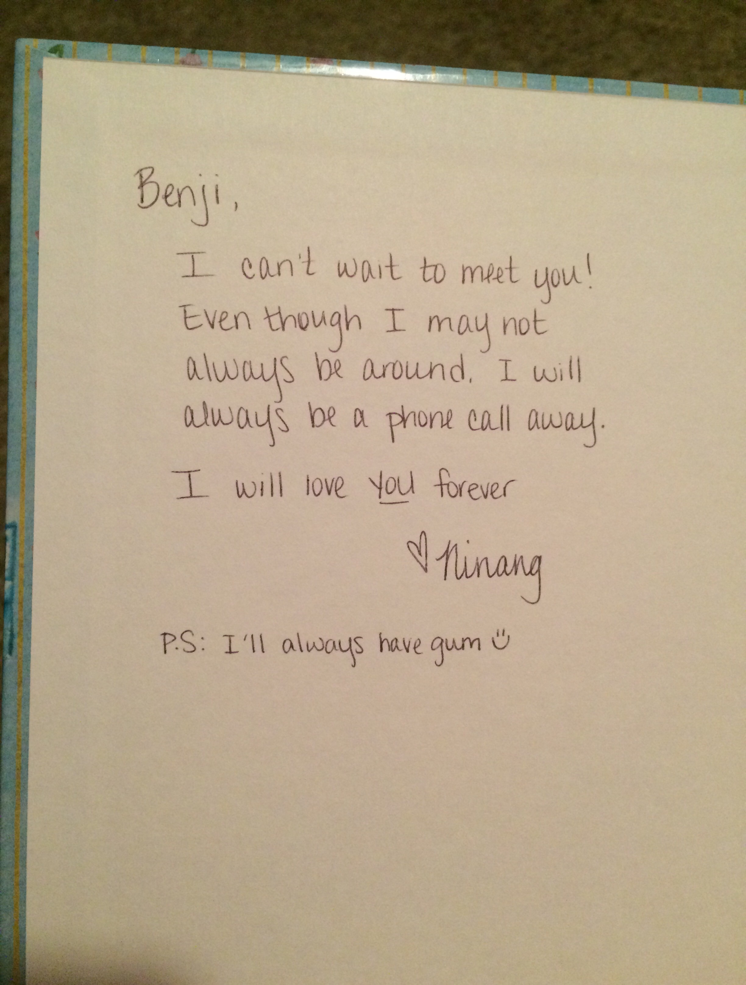 At the funeral, we saw my SIL who will be our son's Godmother (or Ninang, because H is Filipino). She won't be able to come to our shower, so she gave us her gift today. It is so sweet, I'm just going to AW it here, including the inscription in the book.
