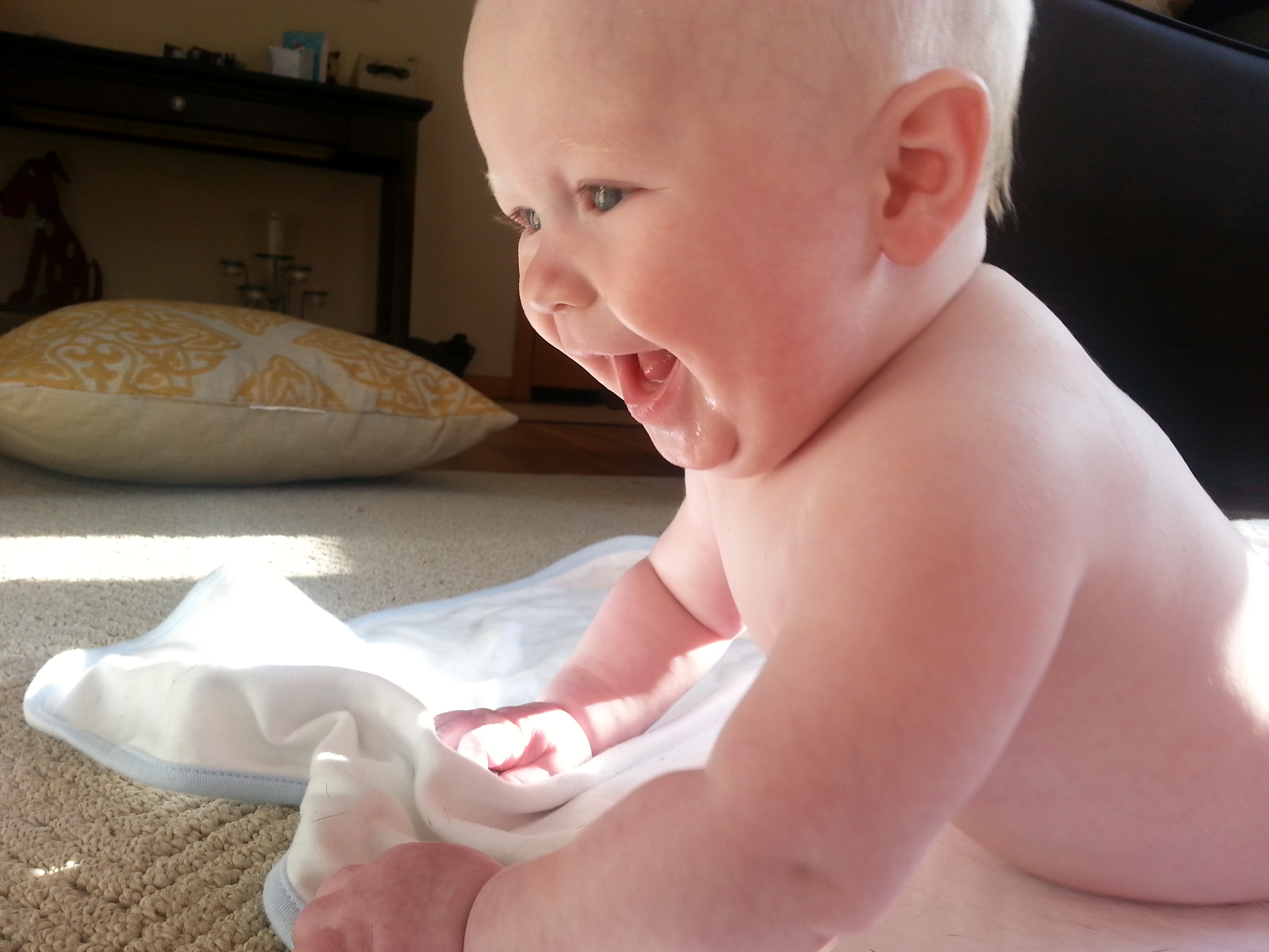 Zoe is almost 15 lbs. Last night she had her first giggles, at the dog! I still lurk here a lot and read many threads, for both amusement and learning opportunities.