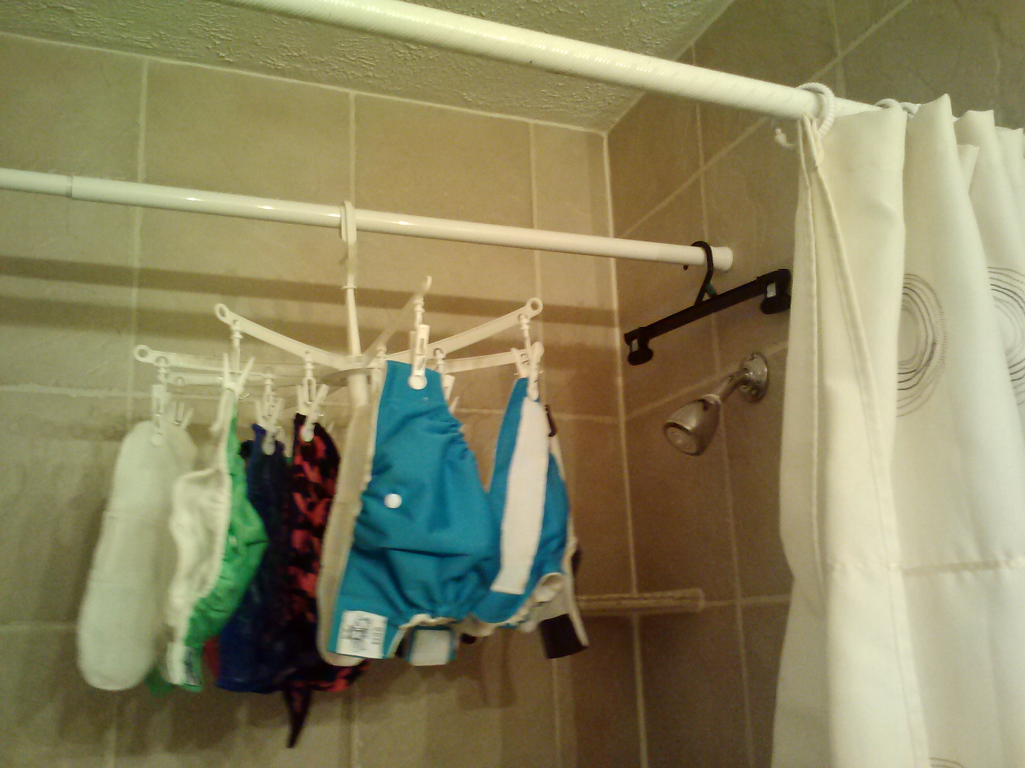 • I dump out the water in my pail liners and hang on an octopus hanging thing from a second shower curtain rod I installed over my tub above the shower (since it's above the shower it's out of the way and doesn't interfere with showering - sometimes I do stand on the edge of the tub but since mine is wider it's nbd). I check my pail liner and covers after a couple hours and if not dry I rotate them (turn pail liner inside out from how it was hanging) Diapers wash better when open so just fasten laundry tabs (don't need to undo rise snaps) and toss into wet bag or pail. If you roll a poopy one up while out and about, just open before putting in pail. I don't use AIOs so no experience/advice there.