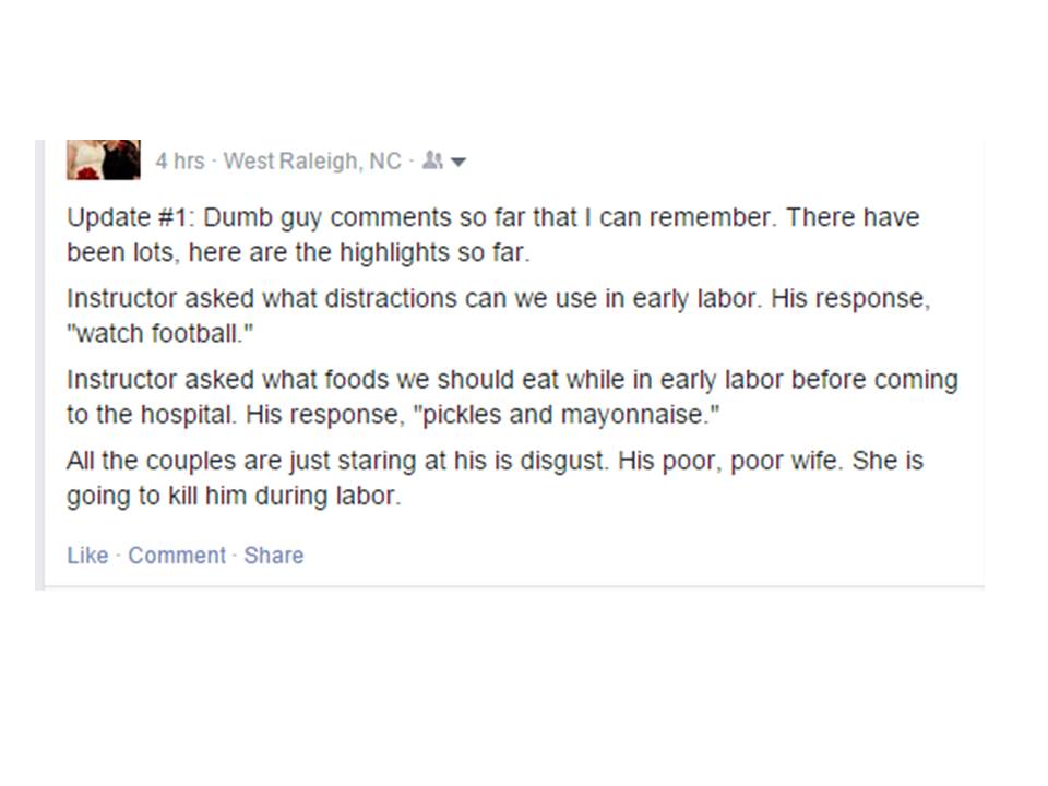 I'm posting and running. We are in birth class today and THAT guy is in here with us. He is making the most ridiculous comments and giving stupid answers.
