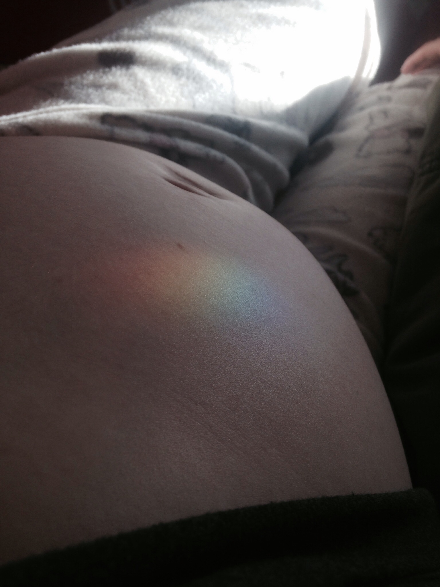I have not posted any bump pictures yet but thought this was nice to share. Was sat on the couch this morning with H and took a photo with his hand on my bump, when i viewed the photo back again there was a rainbow on my tummy