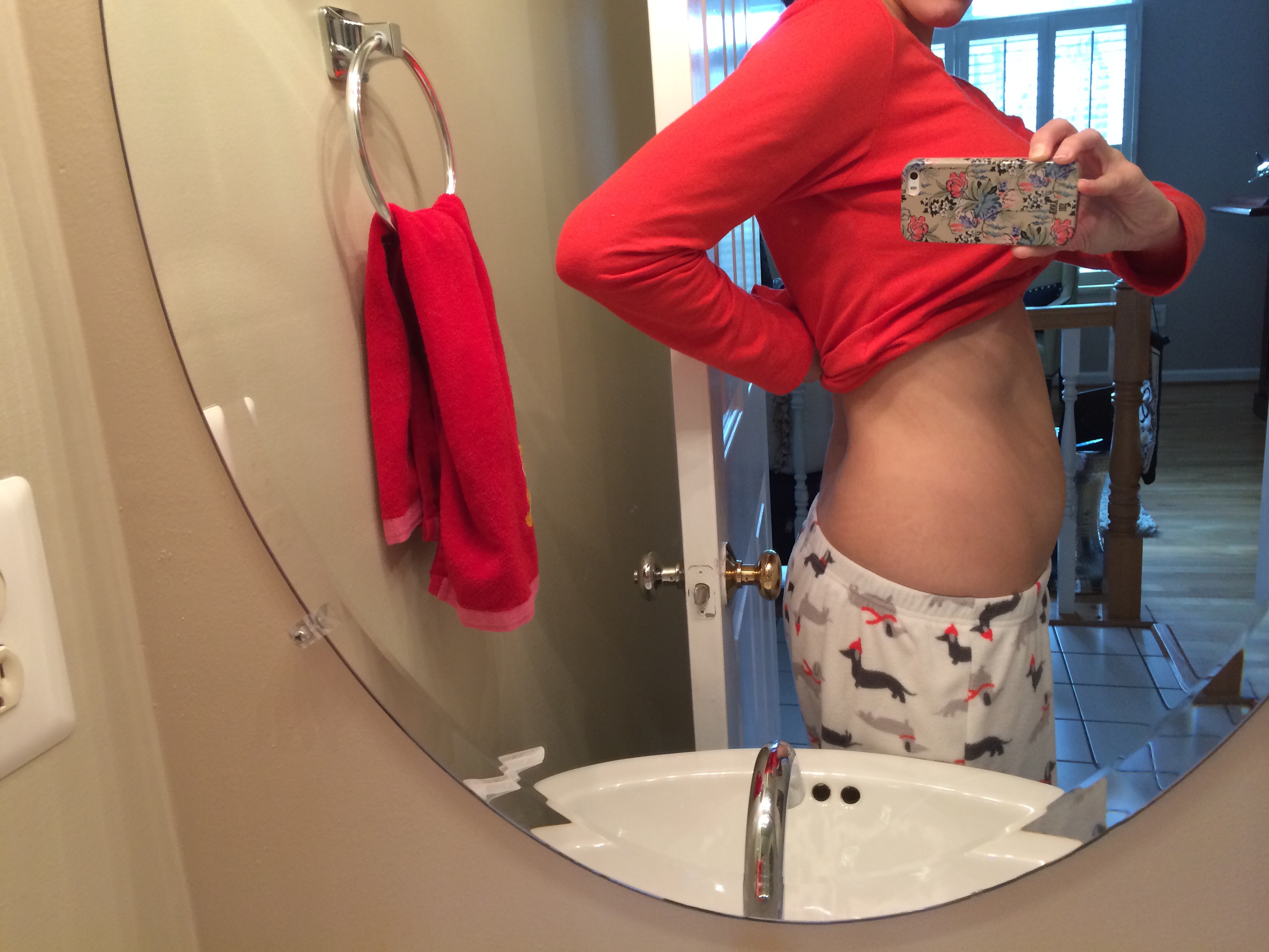 This is my first week participating. I am 17 weeks tomorrow this is from today. Excuse the work bathroom. I am bigger to begin but usually don't have a belly like this so I'm definitely starting to show and round out at least I hope it looks that way