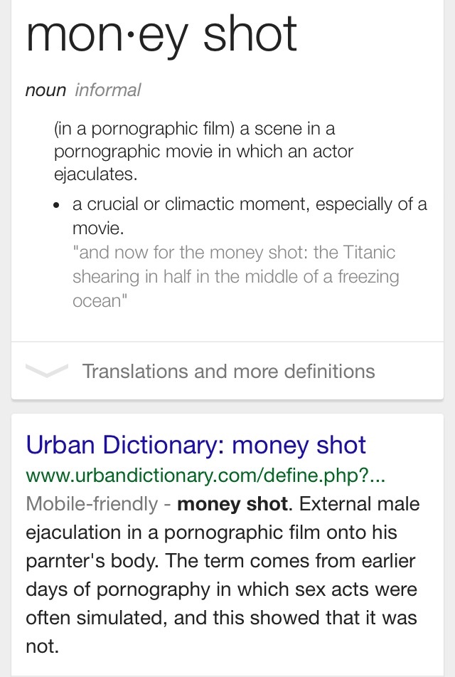• @PrimRoseMama‌ -I didn't mean to offend you, honestly. I just feel like the outrage level is a bit high for the perceived offense. @tinktink20‌ already clarified that there is more than one definition of "money shot" and can be googled easily. I don't think it's fair to assume someone meant to bring porno references into the conversation.