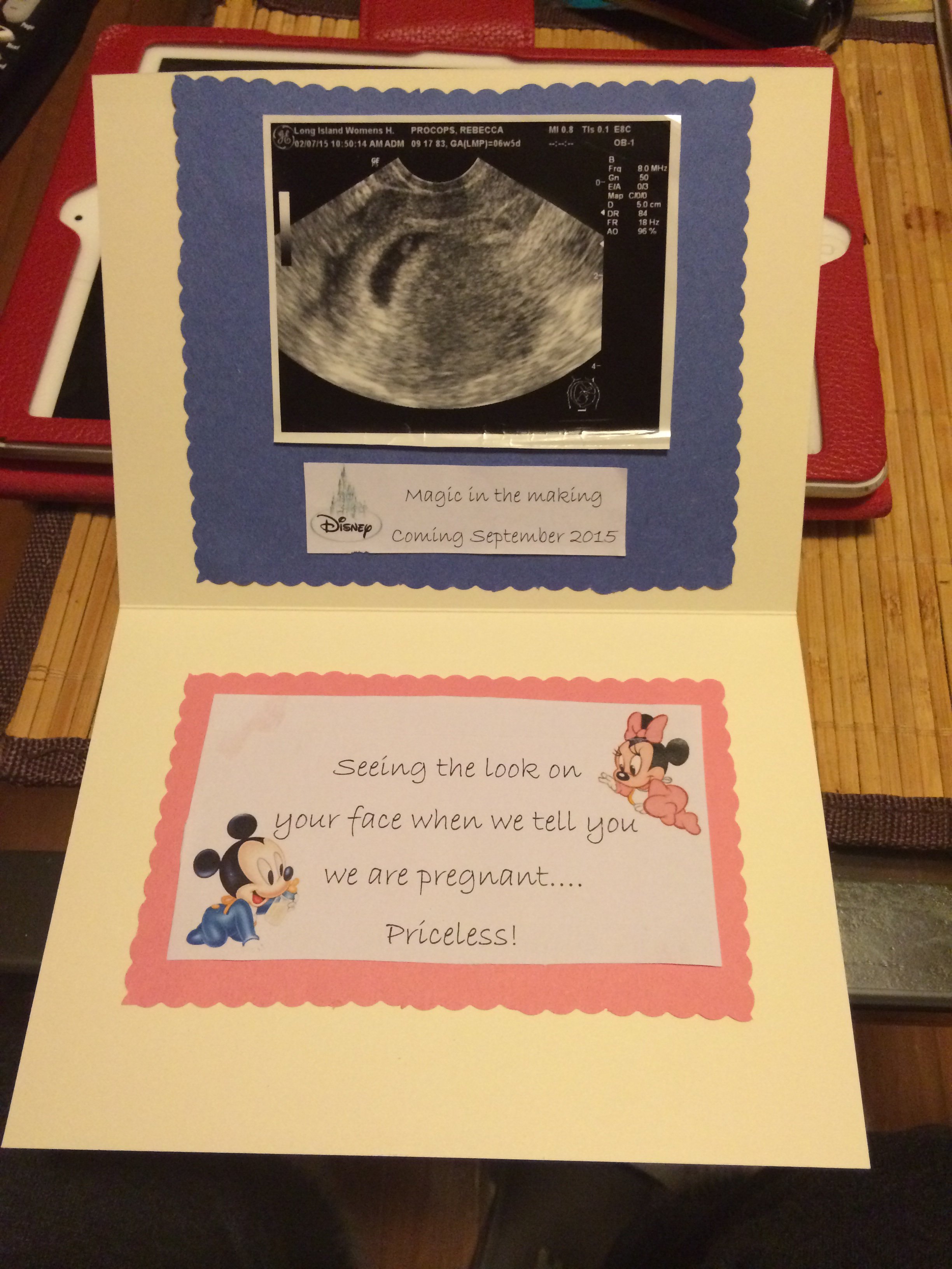 We aren't announcing on FB for some time now.. Not ready to go public! But we are going to Disney next week with my family and his parents are meeting us for a night so we will give them these! Only difference is I have an updated US picture with a bigger baby!! :-) :x