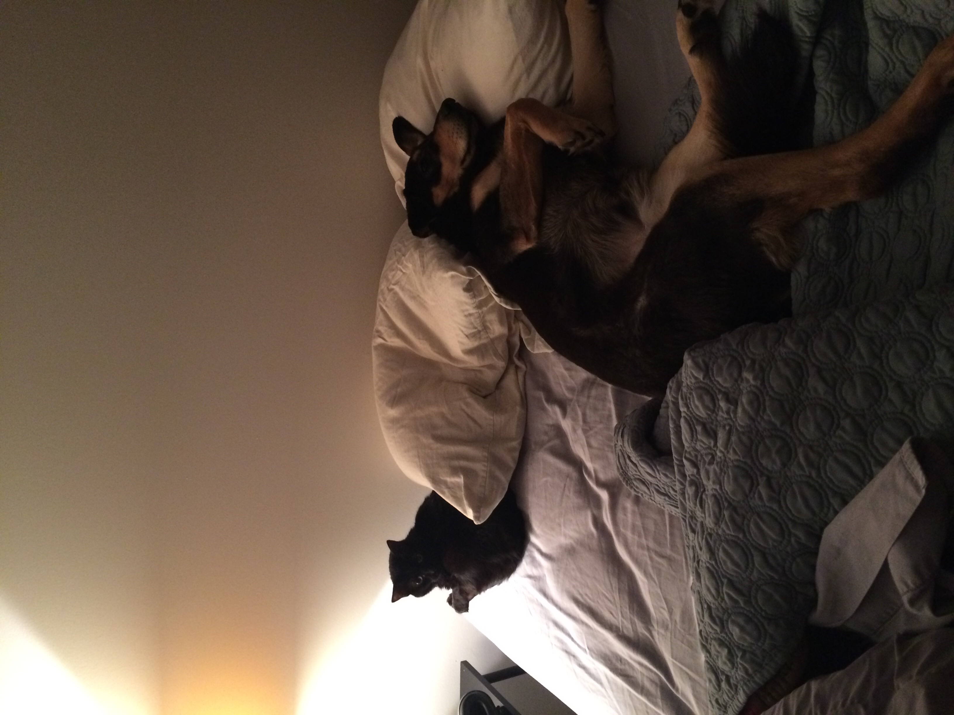 My cat has taken to sleeping between my legs, which he never did for his first 5 years with us. It's cute but super annoying because then I have to move him to move to sleeping on my side or switch positions.