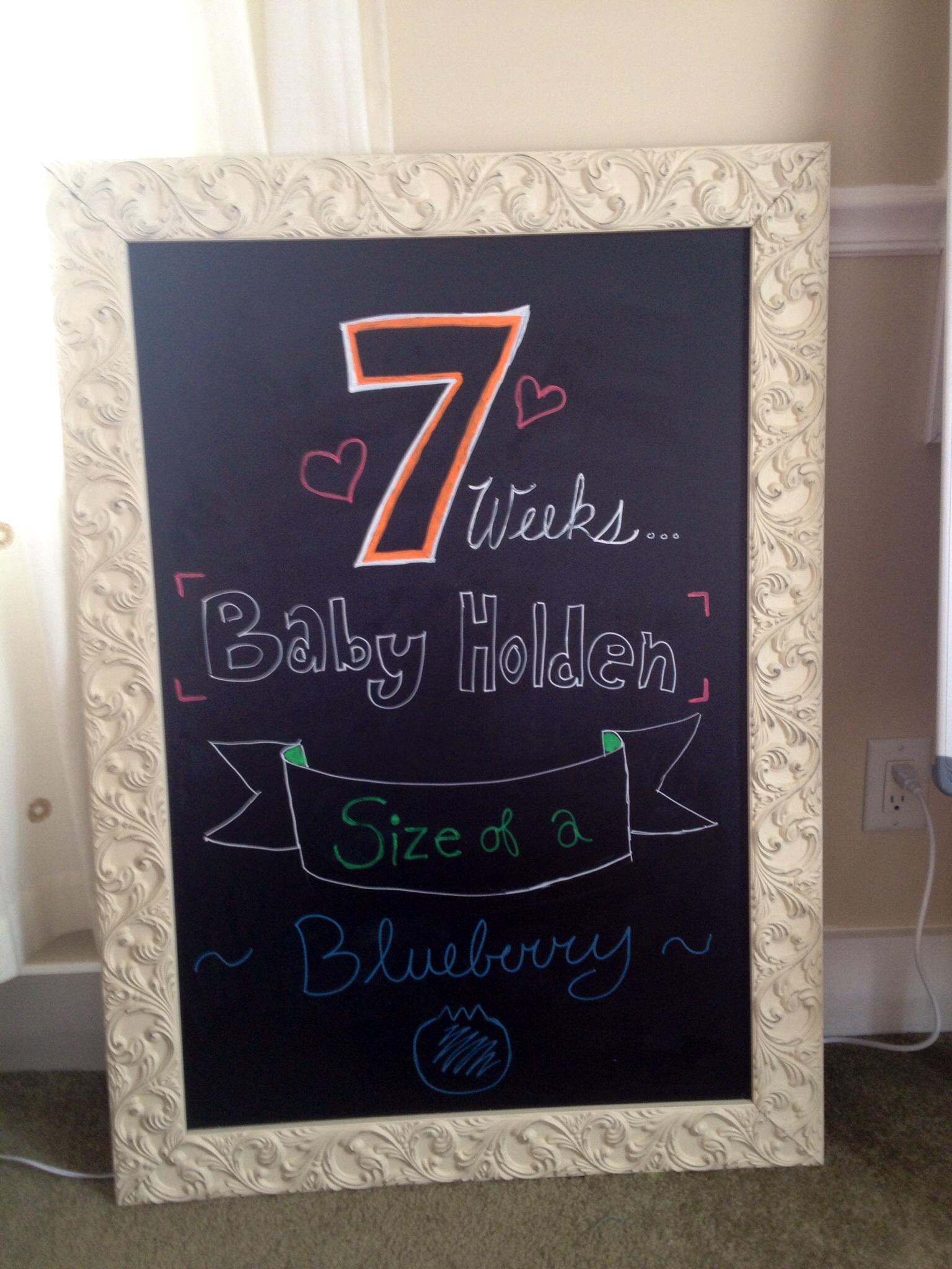I love it! I'm doing this too but I love the frame on your chalkboard so much better! Where did you find it!? I searched at Michaels, Hobby Lobby, and Homegoods...I could only find one that was tall enough with a plain brown frame. Isn't it amazing, our babies are the size of blueberries!