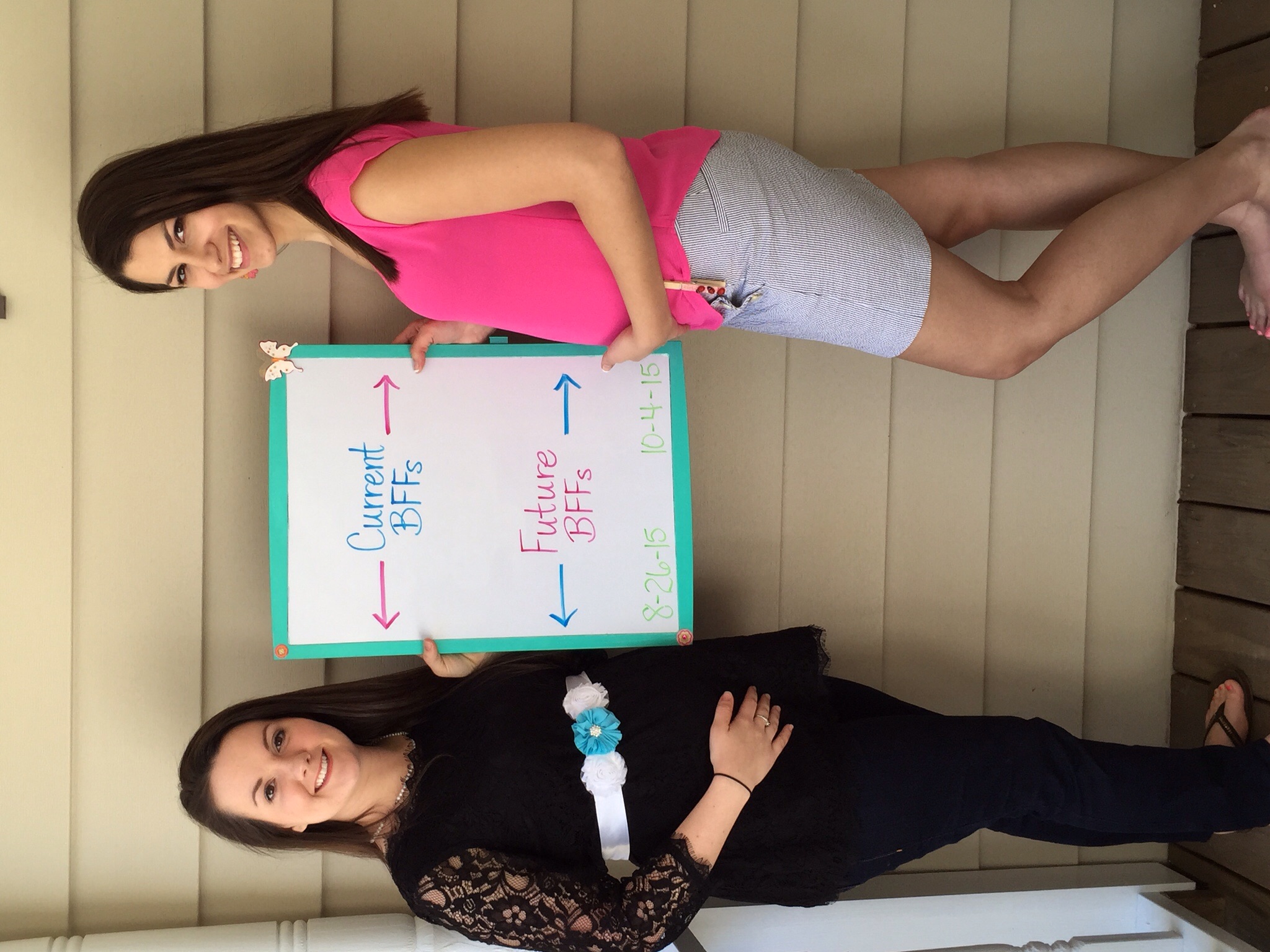 Here's mine! Taken earlier today at my best friend's (left) gender reveal party! (My pink shirt was wrong haha!) I had to stuff my face/chug lemonade to achieve that blump though!