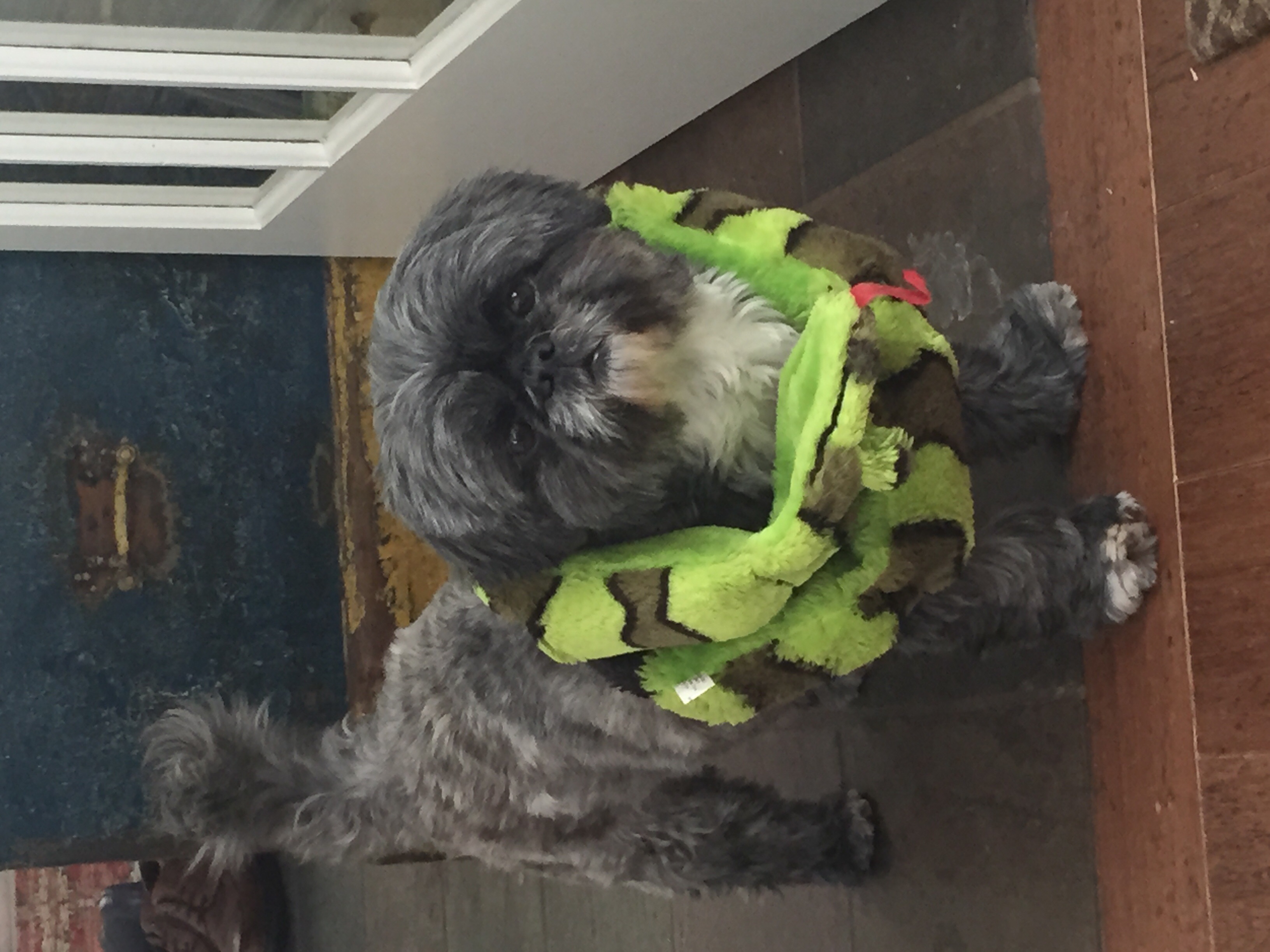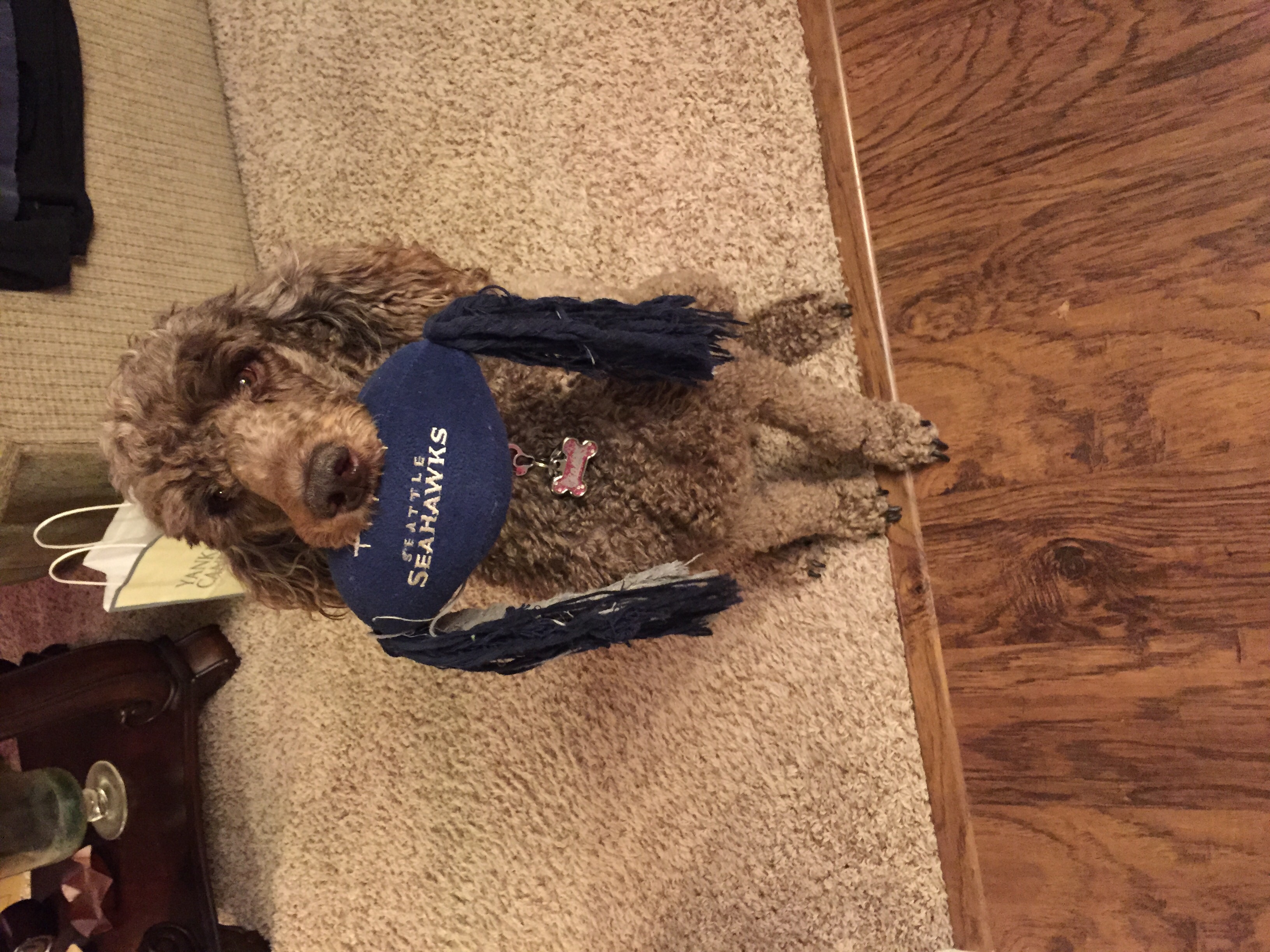 • Our poodle with her fav toy at the moment! Go Hawks!