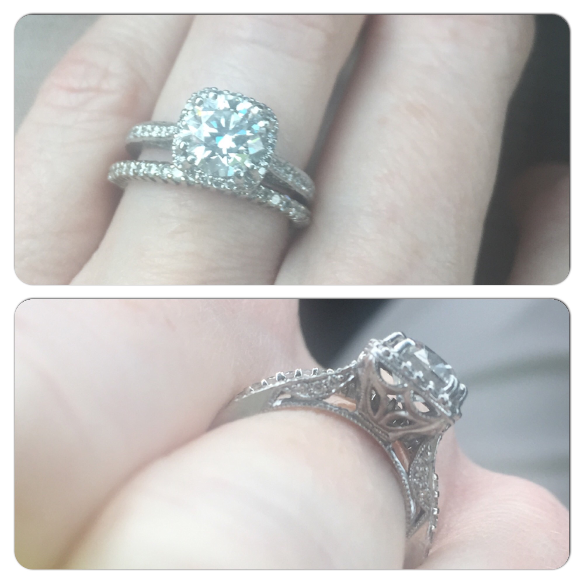 Engaged May 2012, Married in August 2012. We'll have been married for 3 years when our new LO makes an appearance :-). The setting is Tacori, after we got married he went on deployment right away and when he came back he surprised me with it.
